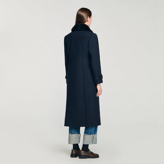 Sandro Toggle Button Coat with Shearling Collar in Navy, Size 38