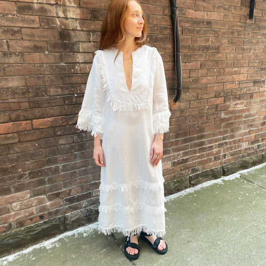Fil De Vie "Thalia" White Linen Kaftan with Fringe Trim, size XS ** as is **