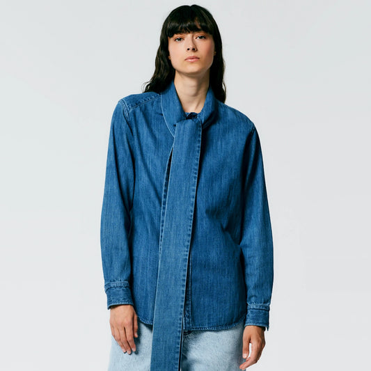 Tibi Lightweight Stone Washed Tie Neck Slim Men's Shirt in Blue, size Medium