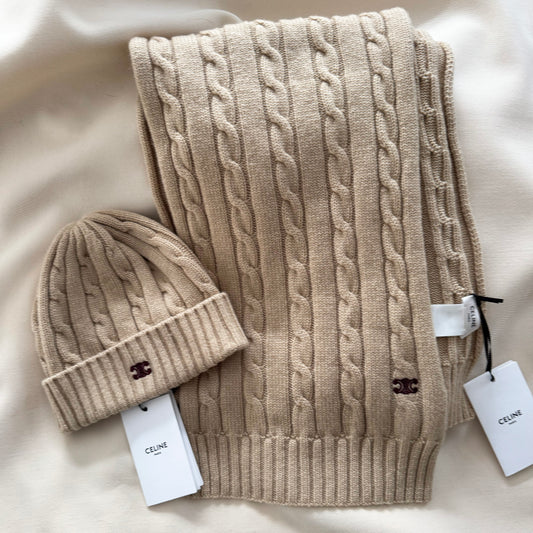 Celine Cable Knit Triomphe Cashmere Hat and Scarf Set in Camel