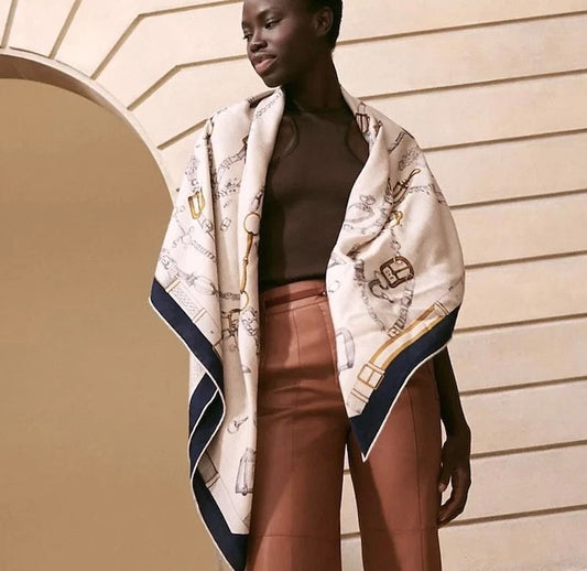 Hermes Cashmere/Silk "Les Chevaux Dechaines" Shawl 140 in Marine/Naturel/Gris