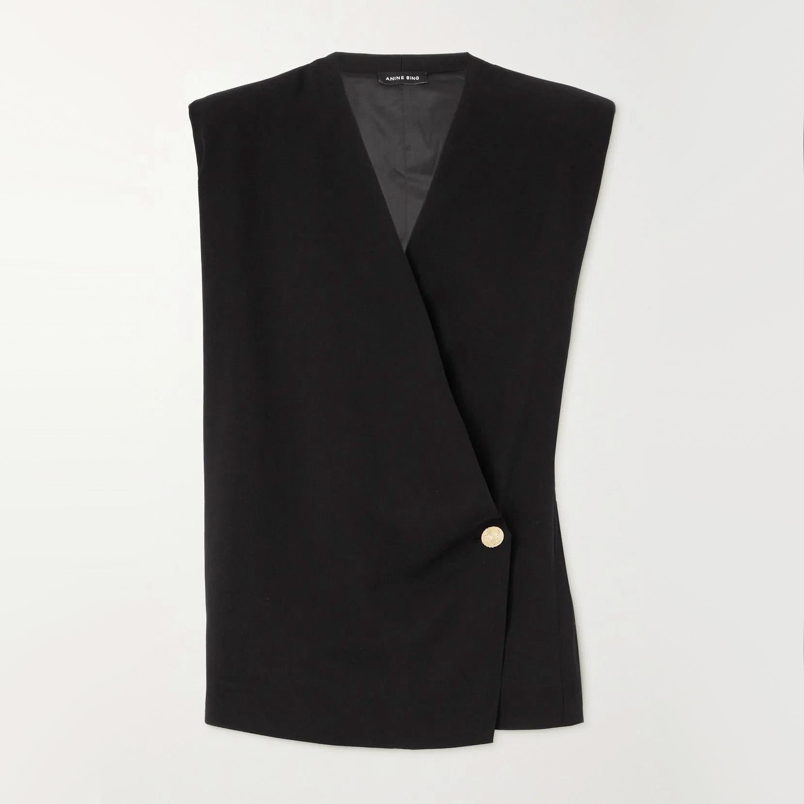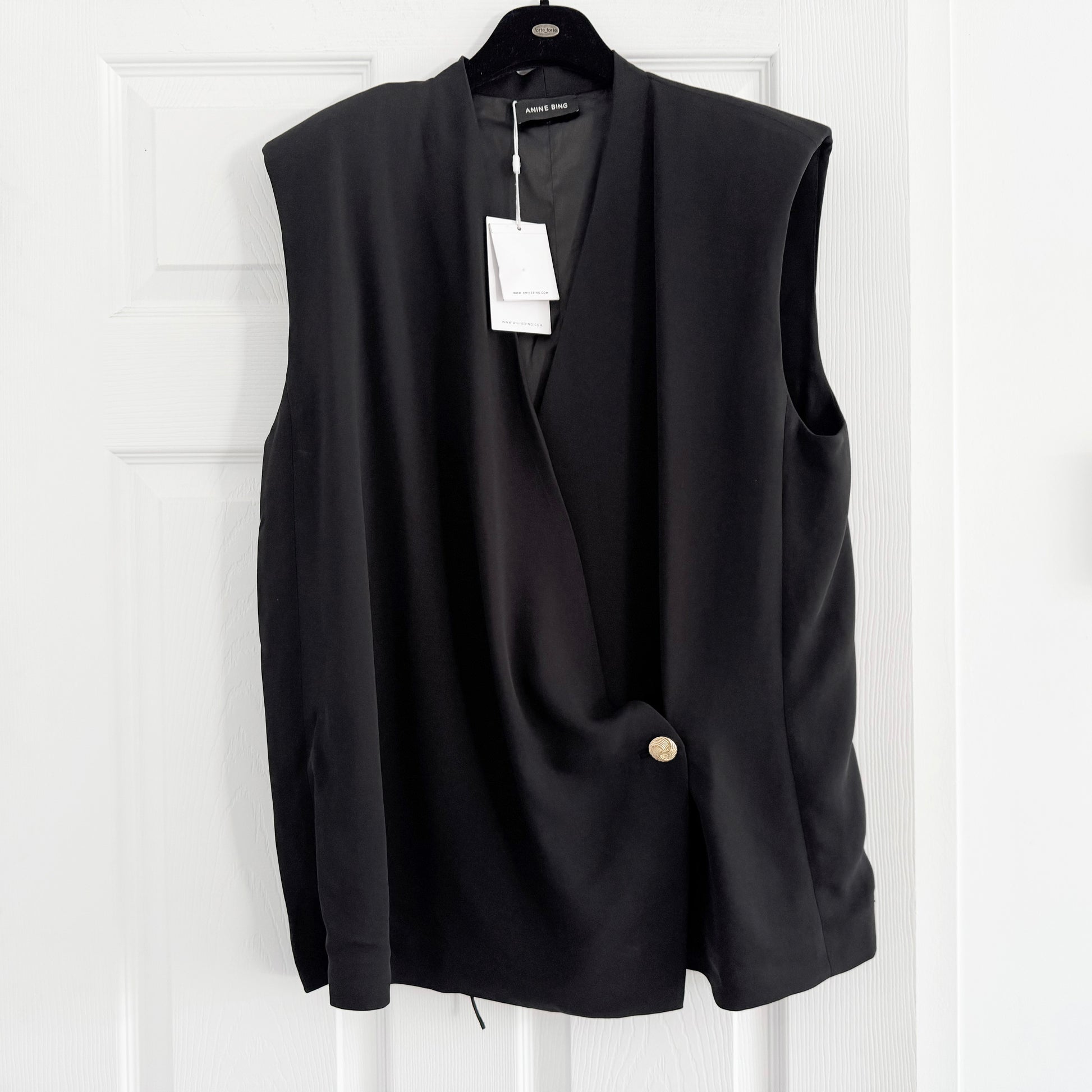 Anine Bing "Venice" Vest in Black, size Medium. Fits true to size. Brand new with tags! A cross between a vest and a top, this piece is done in a lovely fluid crepe, with lightly padded shoulders that gives it almost like a bit of a Yves Saint Laurent take on femininity? Sort of 80's but sort of softer? Hard to describe, but very cool. It has an asymmetric wrap-front that fastens with a gold-tone button (and a little hook so that it stays closed if you're wearing it alone). Pair with anything from a mini skirt, to pleated shorts to wide-leg pants or just black denim. 96% viscose, 4% spandex. Originally $450-500CAD, depending on where you shopped, and selling here for $185CAD!