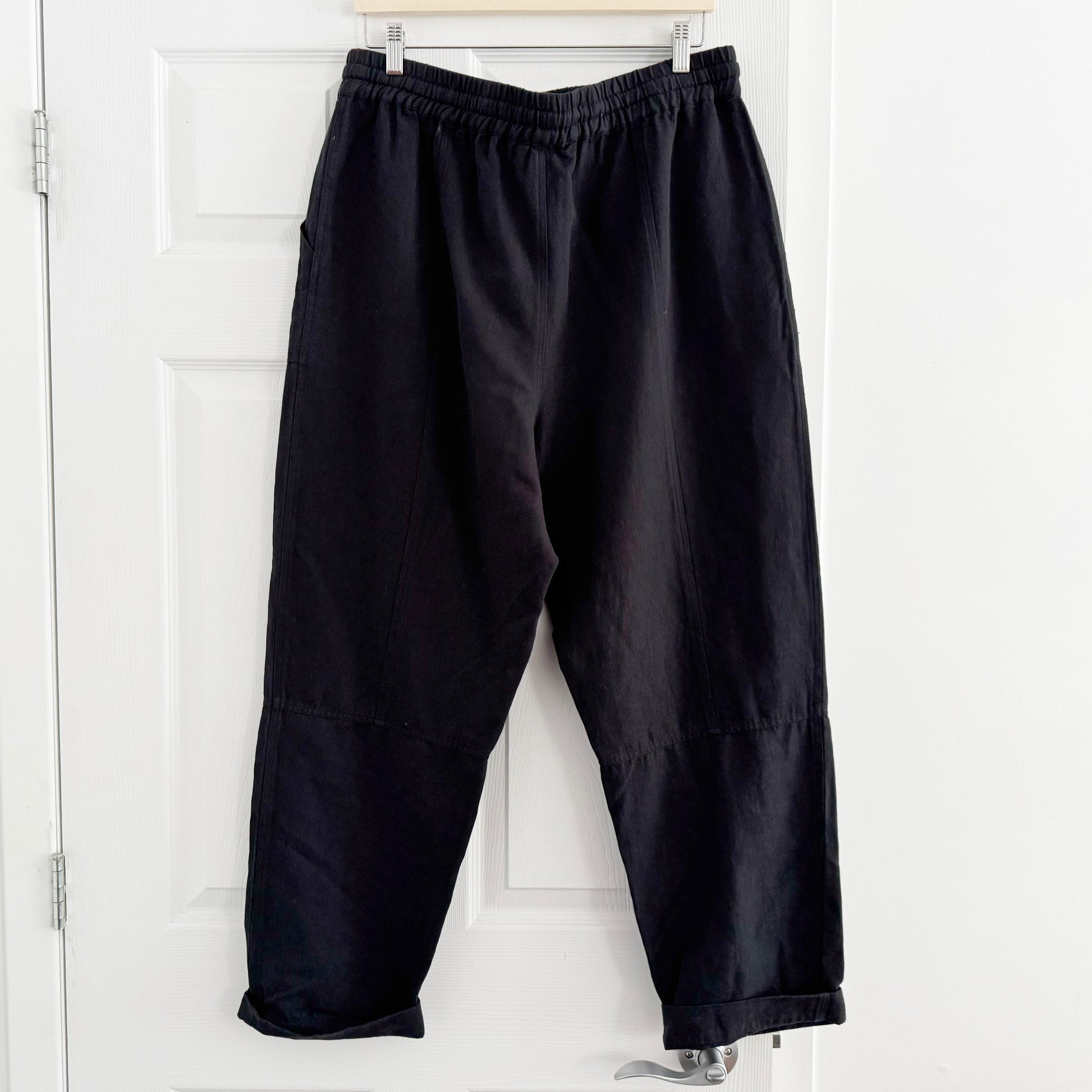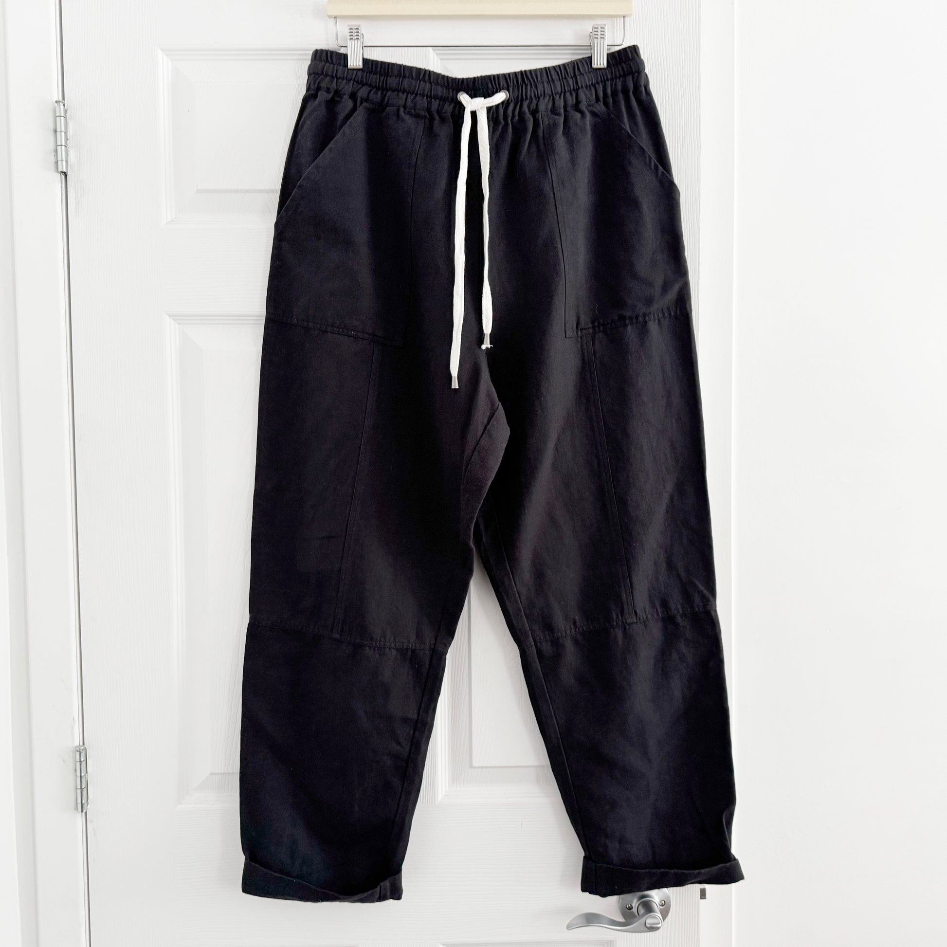 Apiece Apart Cotton/Linen "Surf" Pants in Black, size Large. Fits true to size. These pull-on linen and cotton blend pants have an elastic drawstring waist, roomy pockets, and a voluminous tapered leg. A step up front actual sweatpants, with all of the comfort - an awesome and easy everyday pant for transitional and warm temps. 60% linen, 40% cotton. In excellent condition. Originally $395CAD, and selling here for $165CAD!