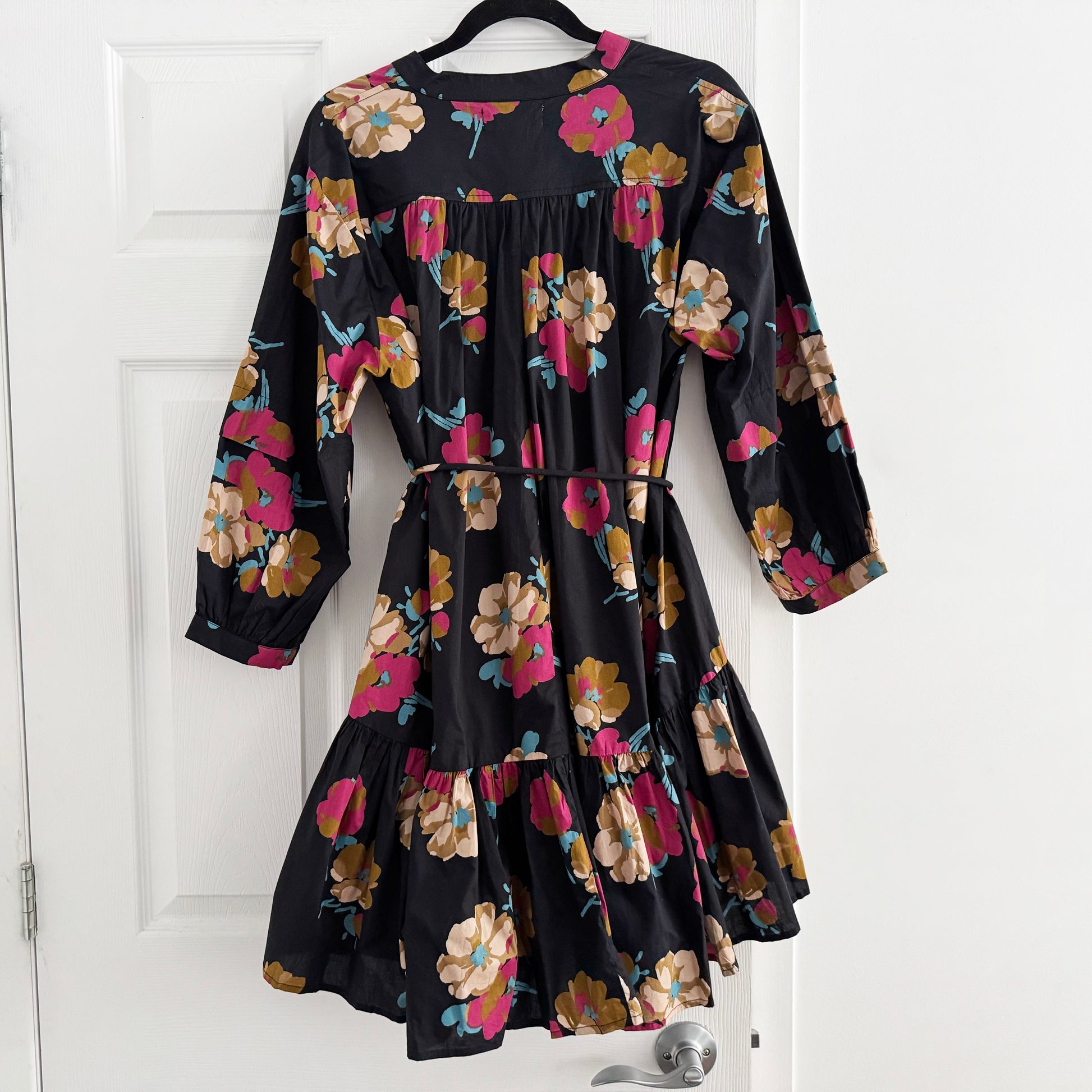 Apiece Apart "Lalla" Mini Dress in "Floating Floral", no size tag but fits like about a size XL? Such a pretty dress for transitional to warmer temps! I love how a darker floral works well with a variety of footwear from boots to sandals - that added versatility is a dream in both early fall and late Spring. Comes with a little matching tie belt. 34 inches in length at the front, and 2 inches longer at the back. 24.5 inches armpit to armpit. 100% cotton. In excellent condition aside from the missing size tag. Originally $510CAD, and selling here for $195CAD!