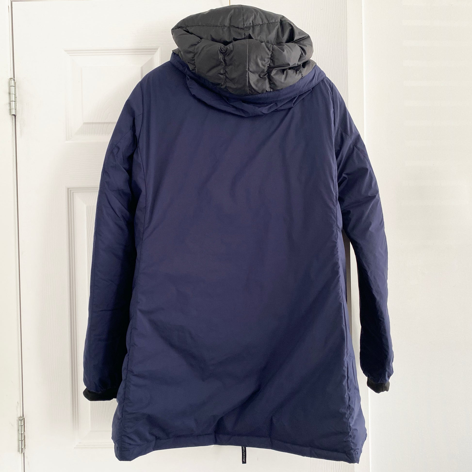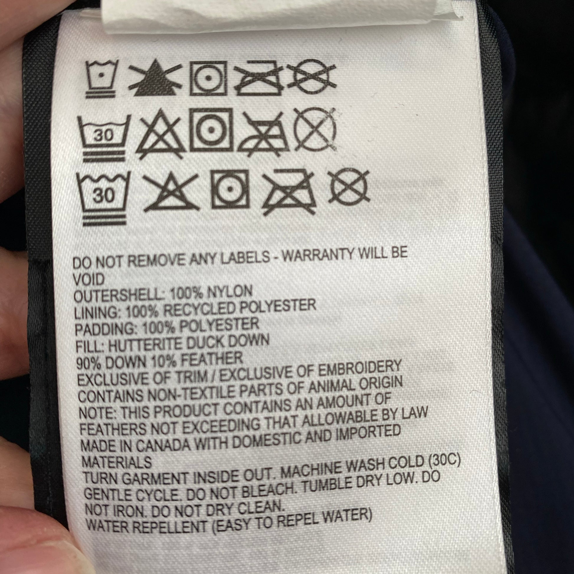 Canada Goose "Camp" Matte Hooded Down Jacket in Navy, size XL (fits slim to size - more like what a normal person might expect from a M/L? Depends on how you want it to fit, but this seller usually wears about a US size 8 or so). Super practical for both travelling and driving - this lightweight, thigh-length, down-filled jacket packs into an inside pocket for packing (and can double as a pillow in pinch!). Warm, water-resistane and windproof but compressing to almost nothing, it's ideal for both city and country life. The full feature hood, stretch cuffs, and extra ripstop nylon shell provide further protection, helping to keep valuable body heat in. Temperature rating of 0°C / -15°C. It measures 22 inches armpit to armpit. 24 inches flat across at the hip. 31.5 inches in length. Feather-Light Ripstop (100% Nylon); Fill: 750 Fill Power Hutterite White Duck Down. Made in Canada. In excellent condition. Originally $750CAD, and selling here for $395CAD!