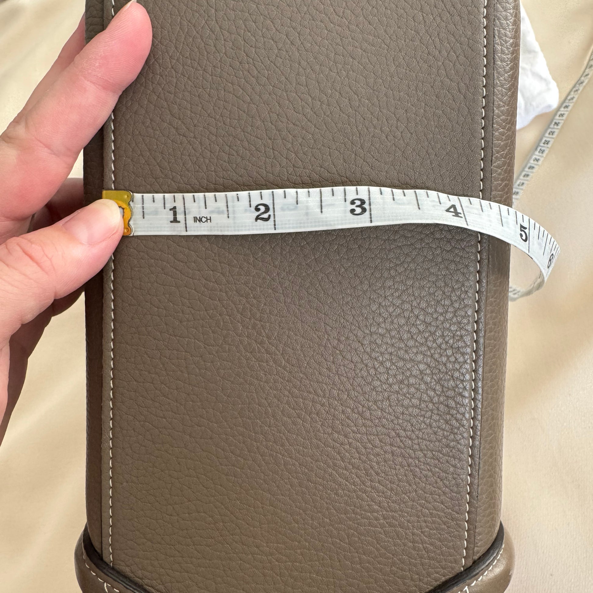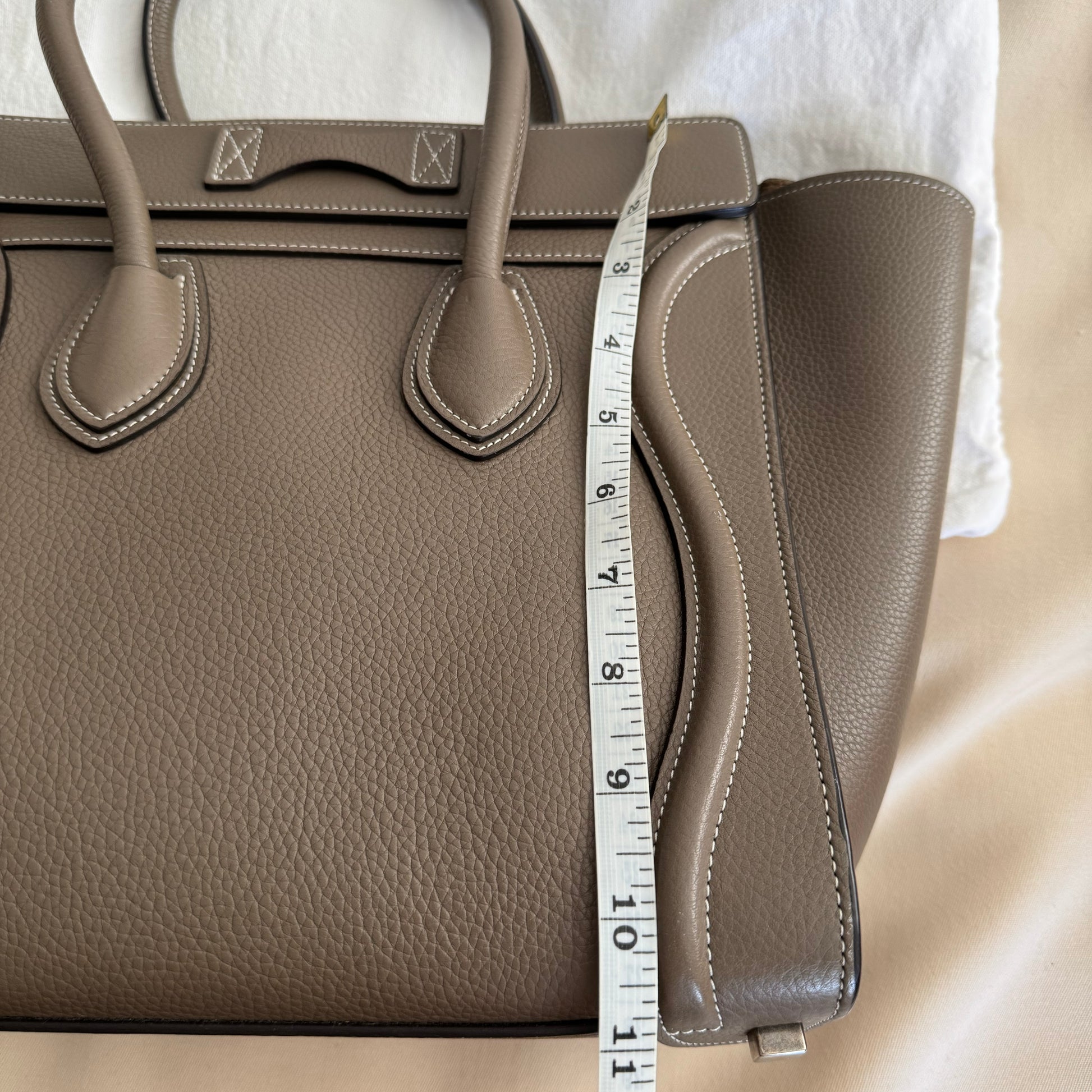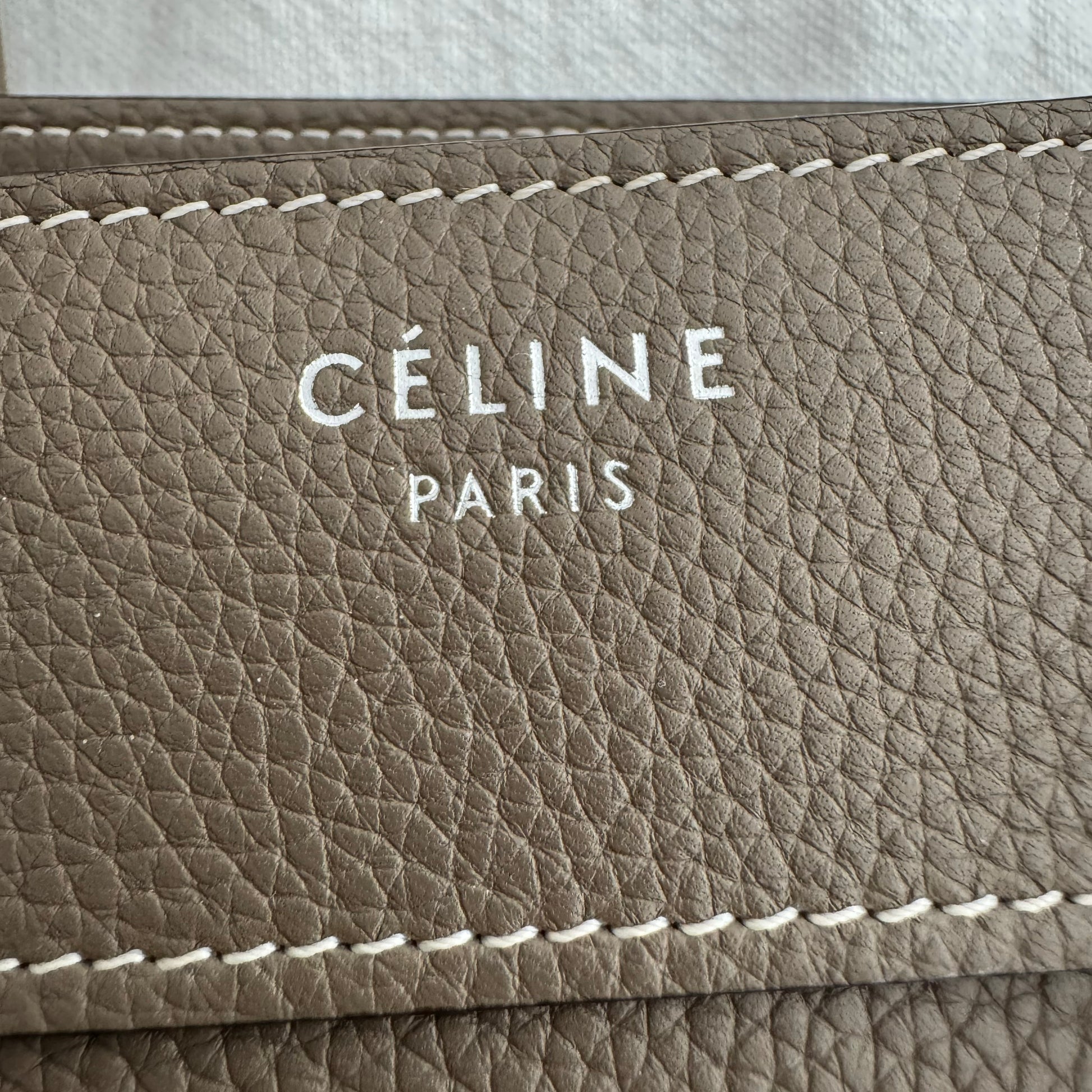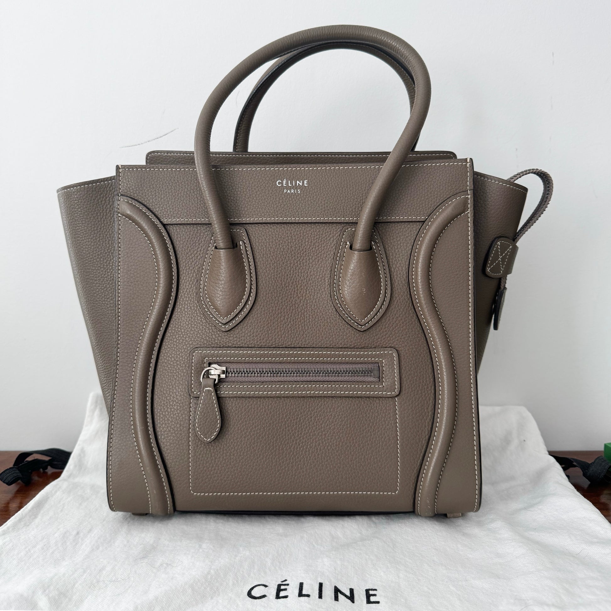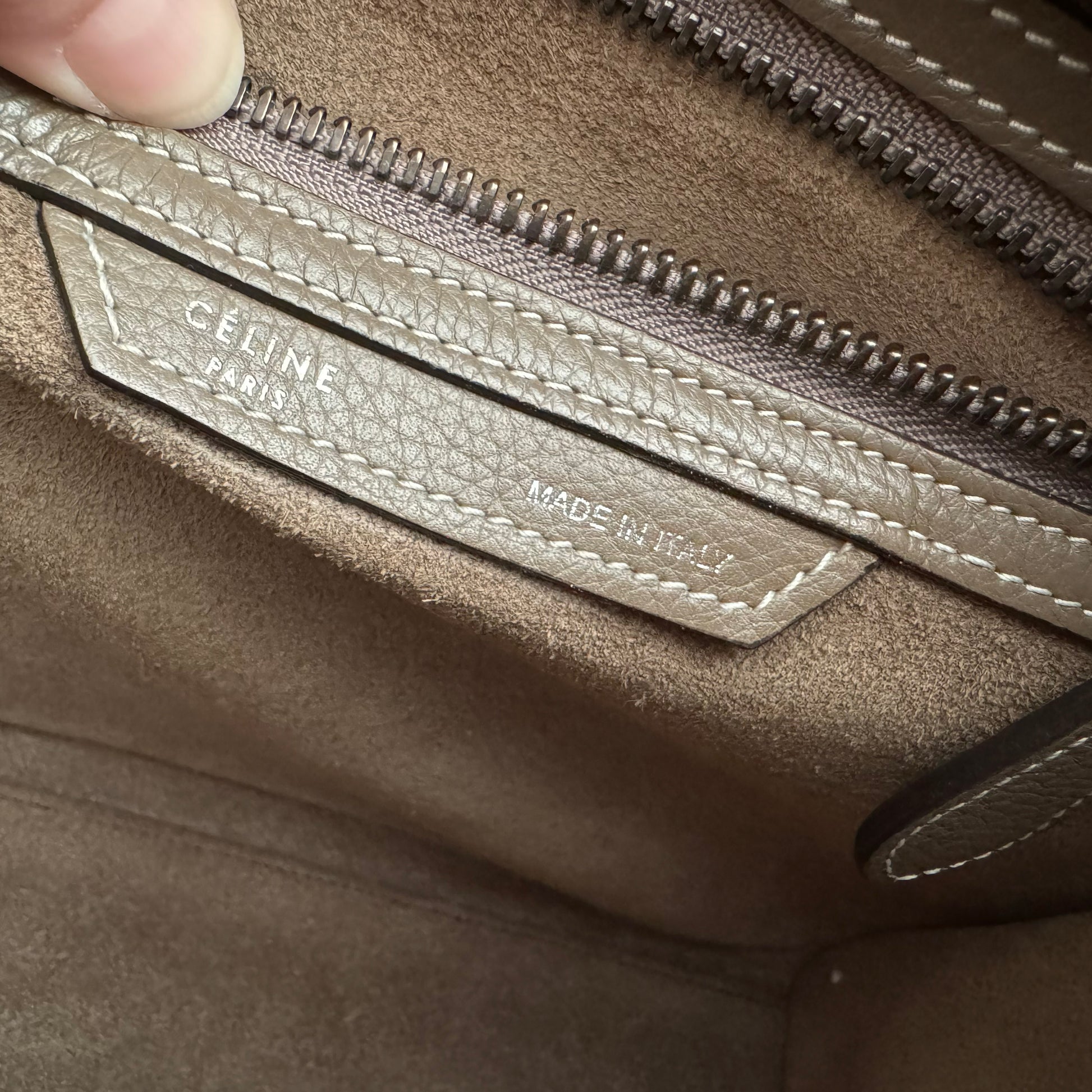 Celine Micro Luggage Bag in Taupe (Souris). An iconic (and beautiful!) style introduced in Phoebe Philo's era (this bag is dated for 2014). I LOVE this bag in this colour - works well for wear with anything - in any season! Zip closure at the top. Measures 10 inches x 10 inches x 4 inches, based on the structured square front and bottom, a little wider (14 inches) if you include the wider part at the sides. Lightly worn and in great condition. Comes with the original dustbag. Originally retailed for around $4000CAD, and selling here for $1995CAD!