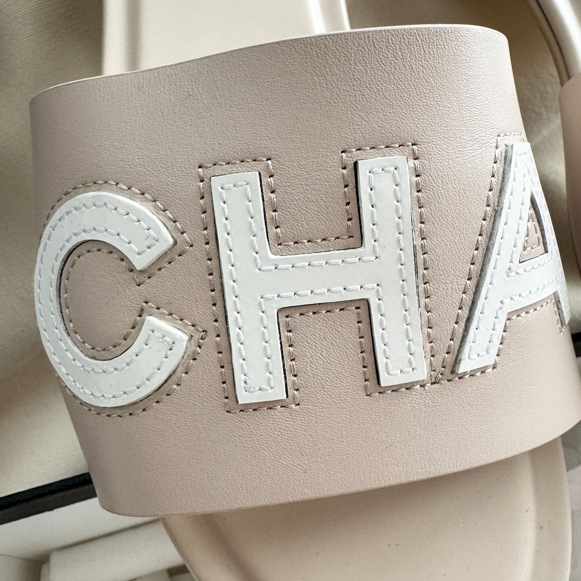 Chanel Flat Logo Slides in Blush/White, size 41C. Fits like a 10.5, and better for an average or average/wide foot - not a narrow foot. Absolutely stunning - the way the logo is a different inset into the supper gives them a beautiful texture. From the 2023 collection. Worn once, if you could even call it that! In basically pristine condition except for the most minor wear on the sole. Comes with original box. My client purchased them from the Chanel shop, and from my research they were originally $1300USD - selling here for $595CAD!