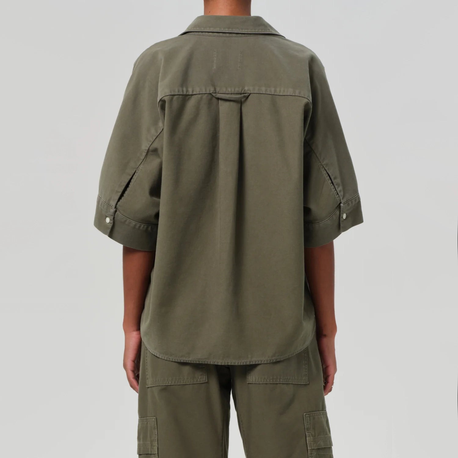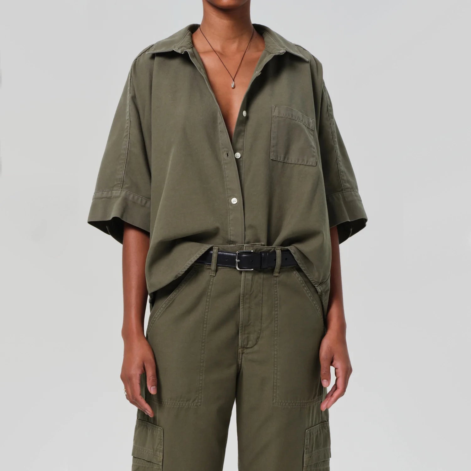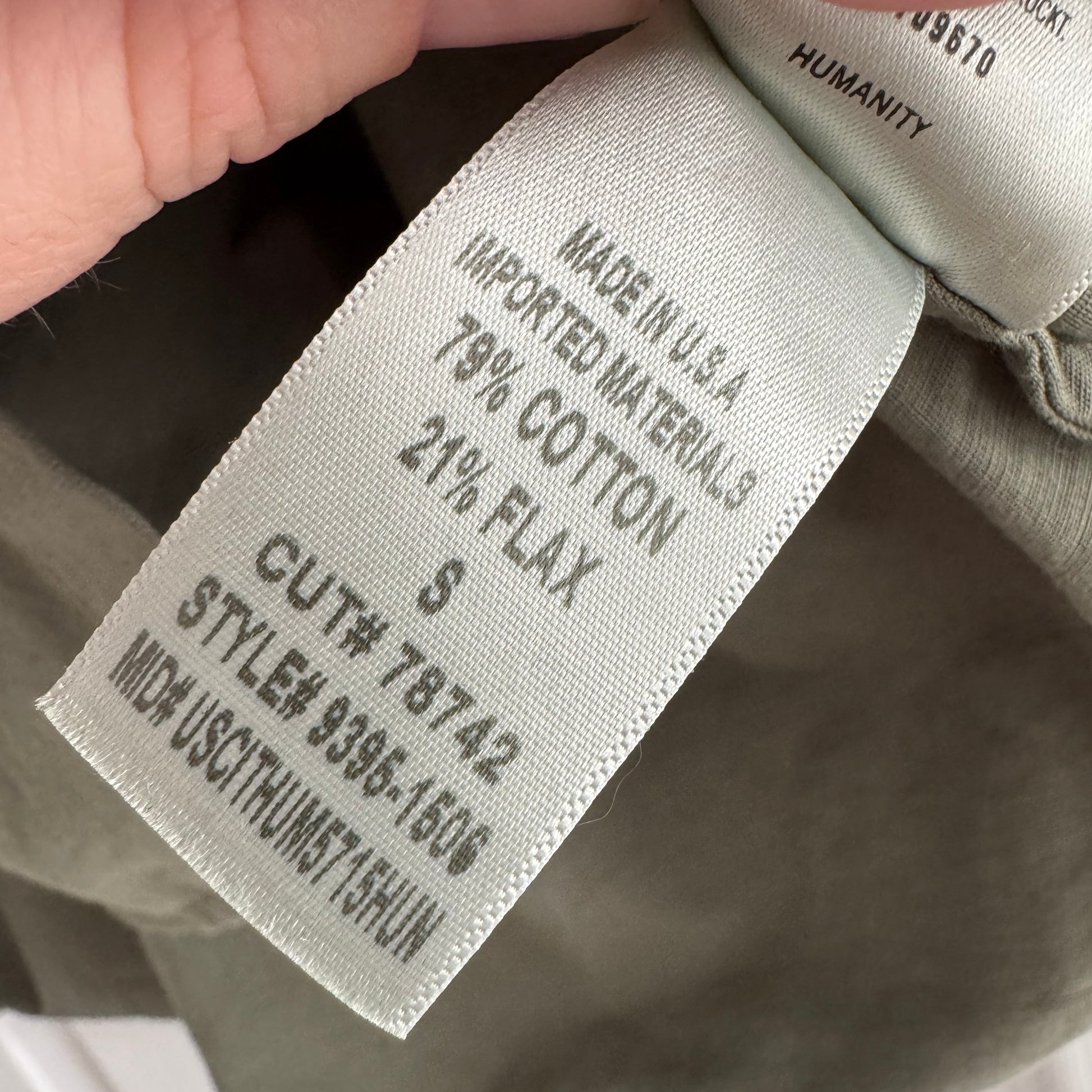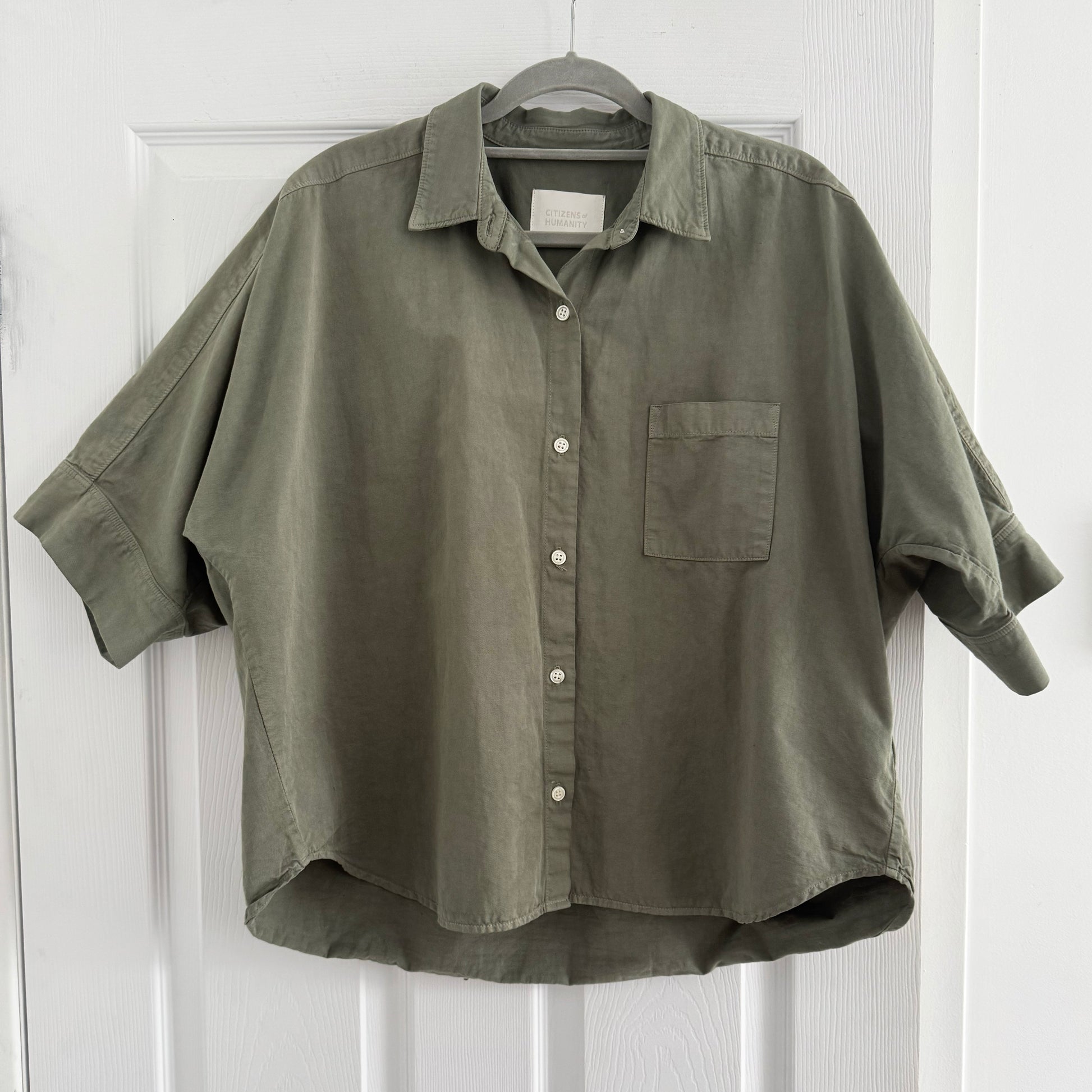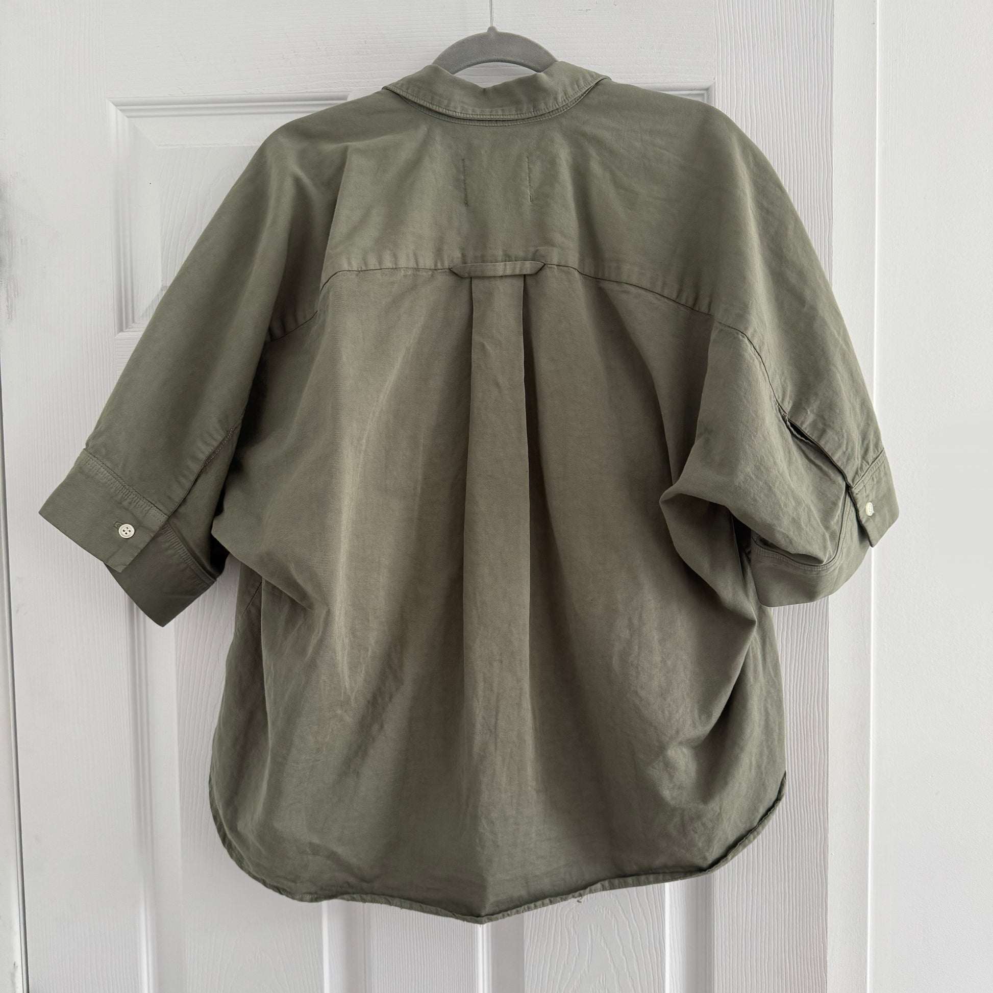 Citizens of Humanity "Claire" Origami Shirt In Dogwood, size Small. Fits oversize by design - could defo work for a S/M. Such a cool, relaxed shirt with an army-inspired fit. Perfect for warmer temps - the fabric isn't super super lightweight, but more just because it would be harder to layer something over it as the sleeves are wider. I love the idea of something like this paired back to something sexier, or something feminine, to create a bit of a balanced contrast. 26 inches armpit to armpit. 24 inches in length, and 3/4 inches longer at the back. 79% cotton, 21% flax. Worn like once and freshly drycleaned - in excellent condition. Currently selling for $358CAD, and selling here for $135CAD!