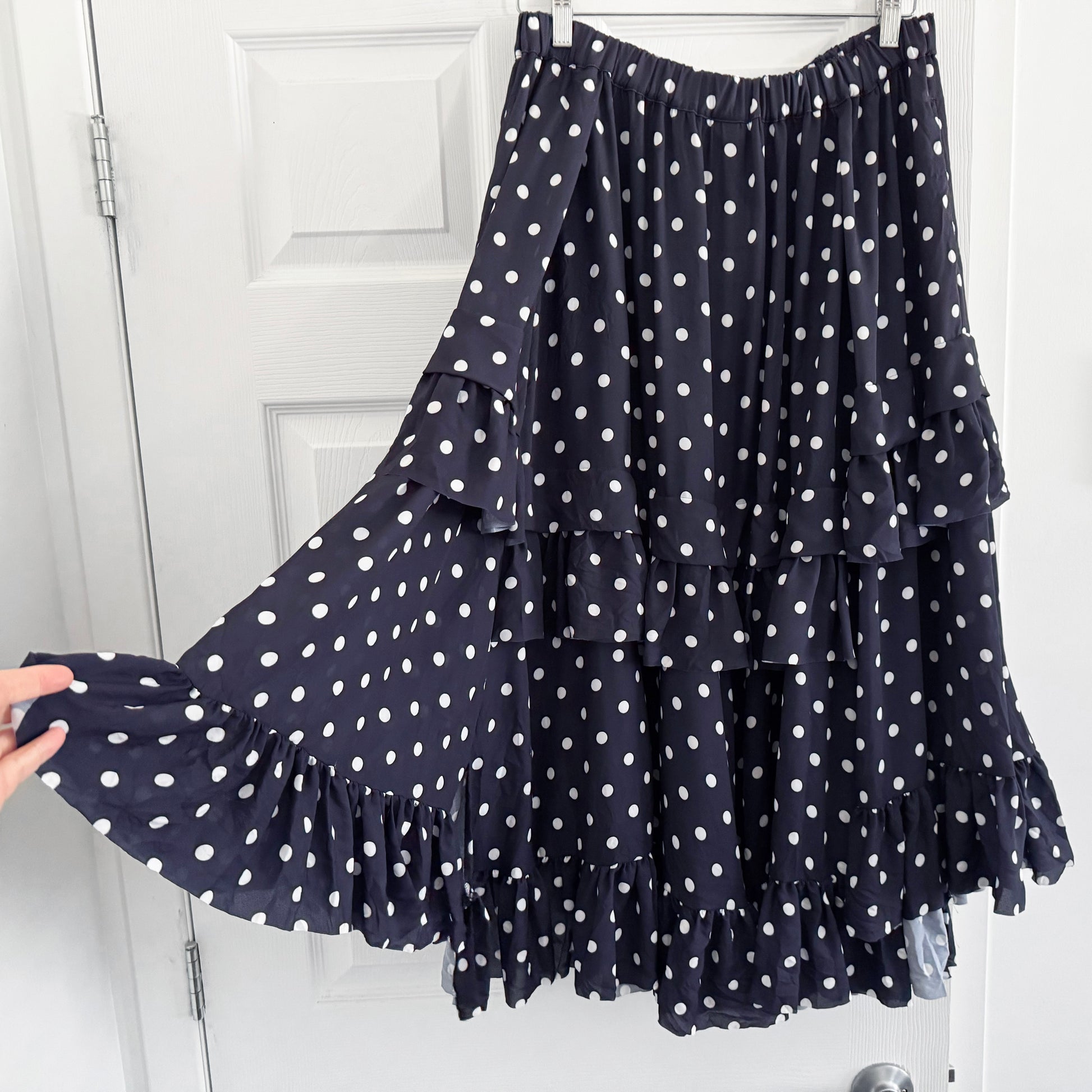Comme des Garcons Navy Polka Dot Skirt, size Large. Fits true to size, but has a little flexibility since it has an elasticated waist and a drawstring closure. Brand new with tags! This moves SO beautifully - the fabric is light and it practically floats when you move - there's so much fabric and it's cut masterfully. 100% polyester. 32 inch waistband, unstretched. 33 inches in length approximately. Originally $1095USD (like $1500CAD?), and selling here for $325CAD!