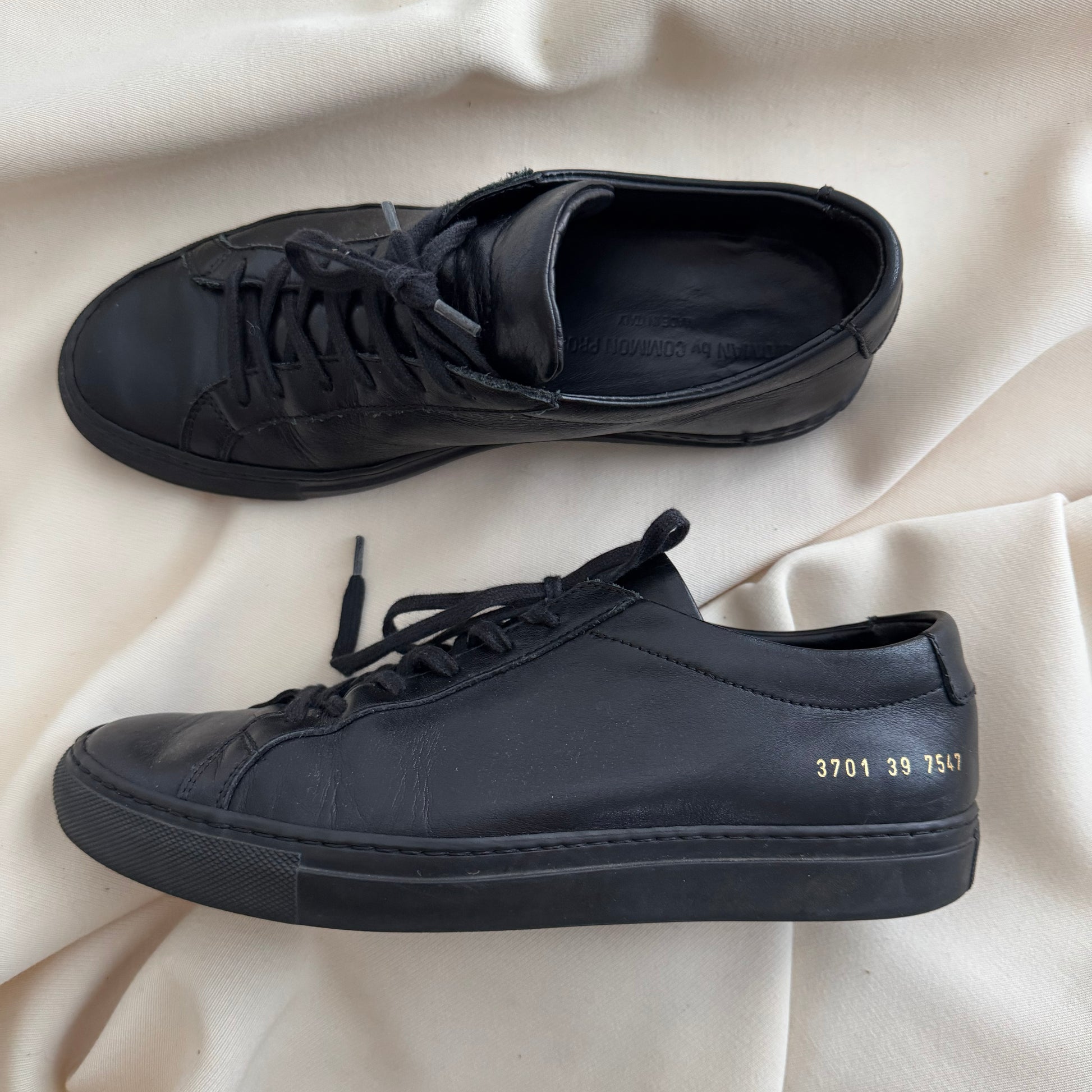 Common Projects Achilles Low Sneakers in Black, size 39. Fits like a 9/9.5. A classic, modern sneaker! Worn - but with lots of life left in them. Does not come with original box. Originally retailed for $595CAD, and selling here for $125CAD!