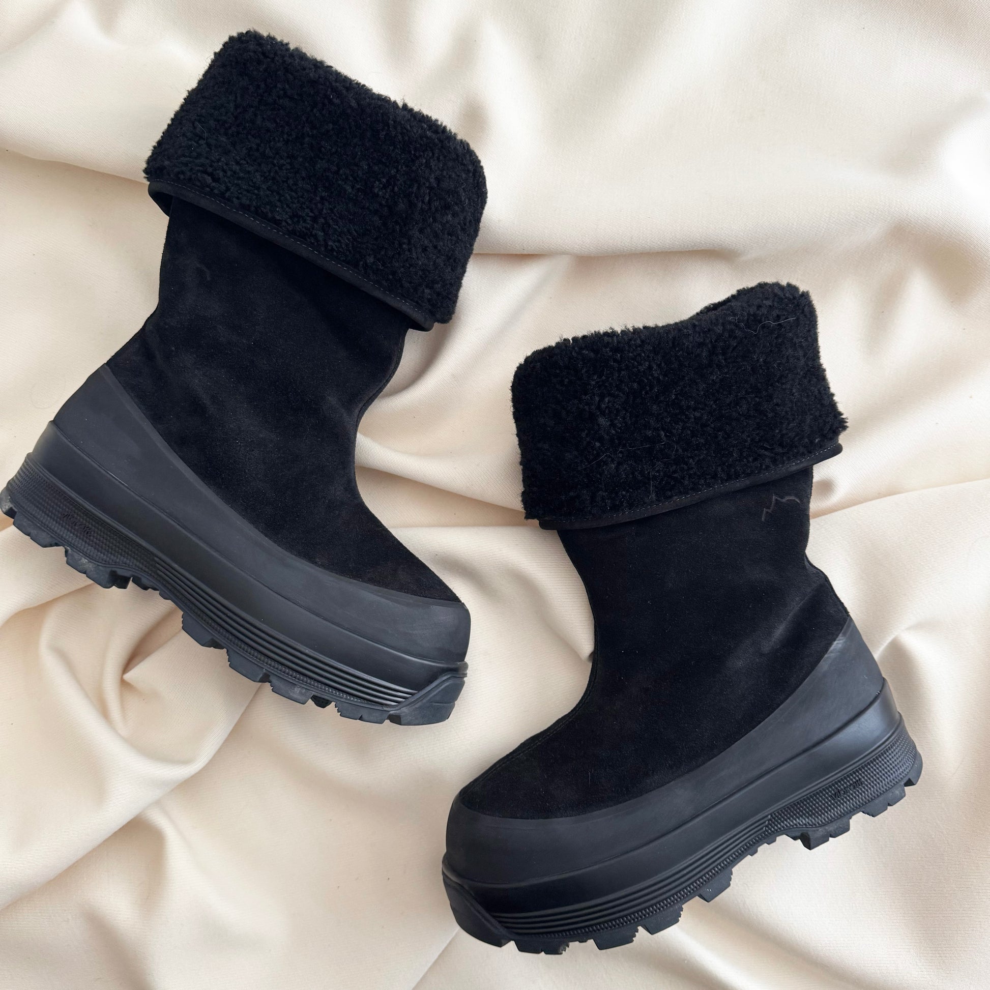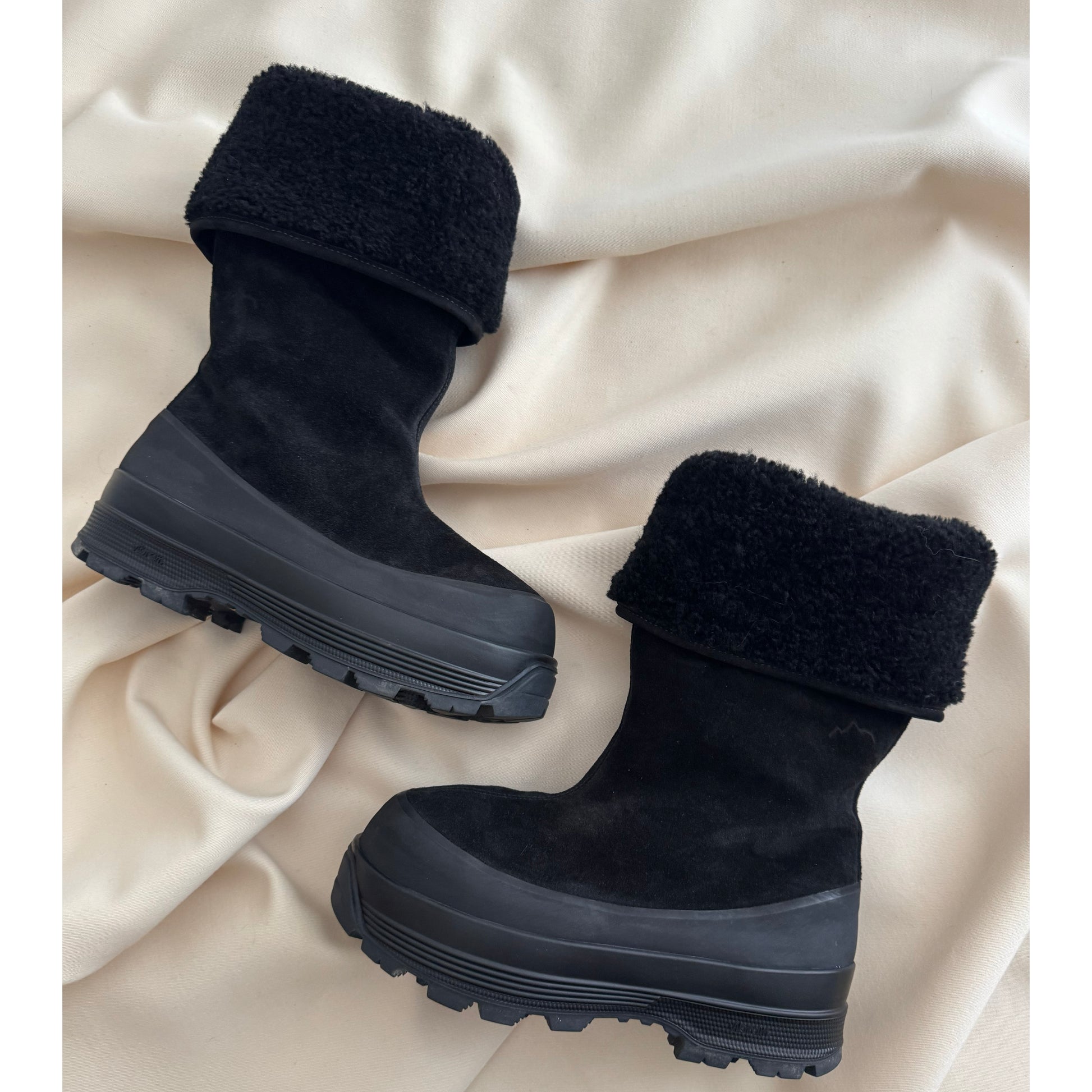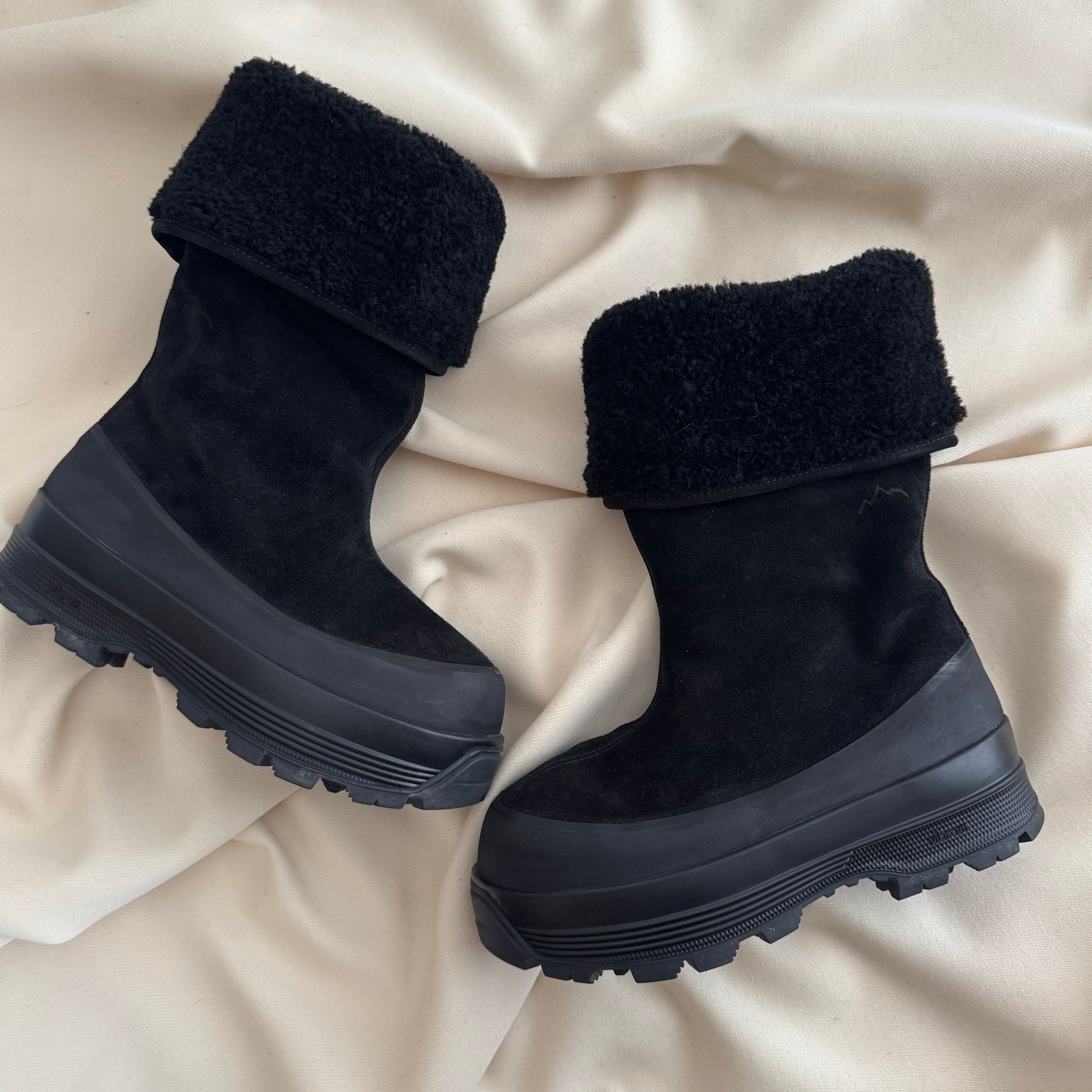Diemme "Alta Badia" Shearling Lined Boot in Black Suede, size 38. Fits true to size. A beautifully luxurious - yet practical - heavy winter boot - great for Canadian winters (Vancouver and Vancouver island excepted, of course)! Designed to handle harsh conditions from city streets to mountain getaways - with a Vibram sole that delivers both durability and grip. The boot can also be folded down, as the wearer prefers. Rubber sole and lambswool shearling upper. Made in Italy. Worn only a few times and in very good condition. Does not come with original box. Currently retailing for about $1000CAD, if you buy it directly from the brand's website! Selling here for $395CAD!