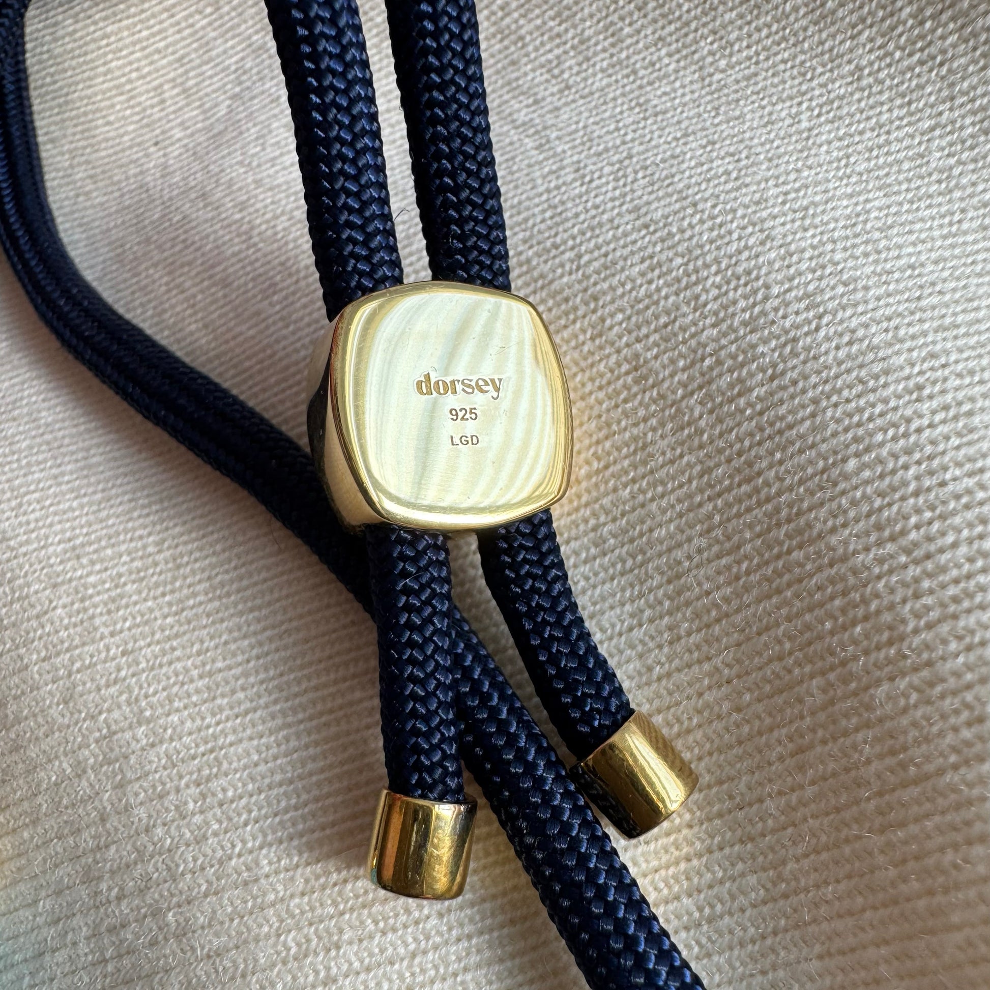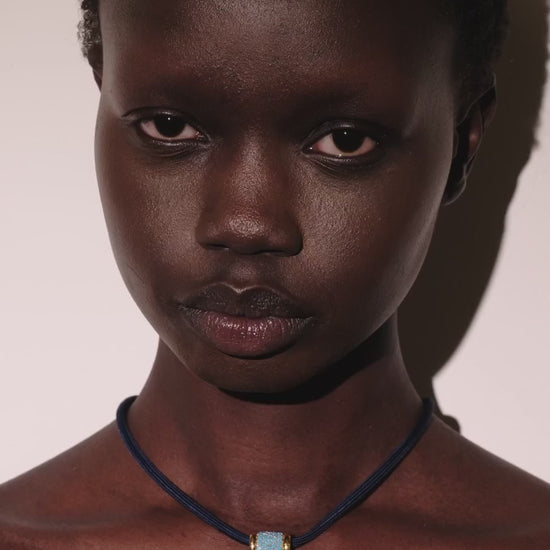 Dorsey Nano Turquoise and Diamond Paracord Necklace in Navy. An icon of the brand's collection - this necklace comes in many variations of colours and stones - but I think these colours are SO perfect for the season. Both elegant and chill at the same time - it's a soft nylon paracord rope in deep marine blue, secured with a nano turquoise slider for an adjustable fit. Wear it long and layered, or cinched as a true choker. A nano turquoise and lab diamond accented pendant is the finishing detail. 28 inch long nylon cord (about 4mm thick). 18k gold vermeil with nano crystal turquoise stones and one lab-grown diamond. (Stone Size: 2mm - Stone Carat: 2.88 CTW DEW - Pendant Dimensions: 16x12mm). In excellent condition - no signs of wear. Currently retailing for $667CAD (plus import fees from the US!), and selling here for $335CAD!