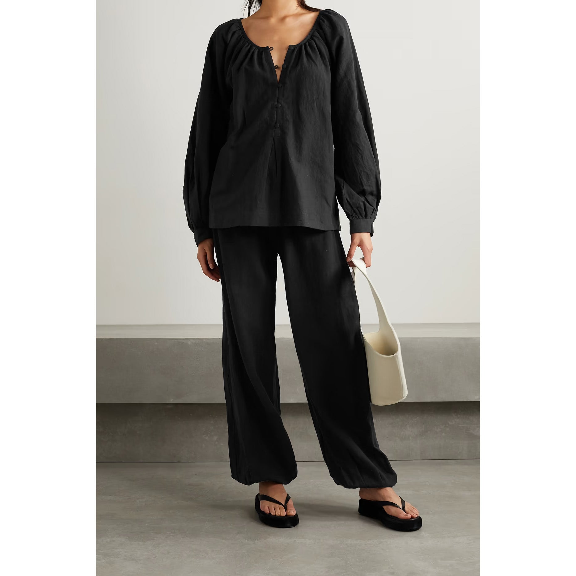 Haut en lin noir Fil De Vie, taille XS. S'adapte à la taille. Réalisé dans un très beau lin qui n'est pas très léger, NI lourd - idéal pour les températures de transition - il a de très jolies manches blouson qui sont dotées d'un poignet ajusté. Une pièce super élégante et TRÈS utile dans n’importe quel placard !! Il ajoute une texture subtile à n'importe quel look et va avec tout. J'aime le fait qu'il puisse être facilement habillé de manière habillée ou décontractée. La fermeture partielle à boutons sur le devant vous permet de défaire quelques boutons au niveau de l'encolure froncée pour améliorer encore la sensation de détente. 100% lin. Dans de très bonnes conditions. À l'origine plus de 500 $ CAD, et vendu ici pour 175 $ CAD !