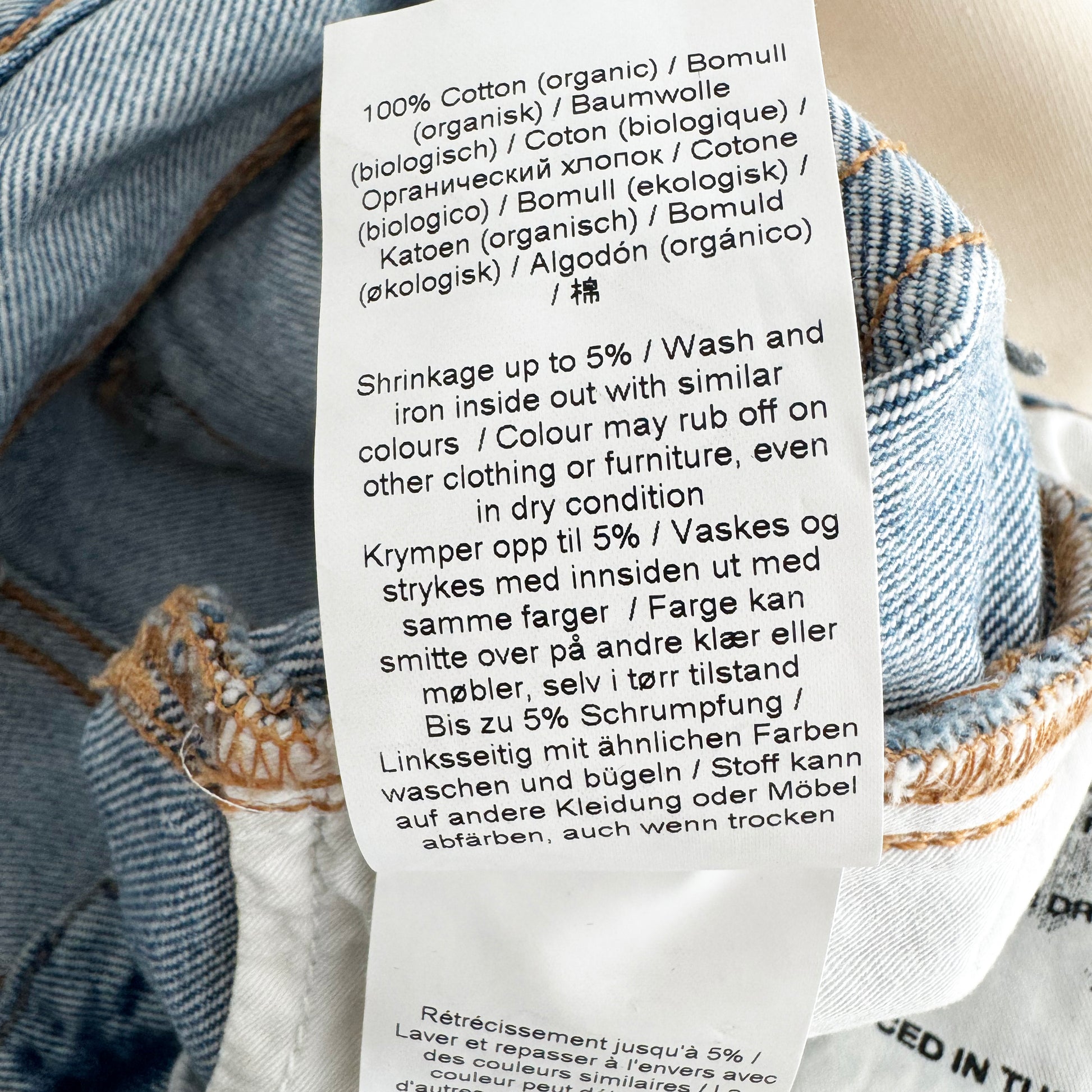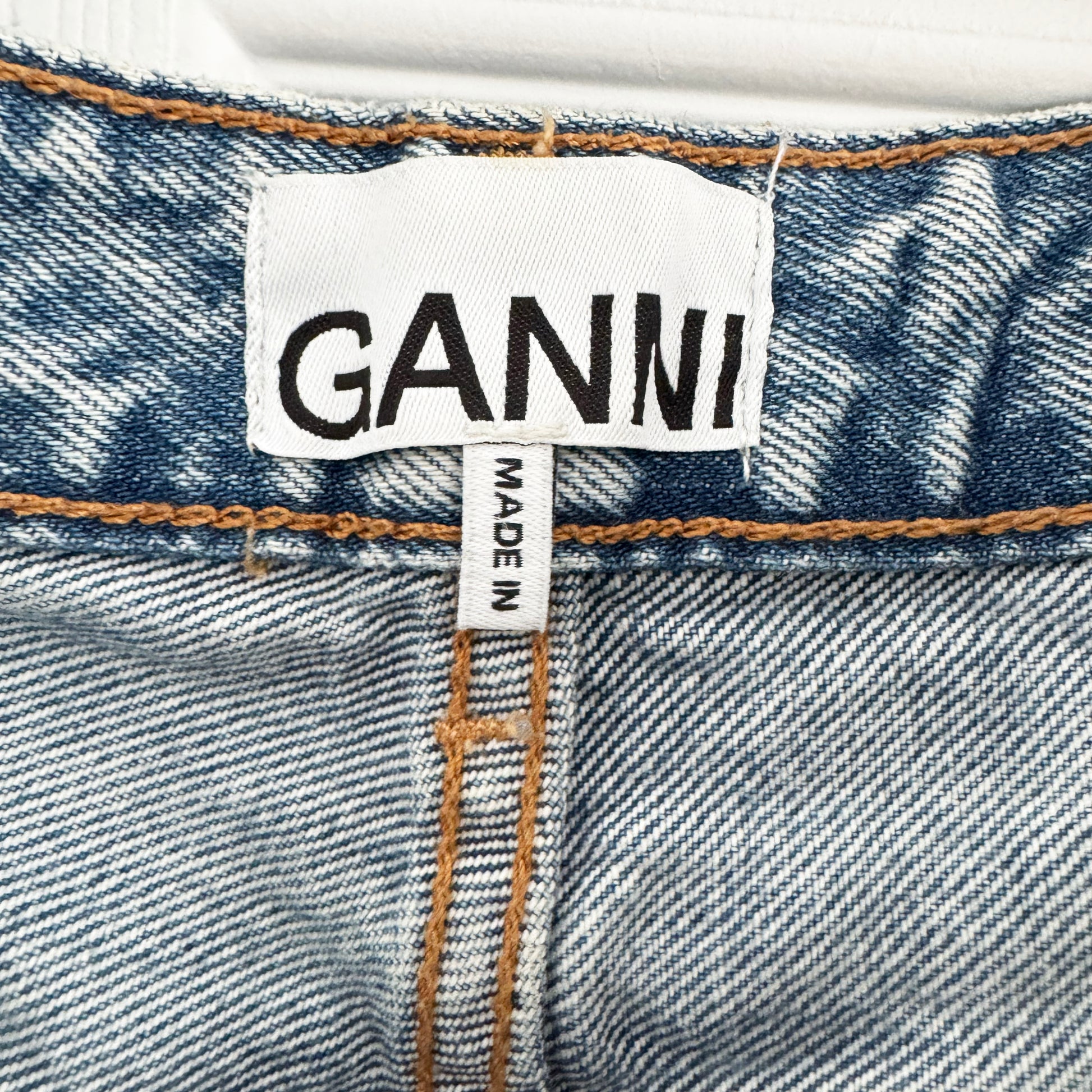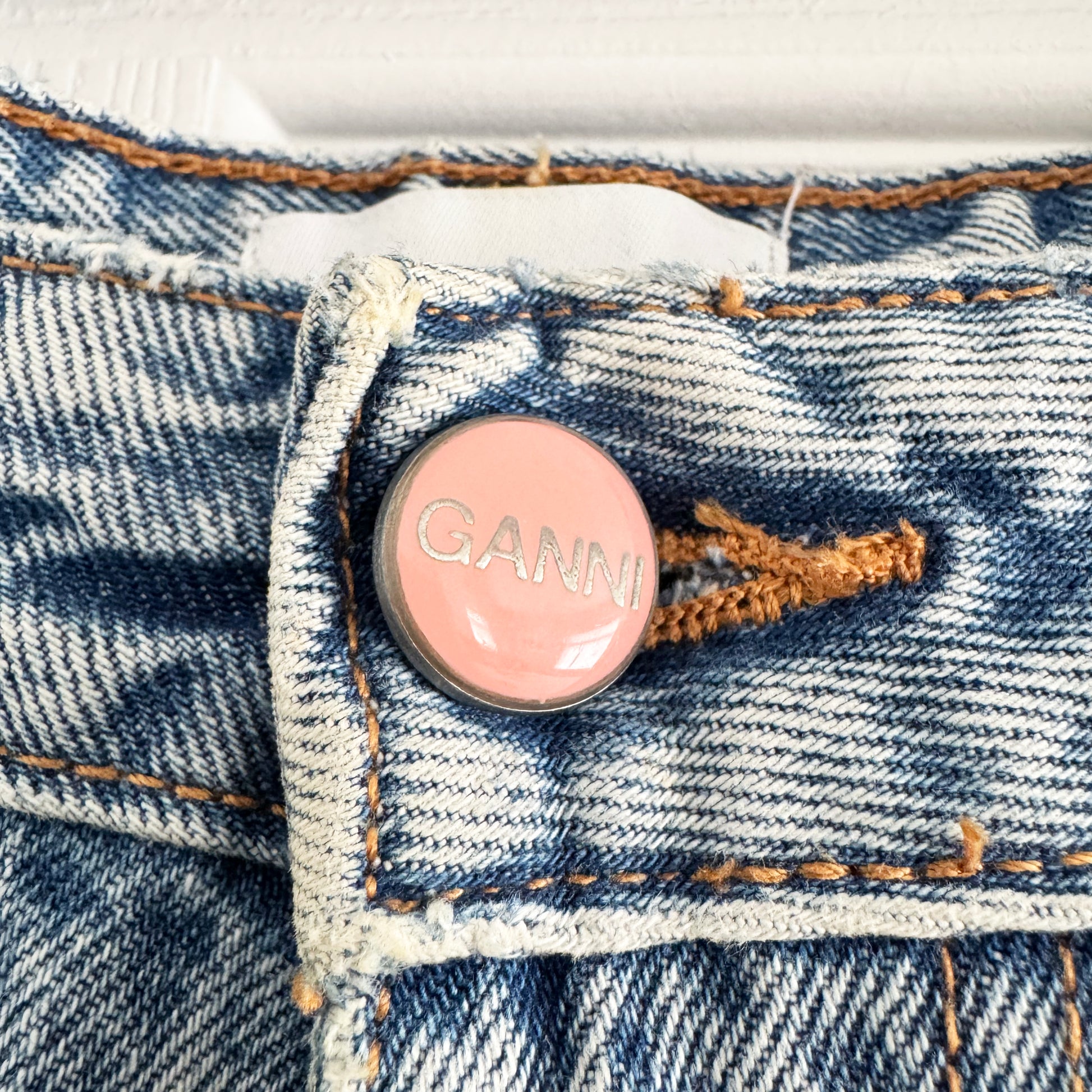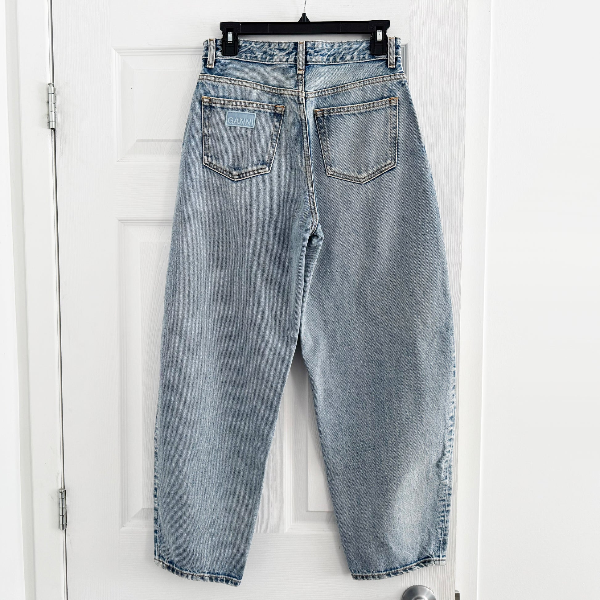 Ganni "Stary" Jeans in Blue, size 27. Fits true to size. A perfect jean for this season - and beyond! Done in a soft and almost vintage feeling denim, in great medium-light blue shade. They're designed for a fitted look at the waist, a relaxed fit through the hips and thighs, and a cropped leg that hits at the ankle. Featuring a zipper fly, a pink button closure and baby blue logo back pocket patch. Pair with sandals, or flats, and combat boots in bad weather! 27 inch inseam. 12.5 inch rise. The waistband measures 14.5 inches flat. 100% organic cotton. In excellent condition. Originally $400CAD, and selling here for $165CAD!