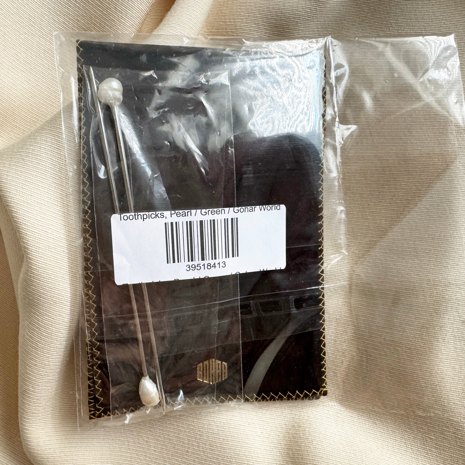 Gohar World Pearl Toothpicks. Brand new in packaging. Meet our classic toothpicks topped with pearls, or what we like to think of as signature Gohar English peas. Perfect for hors d'oeuvres, short cocktails, and dainty sandwiches – just in time for spring picnics. Dimensions: 3 inch / 8cm. Fabrication: Copper, Silver Plated. Made in Egypt. Hand-wash and towel dry immediately. Foodsafe. Currently retails for $120CAD, and selling here for $65CAD!