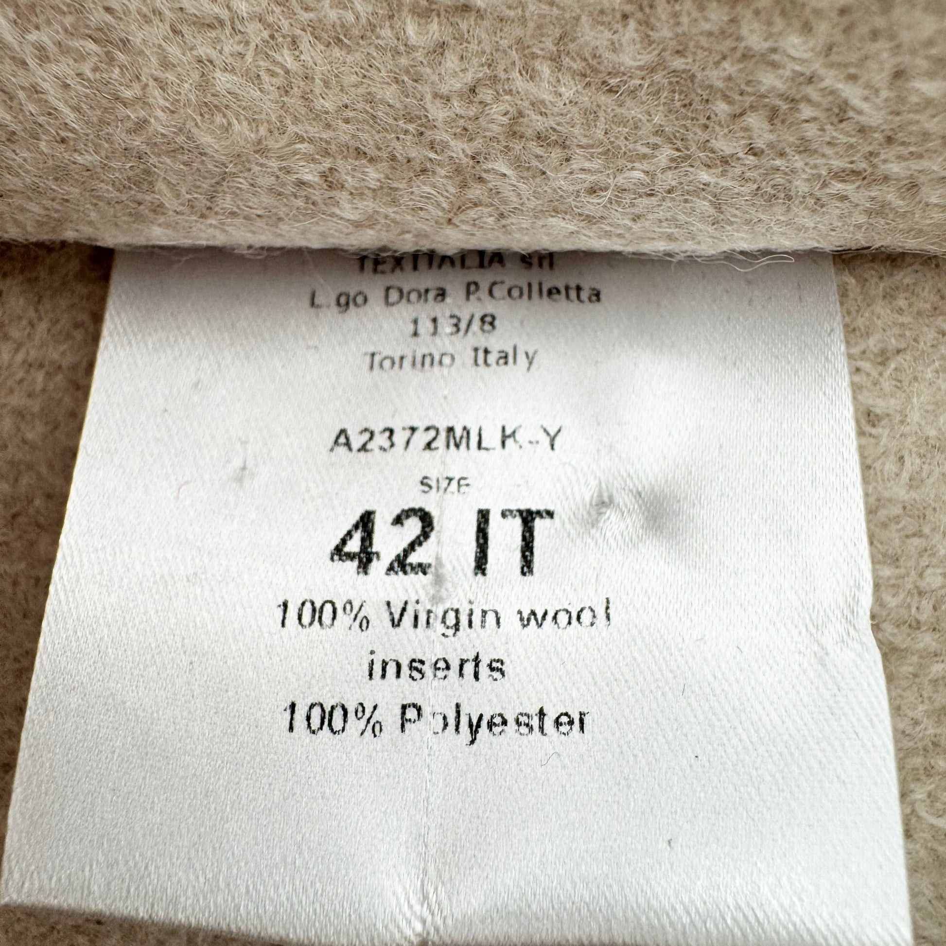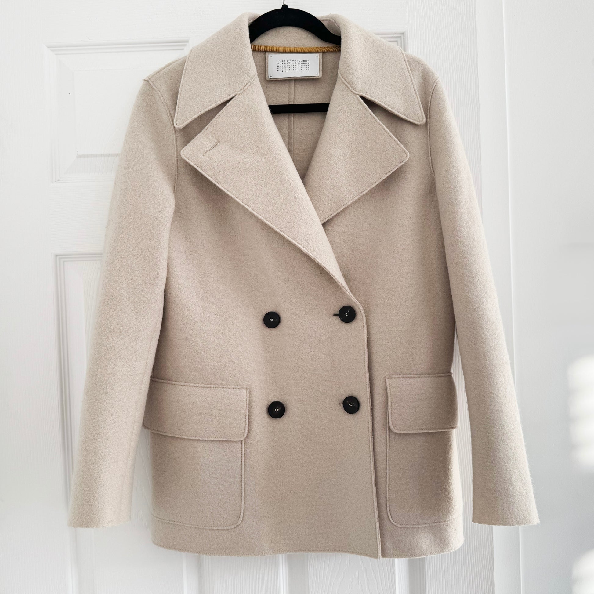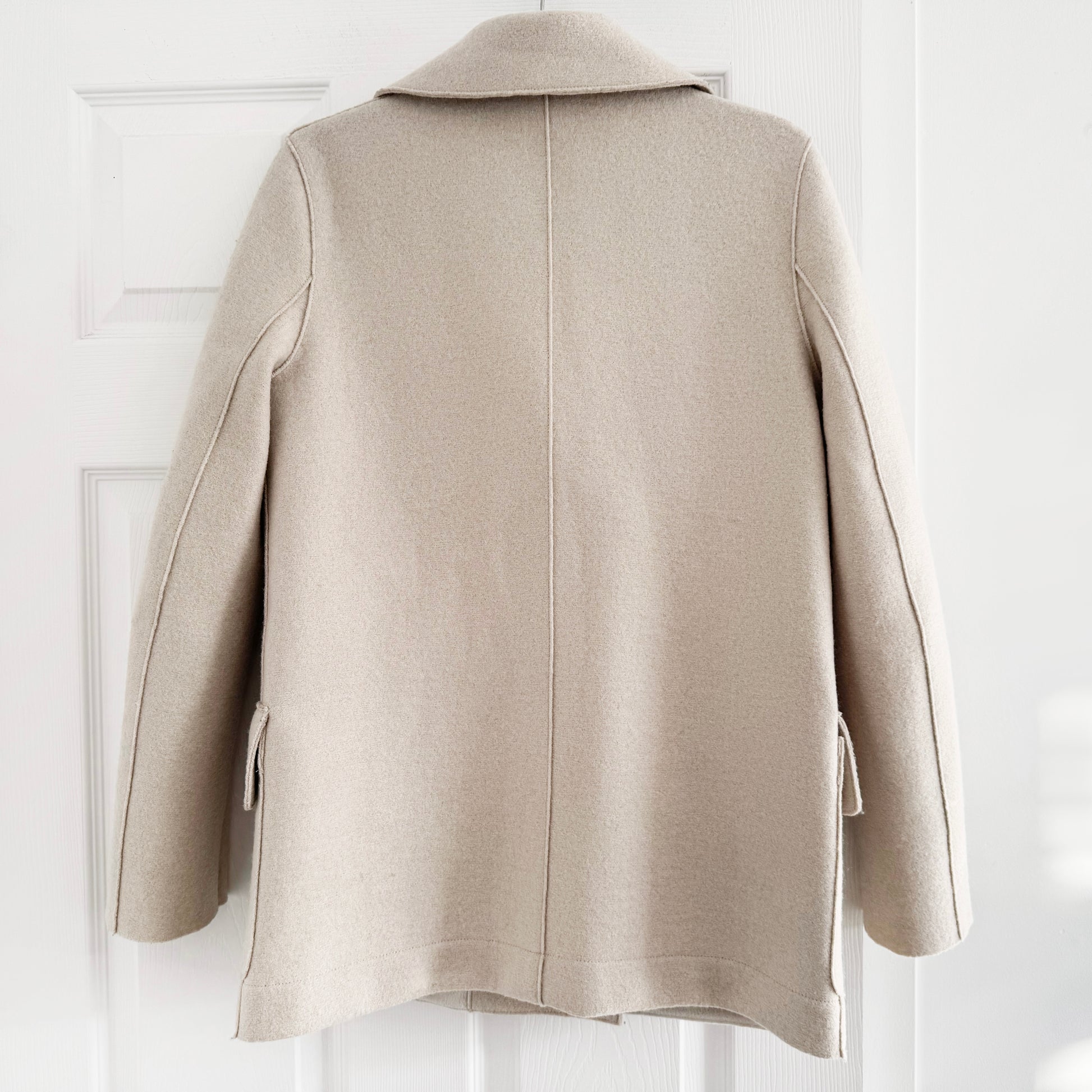 Harris Wharf Double Breasted Wool Pea Coat in Ivory, size 42IT (fits size Small or so). I'm always on and on about how much I love this British brand I think thier signature pressed wool fabrication (which is a bit stretchy by nature) is probably the BEST possible fabric for a pea coat (or any coat for that matter) - it's just that much easier to move in. This beauty is perfect for East Coast's Fall and Spring temps, or West Coast's September - May temps. It's lined in the front with a bit of fleece to provide a little extra warmth, but is unlined otherwise. 20 inches armpit to armpit. 28 inches in length. 100% cool. Worn a few times and in very good condition. Originally around $900CAD, and selling here for $385CAD!
