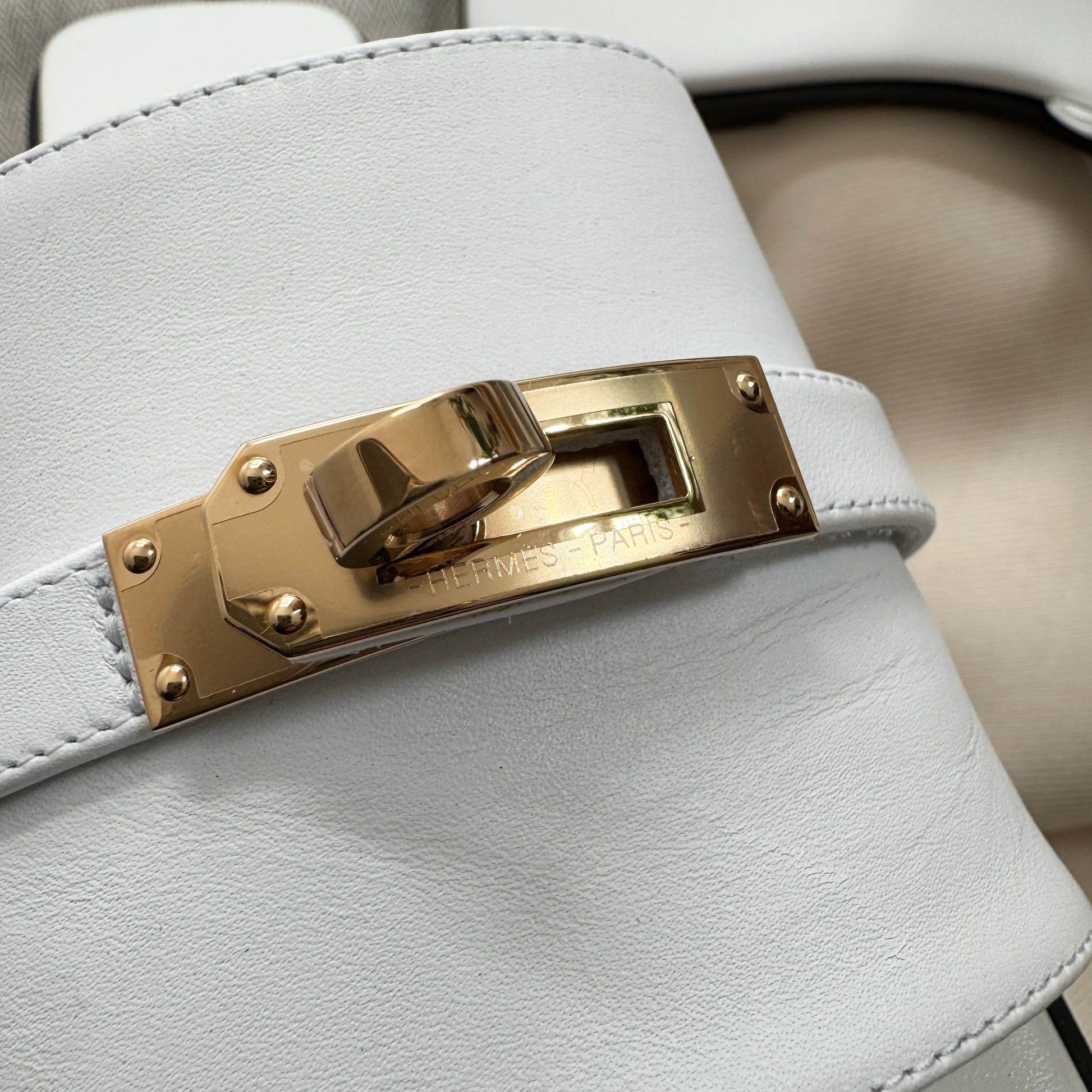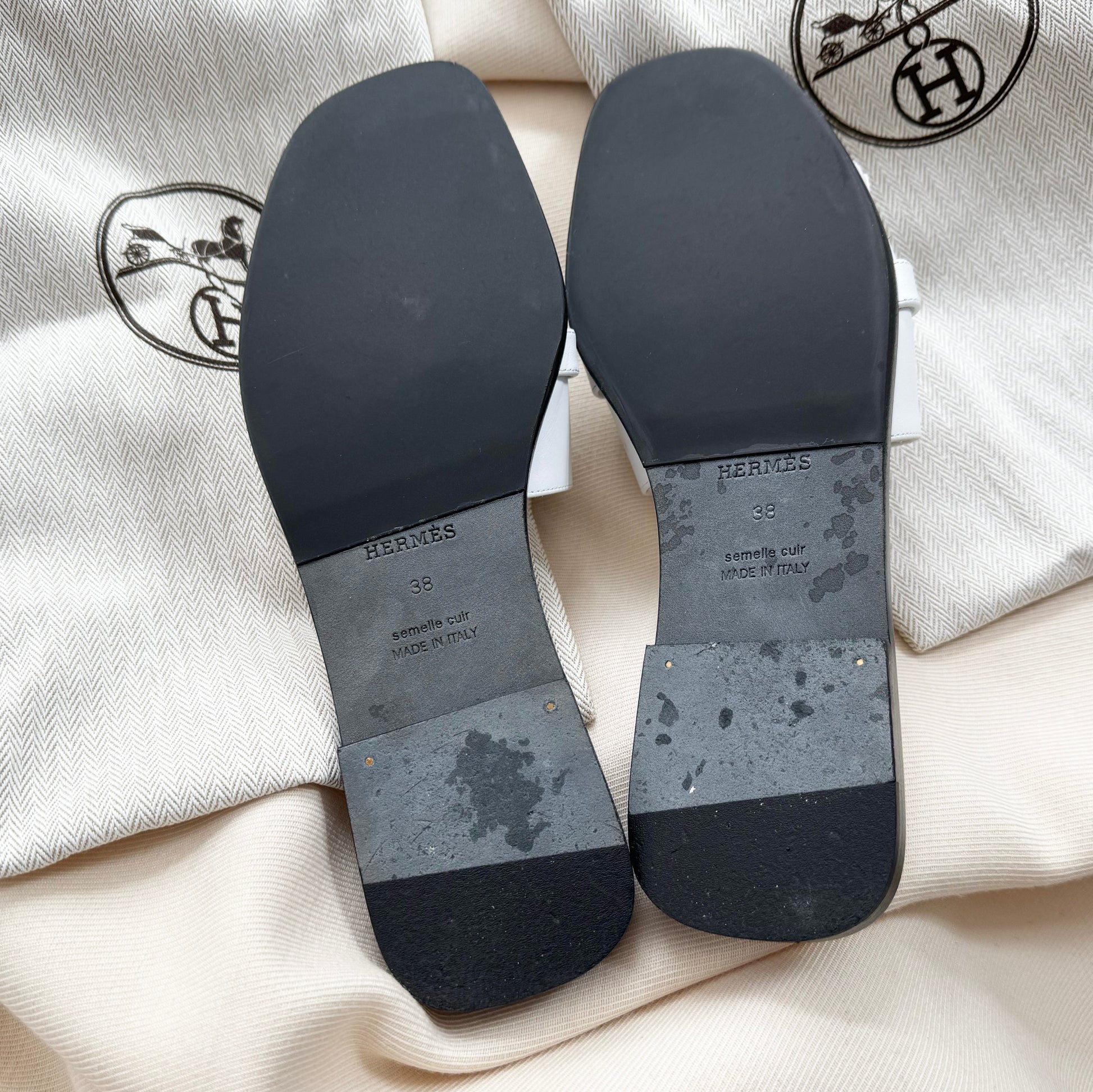 Hermès "Guilia" Sandal in White, size 38. Fits true to size for Hermes, but if we're leaning, better for a 37.5/38 than a 38/38.5. Such a perfect summer slide!! So chic! I love the white with gold hardware colour combo, it's as timeless as it gets. Never worn - has been tried on only - and also had already had the topy put on for you. Comes with dustbags but not the original box. Currently selling for $1600CAD, and selling here for $895CAD!