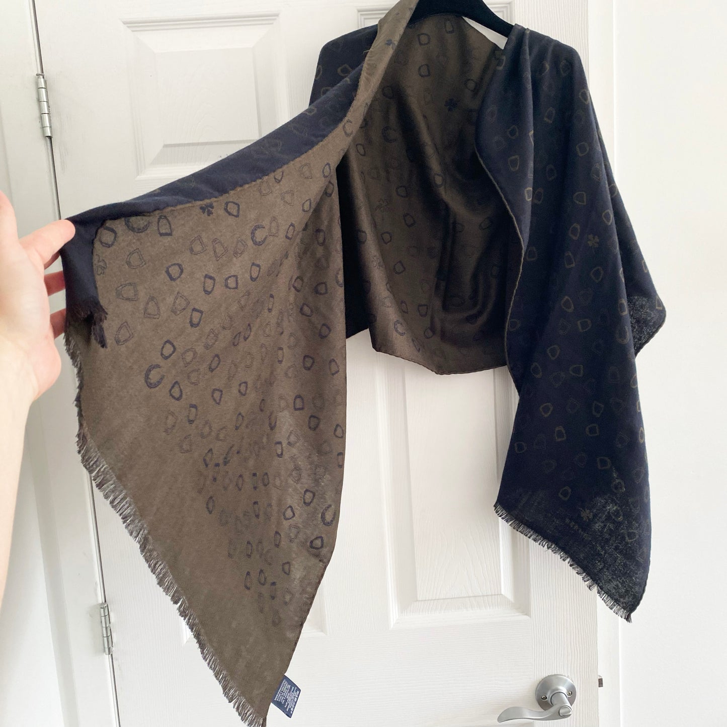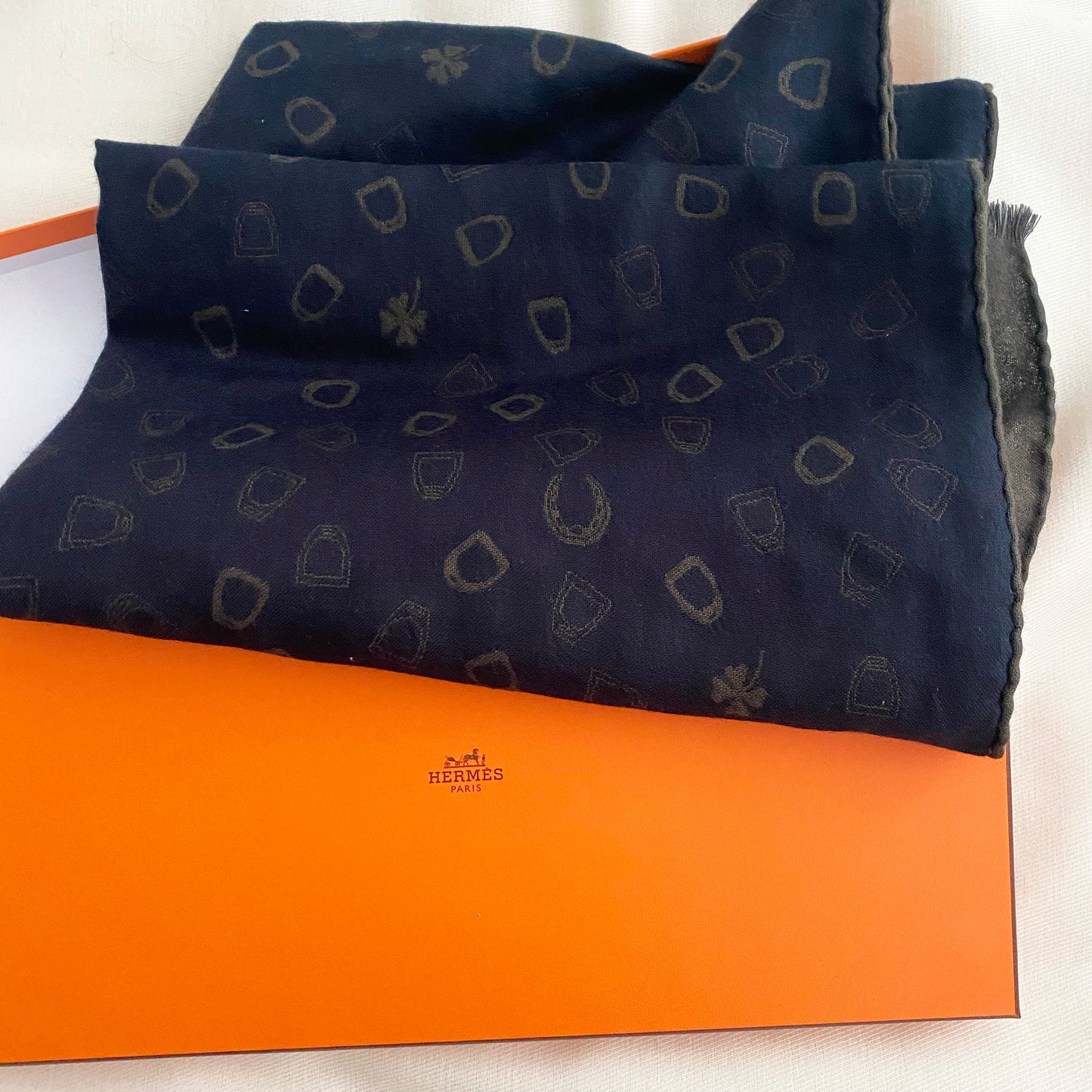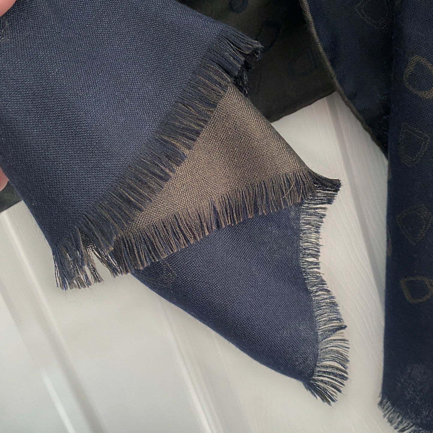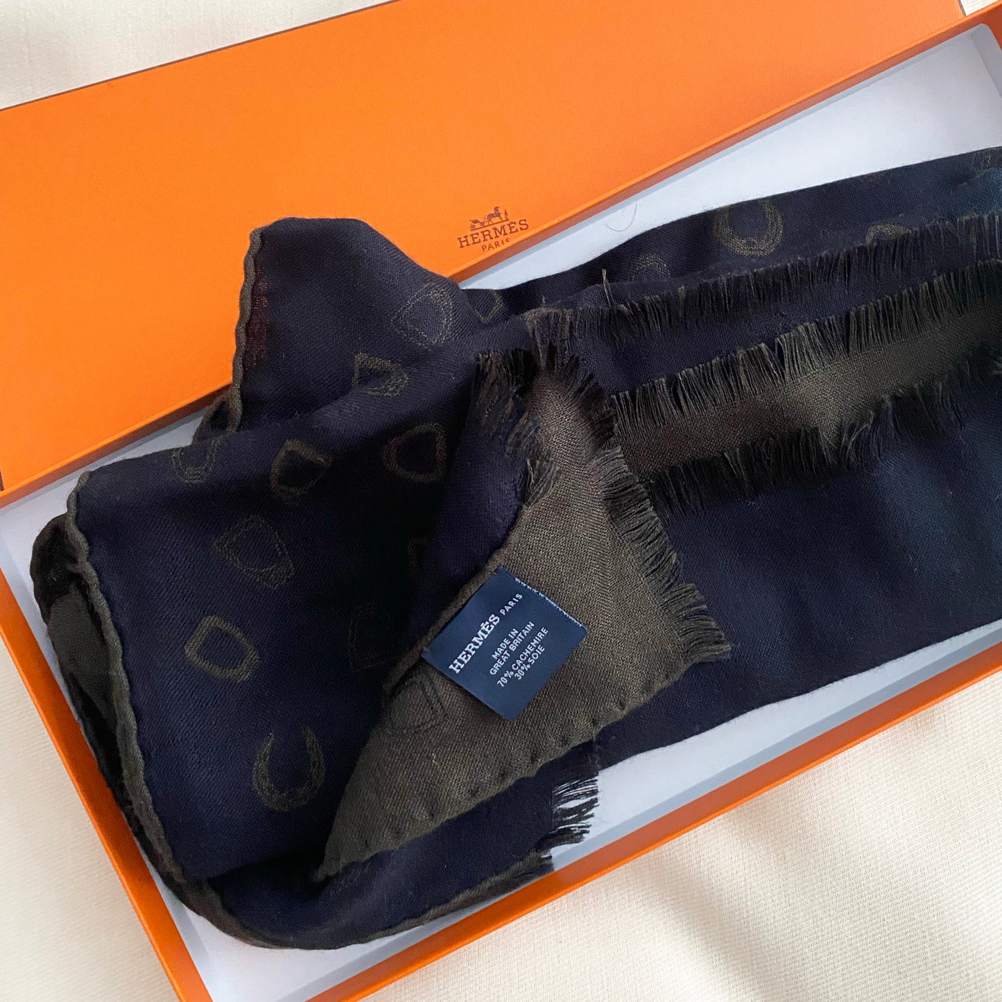 Hermes "Ladybird" Mens Cashmere/Silk Scarf in Marine/Bronze. This stunning scarf from the Fall 2023 collection is done in a reversible style - in two very versatile colours! VERYYYYY soft, which you would expect, and lightweight, but the double layered design (with beautiful handrolled edges), offers the perfect amount of warmth. Long enough to be wrapped fully around the neck once - it's a perfect length - not too long, not too short! It may be from the mens collection, the scarf not limited to wear by a man - I find it beautiful for wear on anyone (I love it - I would totally wear it)! 180 cm x 63 cm. 70% cashmere, 30% silk. Worn less than a handful of times and in very good condition. Comes with the box. Currently on the French website for 905euros - the seller did buy this in Paris from the boutique there actually - it was less for her since she had the tax back, but it was at least a thousand CAD - selling here for $395CAD!
