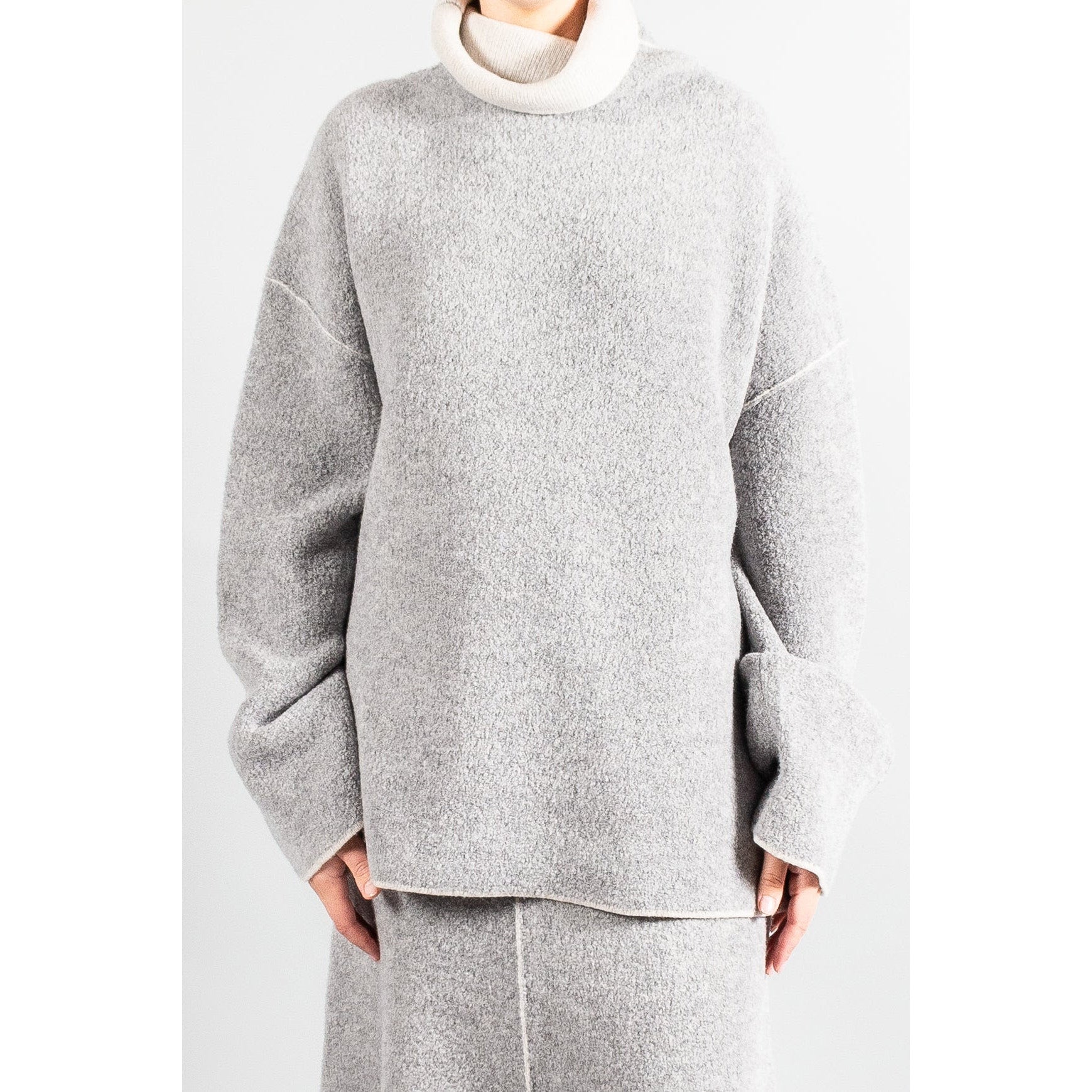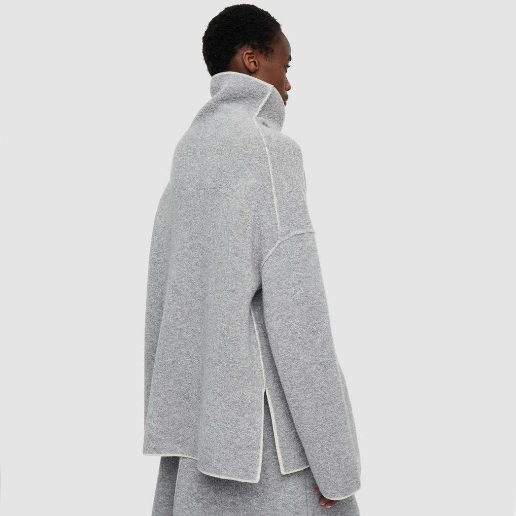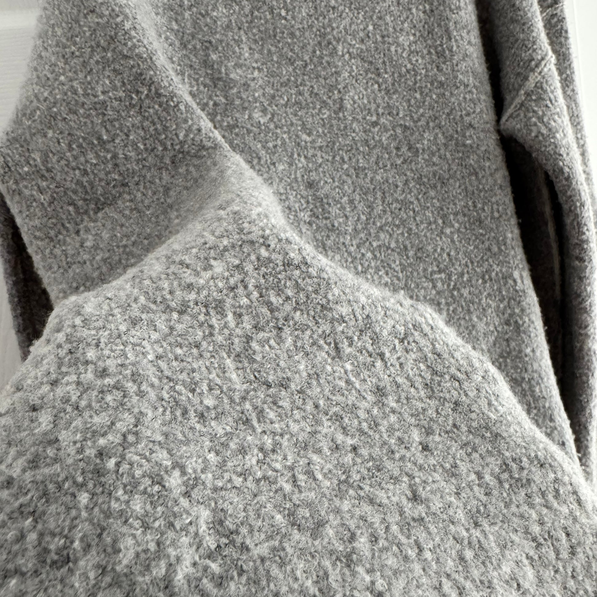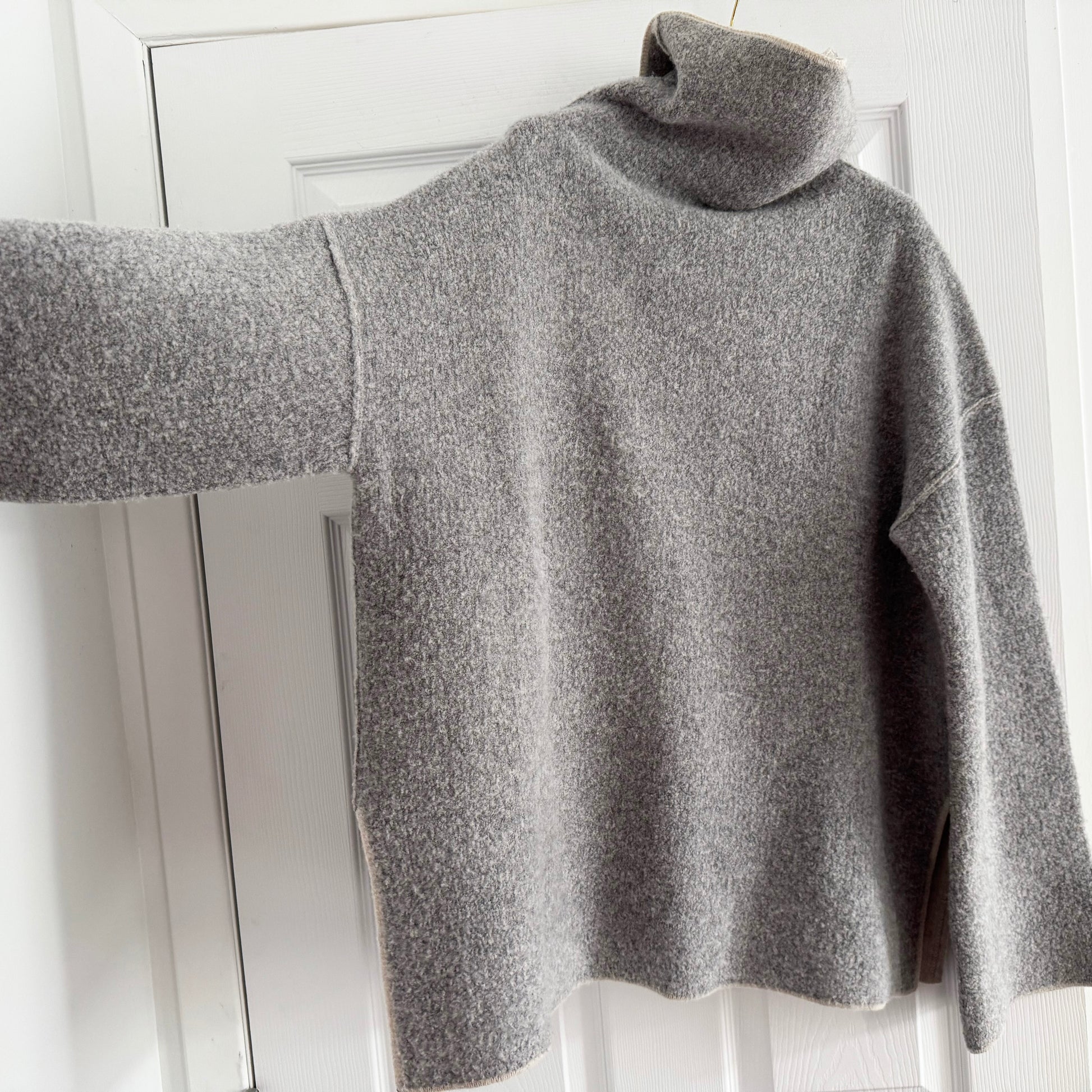 Joseph Bouclette Knit Sweater in Grey, size XXS (fits SO oversize). SO soft and so cozy - it's not your usual knit - they describe it as a "merino wool double-faced bouclette" - which in real life is like a really plush, super soft, lightly textured fabric, cut into a relaxed fit turtleneck. It has a cosy roll neck, contrasting stitch detailing, and split side seams. Great with a skirt, jeans, or loose trousers. 23.5 inches armpit to armpit. 25.5 inches in length. 88% merino wool, 12% polyamide. Lightly worn and in great condition. Originally around $850CAD, and selling here for $245CAD!