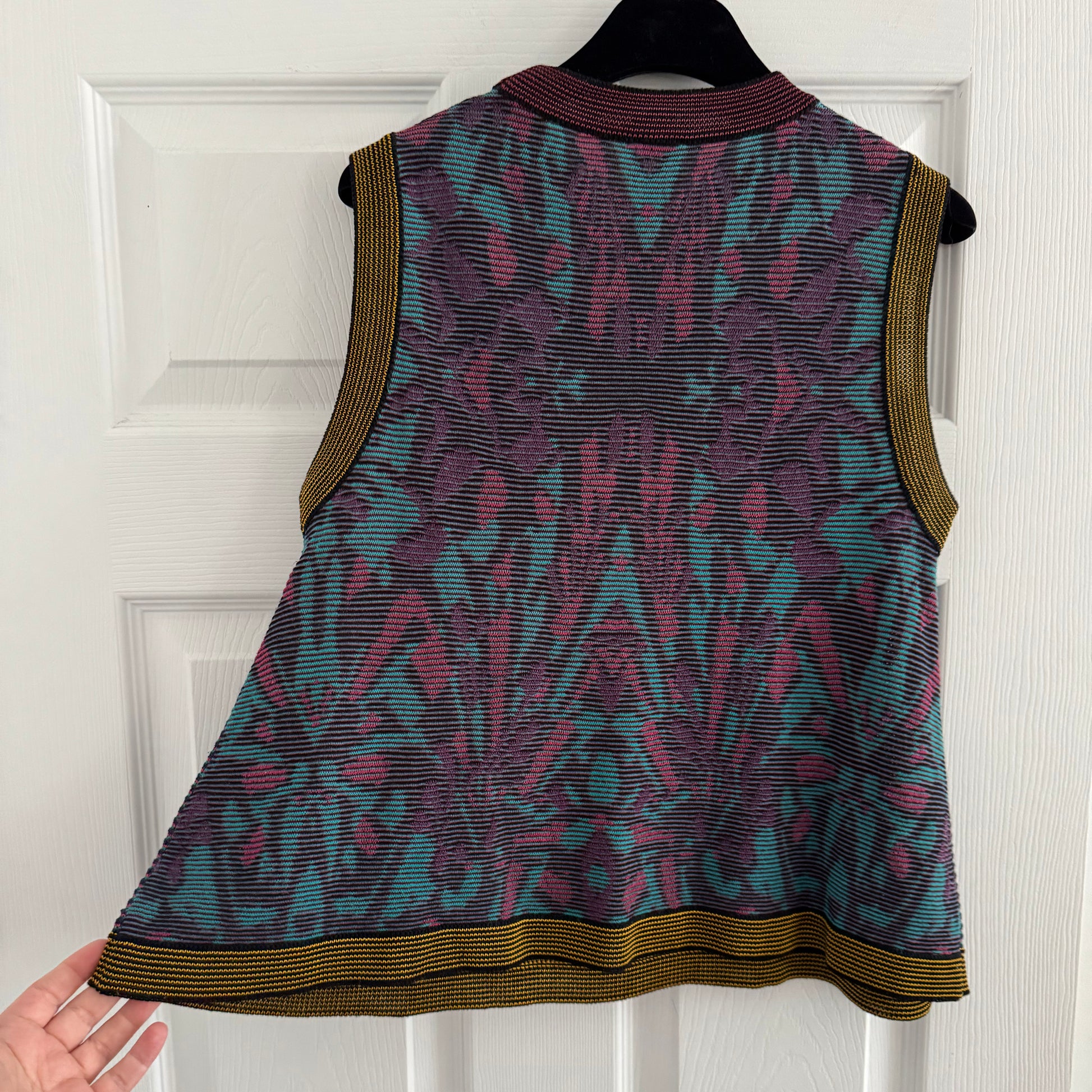 M by Missoni Knit Top, no size tag - fits like S/M. Such a cute little piece - great for layering and wearing alone alike! It has a swingy little cut, I can see it being really easy with shorts in warm temps. 18 inches armpit to armpit. 22.5 inches in length. 67% Cotton, 33% Viscose. Lightly worn and in very good condition. Originally around $500CAD, and selling here for $125CAD!