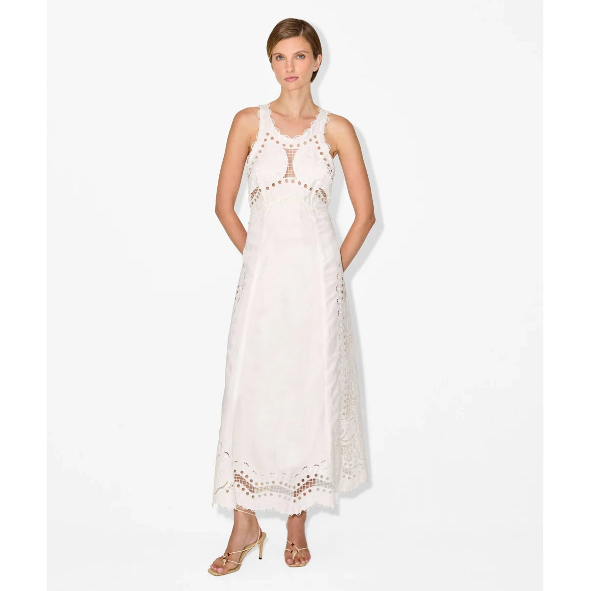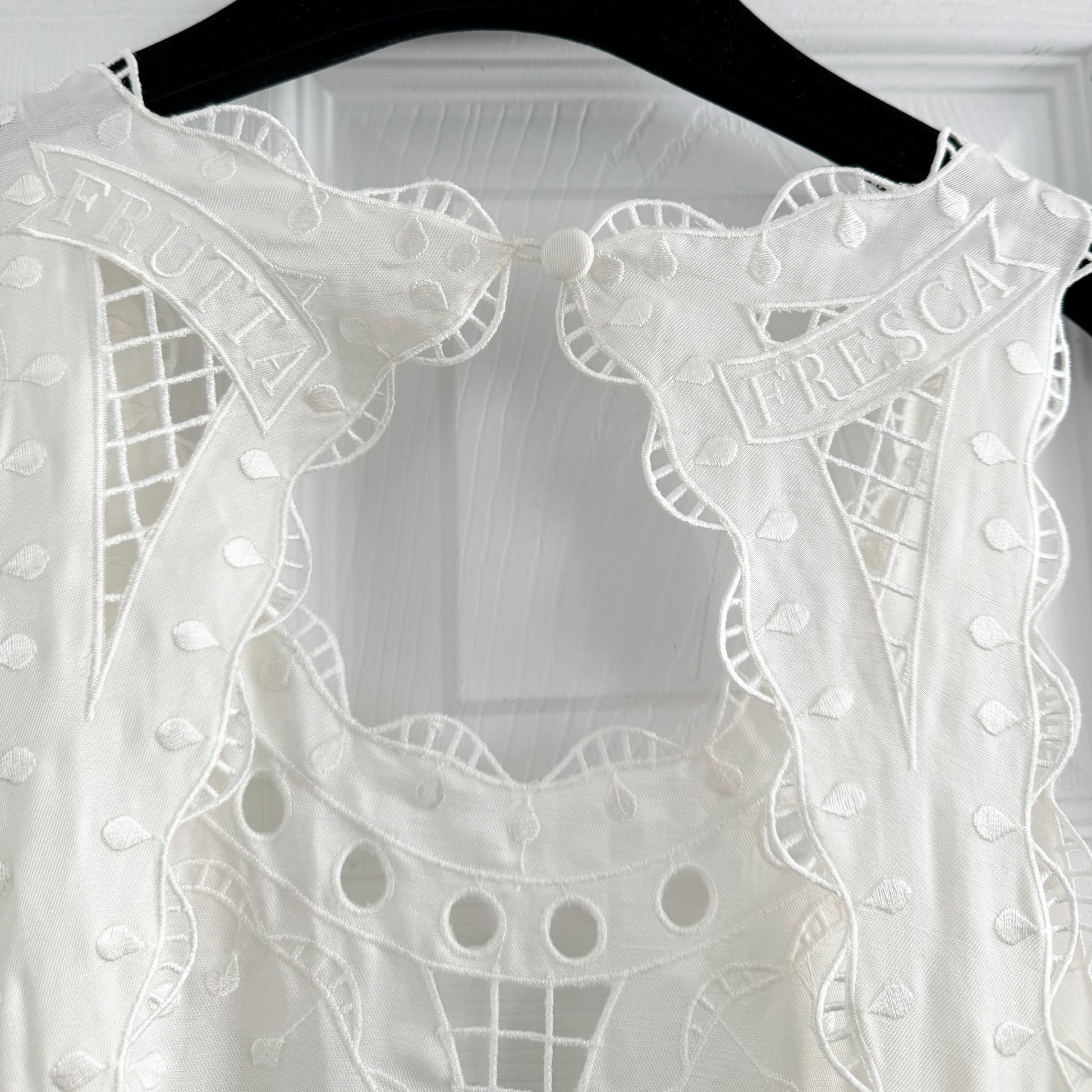 Magali Pascal "Frutta" Dress in Off-White, Size Medium. Fits true to size, but like a size 6 - could also work for a S/M. Done in a stupidly beautiful cut-out embroidered fabric, drawing inspiration from the charm of vintage tablecloths and, also, apparently "the lively fruit markets of Southern Italy", which admittedly, I do completely see. I DIE over texture like this in a blouse in warm weather - so pretty for vacay. No lining - meaning yes, it is see through - I love this aspect of it! 31% Viscose 39% Rayon 30% Linen. 18 inches armpit to armpit. 55 inches in length. In excellent condition. Currently retailing for $1075CAD, and selling here for $415CAD!