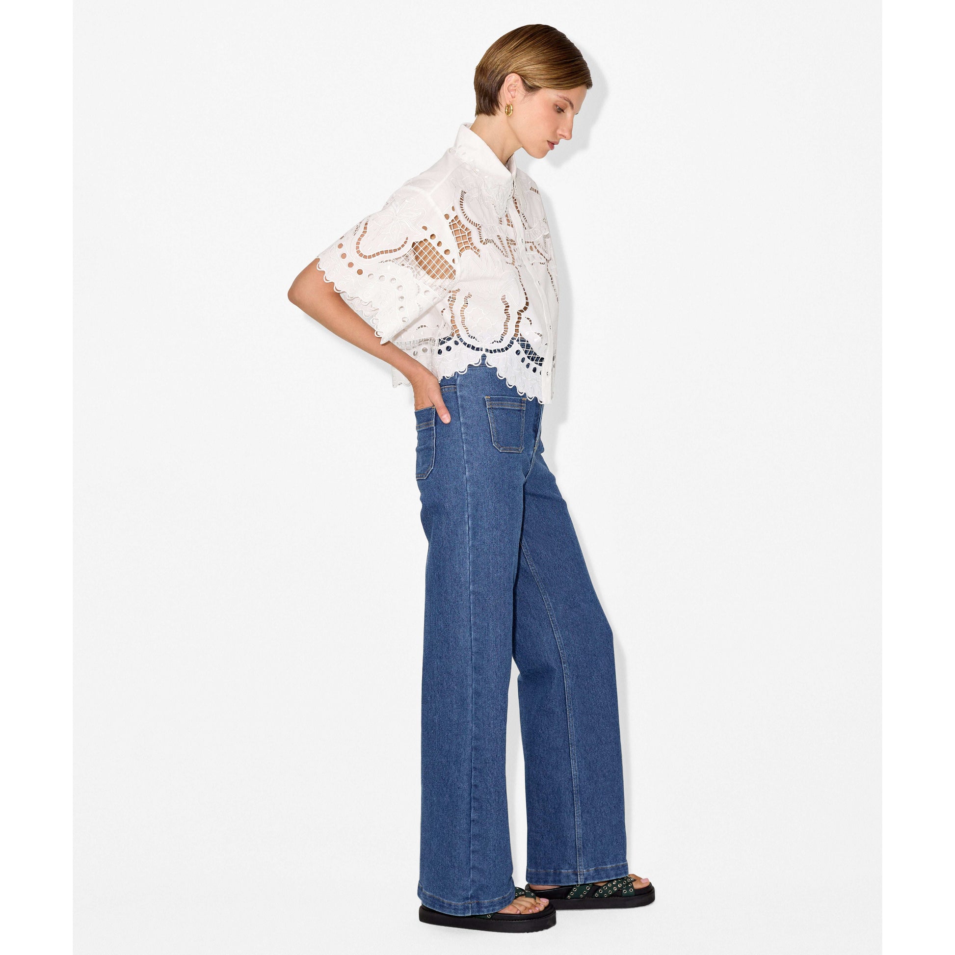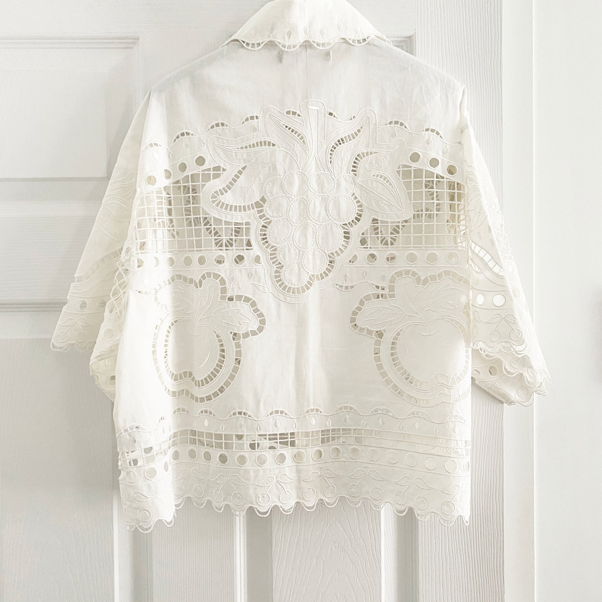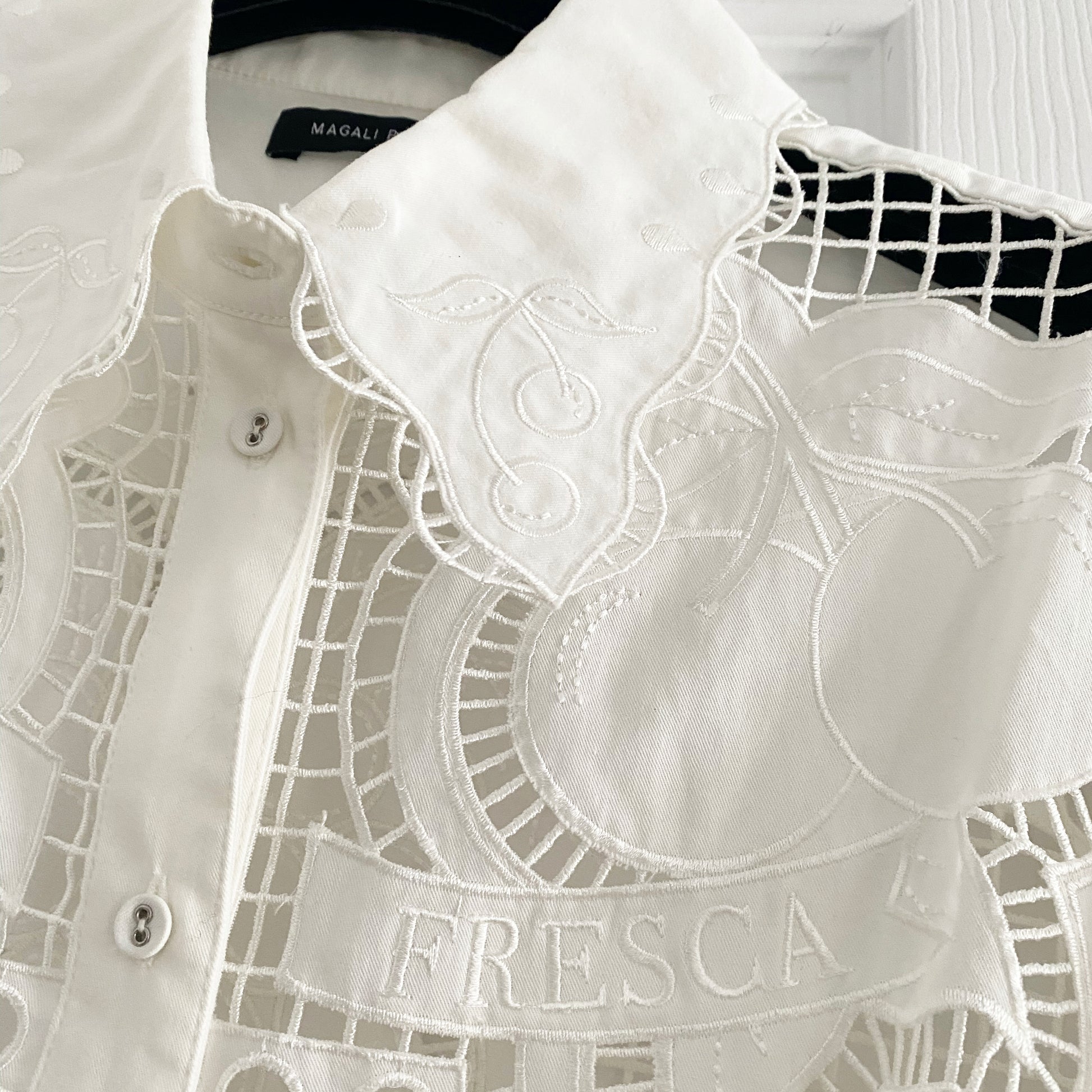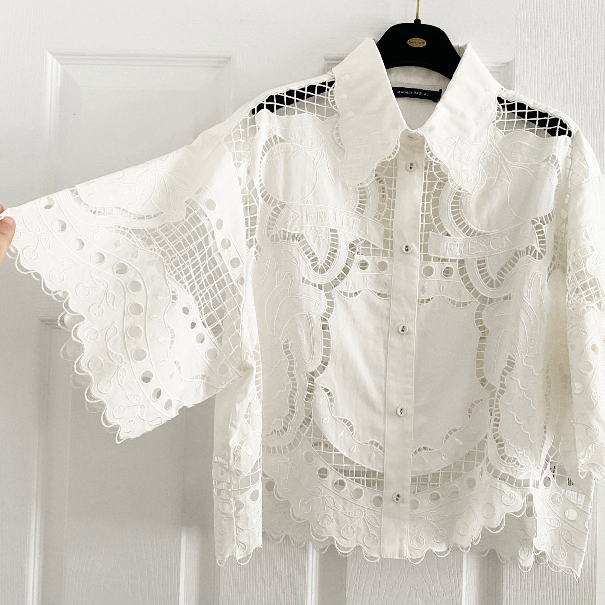 Magali Pascal "Frutta" Shirt in Off-White, Size Medium. Fits true to size, but could work for a small that wanted it a little looser/longer. Done in a stupidly beautiful cut-out embroidered fabric, drawing inspiration from the charm of vintage tablecloths and, also, apparently "the lively fruit markets of Southern Italy", which admittedly, I do completely see. I DIE over texture like this in a blouse in warm weather - so pretty back to a pair of linen trousers, or jeans! Button front closure. No lining - meaning yes, it is see through - I love this aspect of it - but you can wear a tank if thats not your thing. 22 inches armpit to armpit. Between 18 and 21 inches in length (the hem is wavy). 100% cotton. In excellent condition. Currently retailing for $620CAD, and selling here for $285CAD!