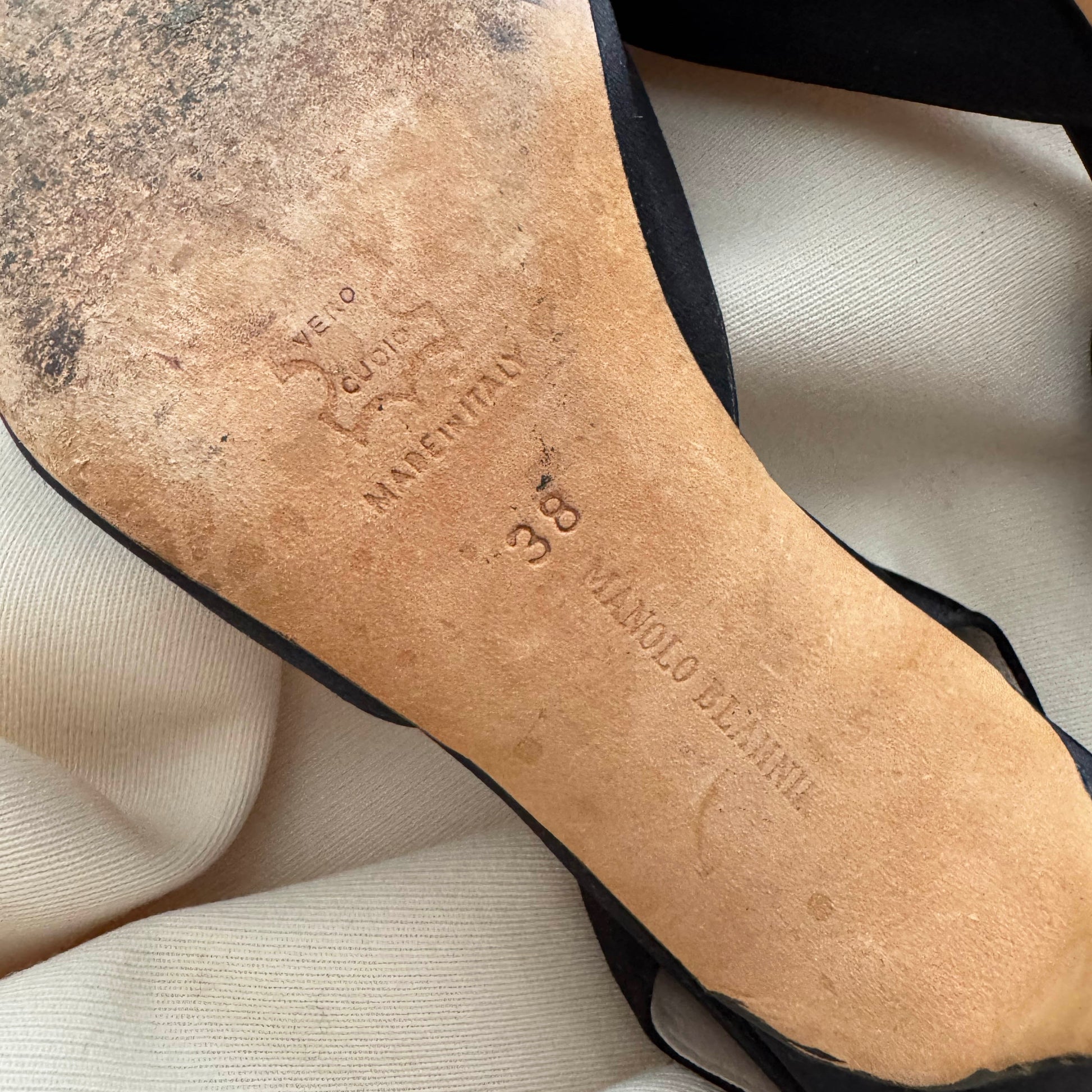 Manolo Blahnik "Carolyne" 90mm Satin Slingbacks in Black, size 38. An iconic silhouette from the brand - part of the timeless collection - perfect for that kinda Carolyn Besette Kennedy 90's minimalism vibe. Lightly worn and in great condition - tons of wear left in them! Does not come with original dustbags or box. Originally over $800CAD