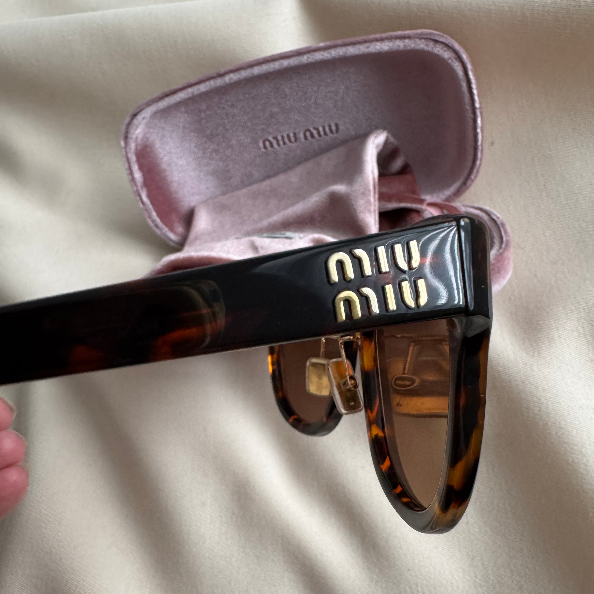 Miu Miu "01Z" Logo Sunglasses in Brown Tortoise. An elegant and dramatic frame - that also manages to feel really timeless in a beautiful warm tortoise brown. I just want to make a note about this - because I realllllly wish it was more common - but these have the nose bridge arms which help the glasses to stay up if you have a smaller nose bridge. Such a nice feature and a MUST for so many people. In excellent condition - maybe worn once or twice. Comes with original dustbag and case. Originally $550CAD, and selling here for $225CAD!