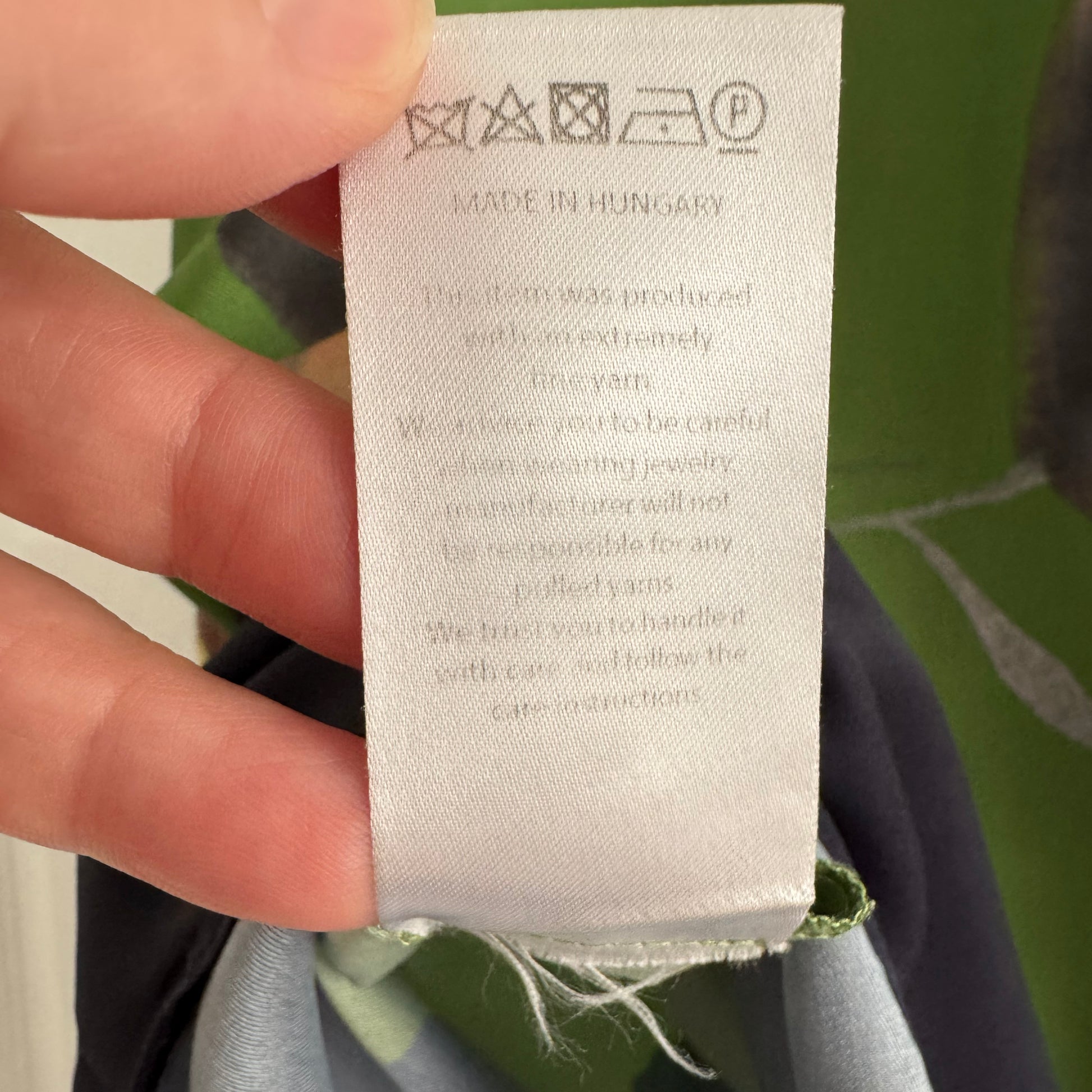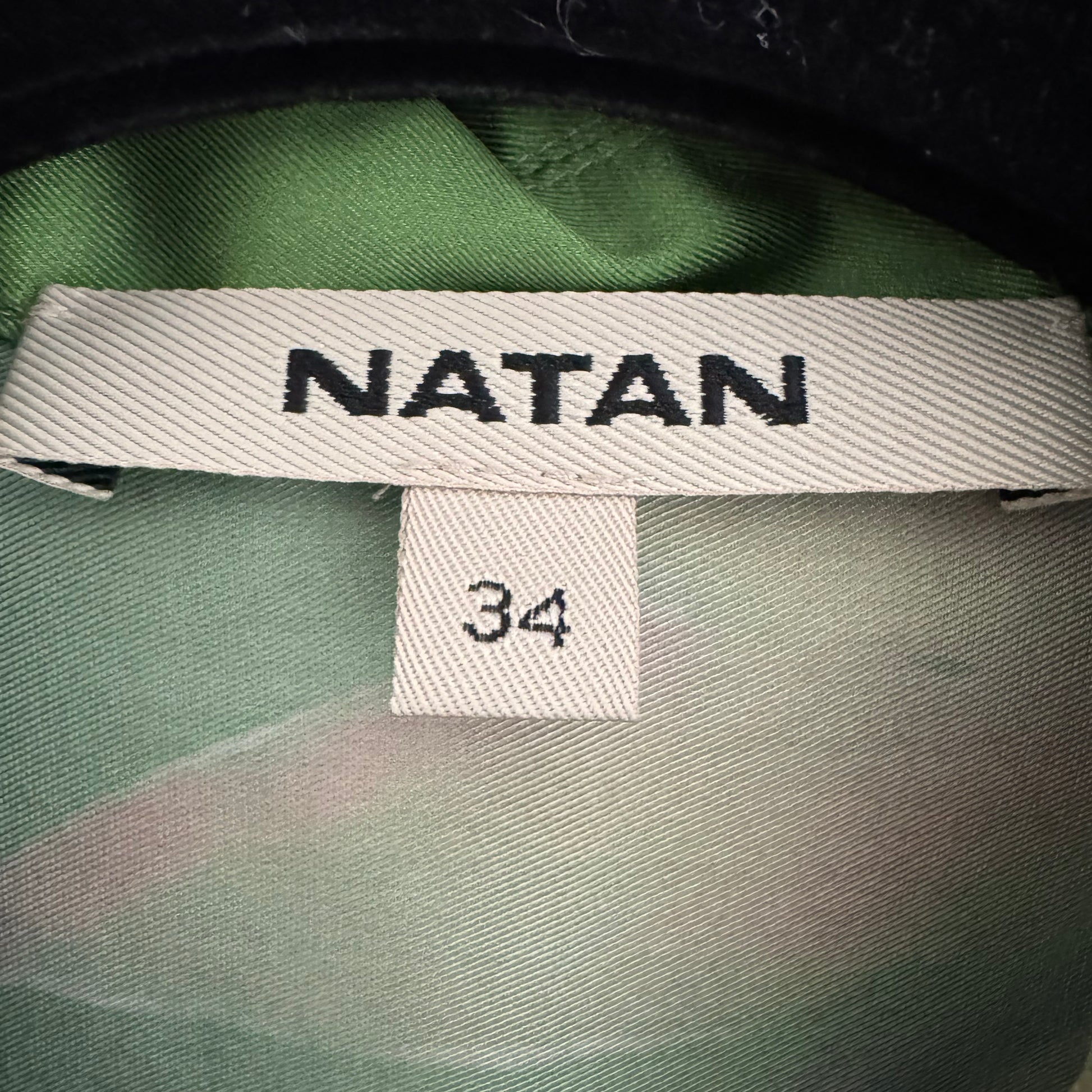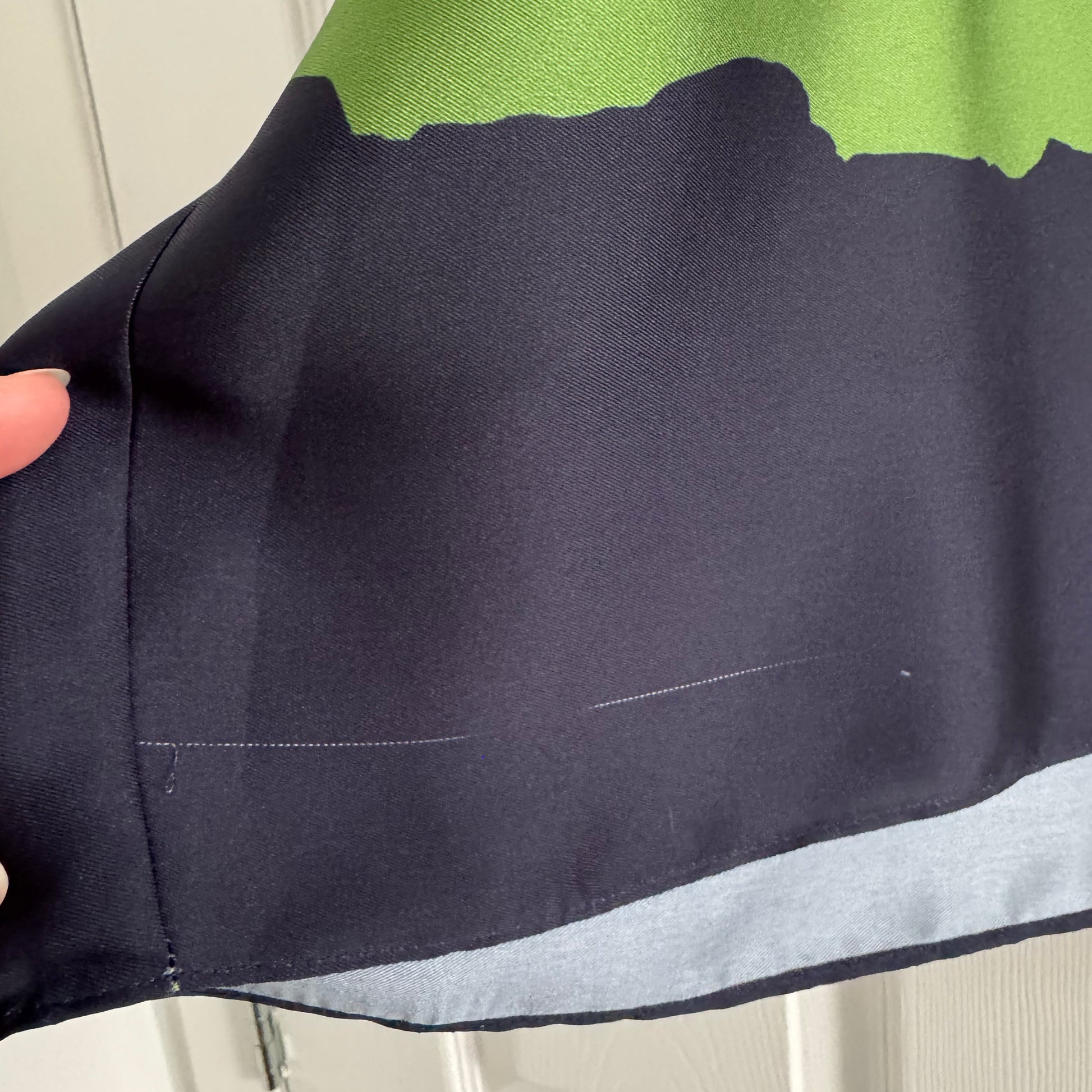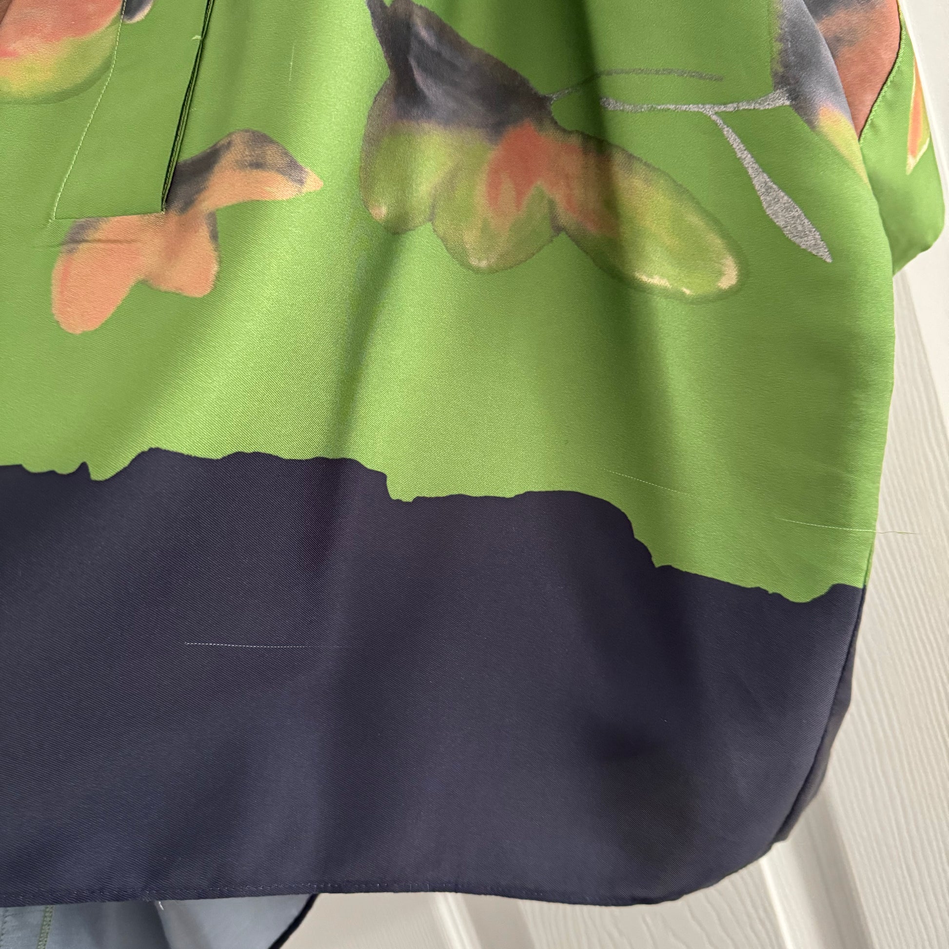 Natan Printed Silk Top in Green, size 34 (fits oversize, like what you'd expect from size small). Absolutely STUNNING! The fabric is SO gorgeous - it moves so beautifully (and feels so luxurious) that TBH I was 100% sure it was silk until I checked the tag. This Belgian brand is one I'd never heard of until researching this piece, but they've apparently been around since the 80's! Pair this beauty with the matching skirt from a complete look. About 22 inches in length at the front, and a few inches longer at the back. about 24 inches in width in the body. 100% polyester. Worn once and drycleaned, but there are some pulls in the fabric at the front, as shown! Originally around $850CAD, and selling here for $225CAD!