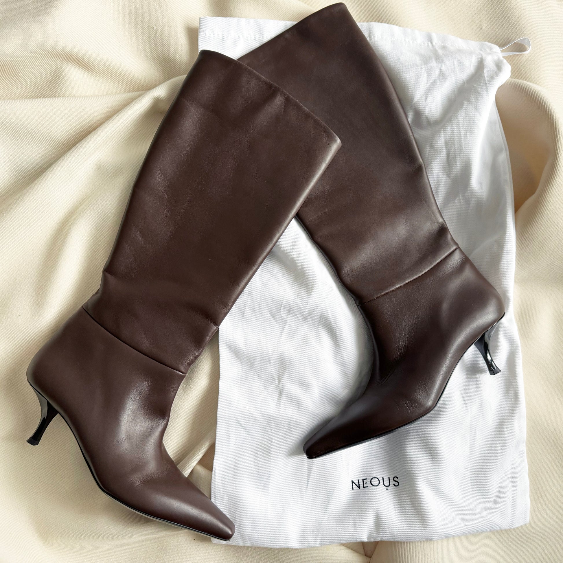 Neous "Rami Tubo" Knee-High 50mm Boots in Dark Brown, size 7. Fits true to size. Modern and sleek - with a heel height that covers all the bases! Perfect paired with midi skirts and dresses - for day or evening. 5 cm heel height. 100% Calfskin. Worn once and in excellent condition. Originally around $1700CAD, and selling here for $525CAD!