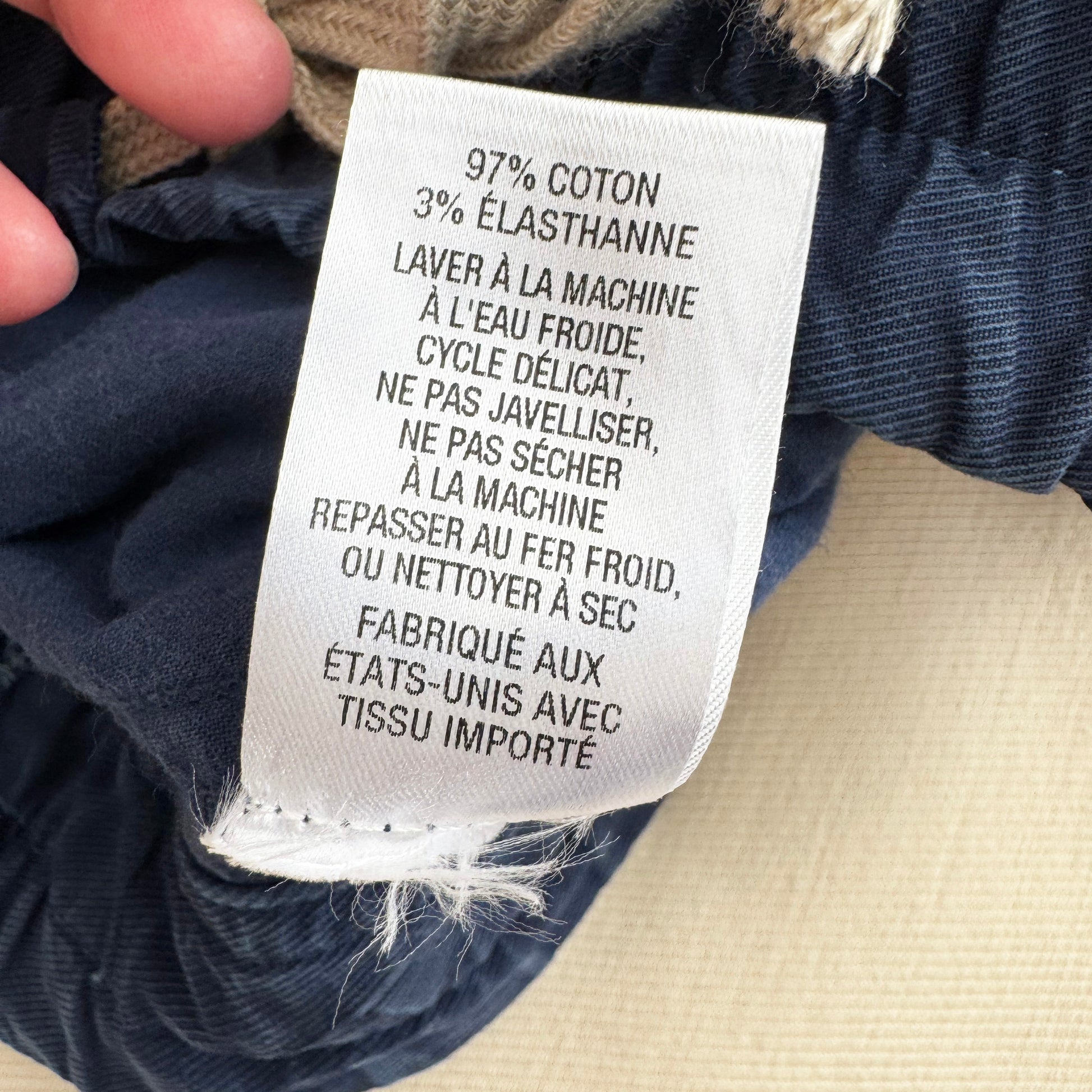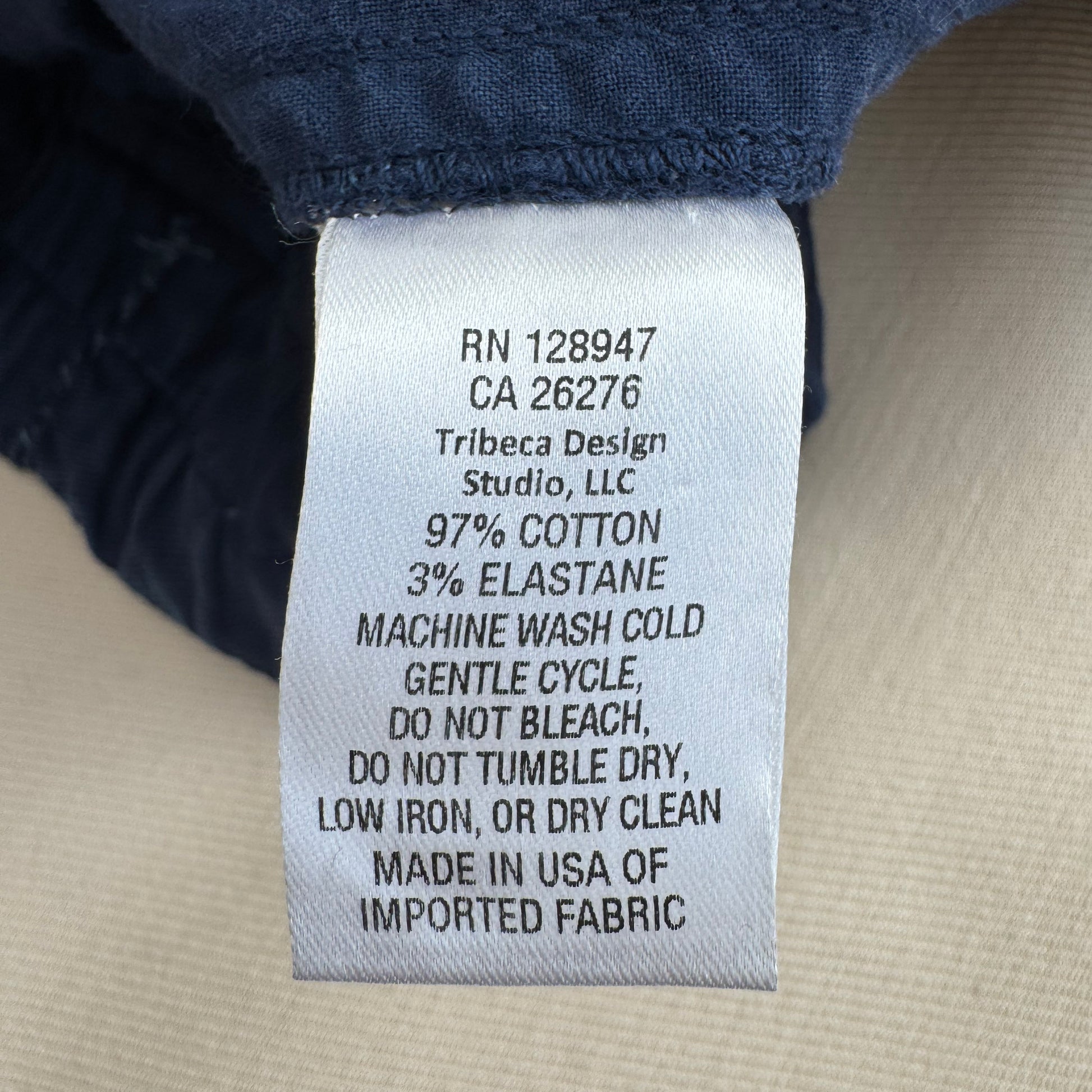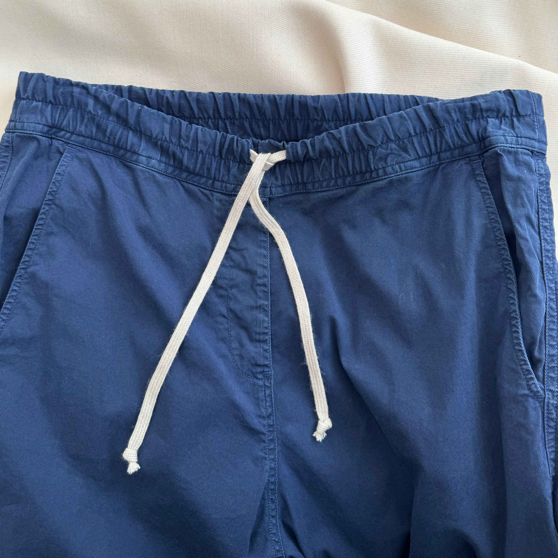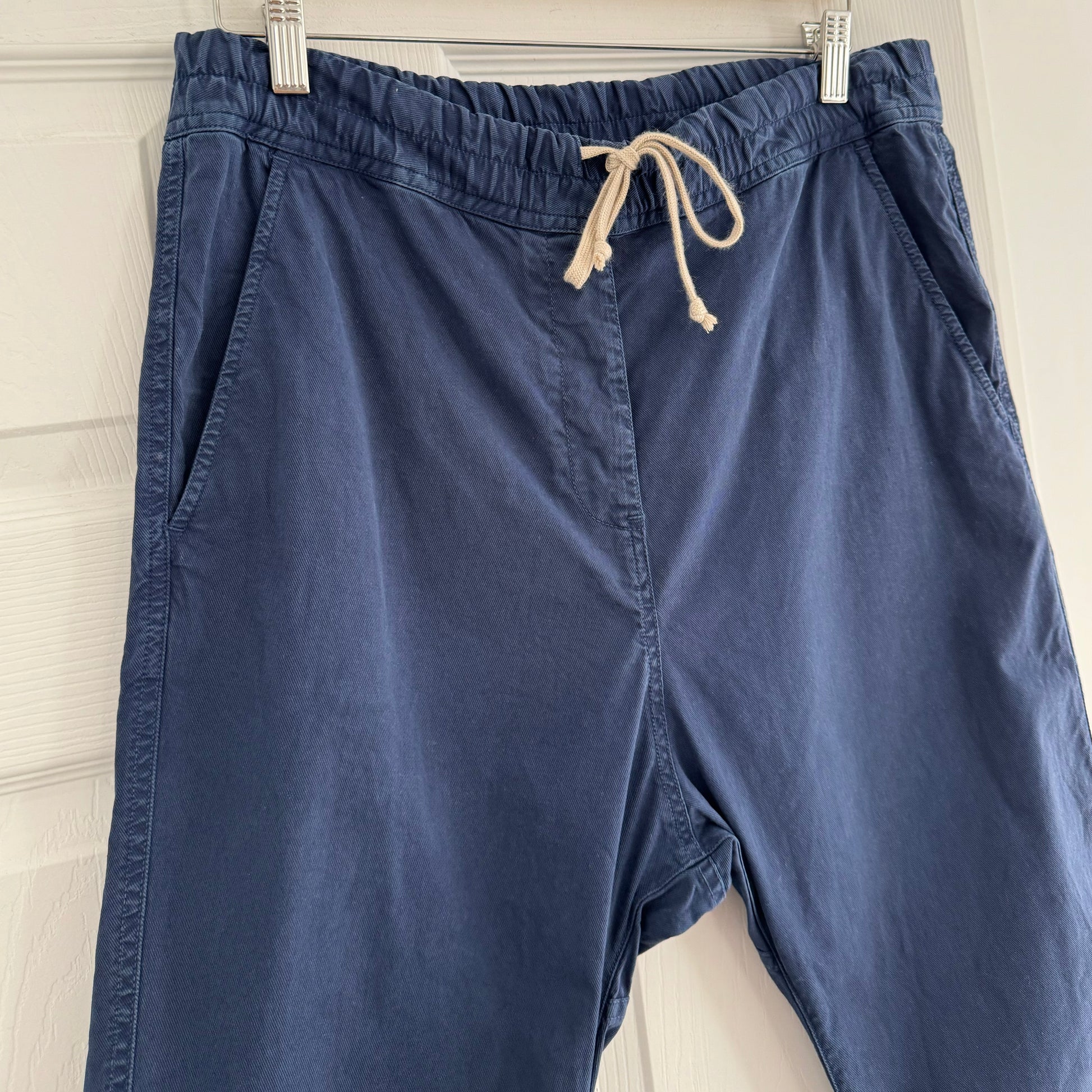 Nili Lotan "Casablanca" Pant in Marine, size Small. Fits true to size for an intended slouchy fit. A perfect lightweight cotton casual pant, with her signature drop crotch silhouette. These give a cool borrowed-from-the-boys feeling that's just perfection - and if you're a fan of the brand, it's really what we all love about her work so much! Pair with sneakers or sandals, or just about anything, depends on your mood. I find it works best to tuck just the front of your top in with the drop crotch pants, so that you can see the silhouette. The waistband measures a max of 18 inches flat (there is no fly, so it pulls on over the butt - so these might be tricky if you're curvy and your hips are larger than 36 inches - the waist can then be cinched as needed with the drawstring). 34 inches total length, where it hits the ankles will depend on where it sits on your waist, and your height of course. 97% cotton, 3% elastane. Lightly worn and in good condition. Originally $500CAD, and selling here for $135CAD!