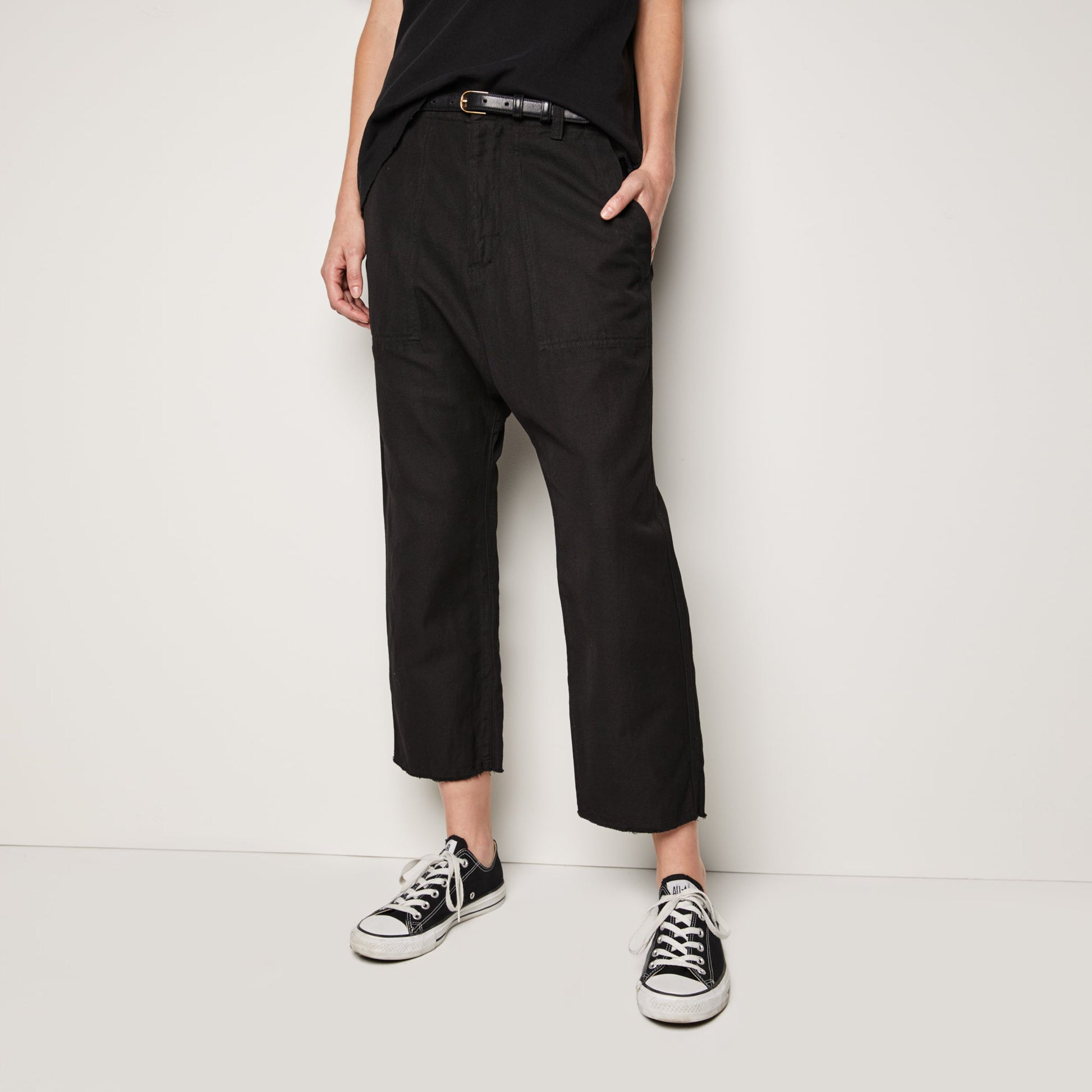 Nili Lotan "Luna" Pants in Black, size 2. Fits true to size for a comfy fit (good for say, like a solid 26 in denim). Done in the MOST beautiful cotton/linen blend twill fabric on earth - they feature a drop crotch and a frayed hem. Confusing to men as WHY we wouldn't want to wear a tight fitted pant - perhaps half the fun? Definitely a factor anyway. They're super comfy and are great when it's warm out. I like them best paired with sandals. The actual waistband, which is meant to sit on the hip, is 31.5 inches. Where they hit your ankle will depend on where you sit them on the hip, but the total length is 35 inches. 64% cotton, 36% linen. Worn less than a handful of times and in very good condition. Originally like $500CAD, and selling here for $165CAD!