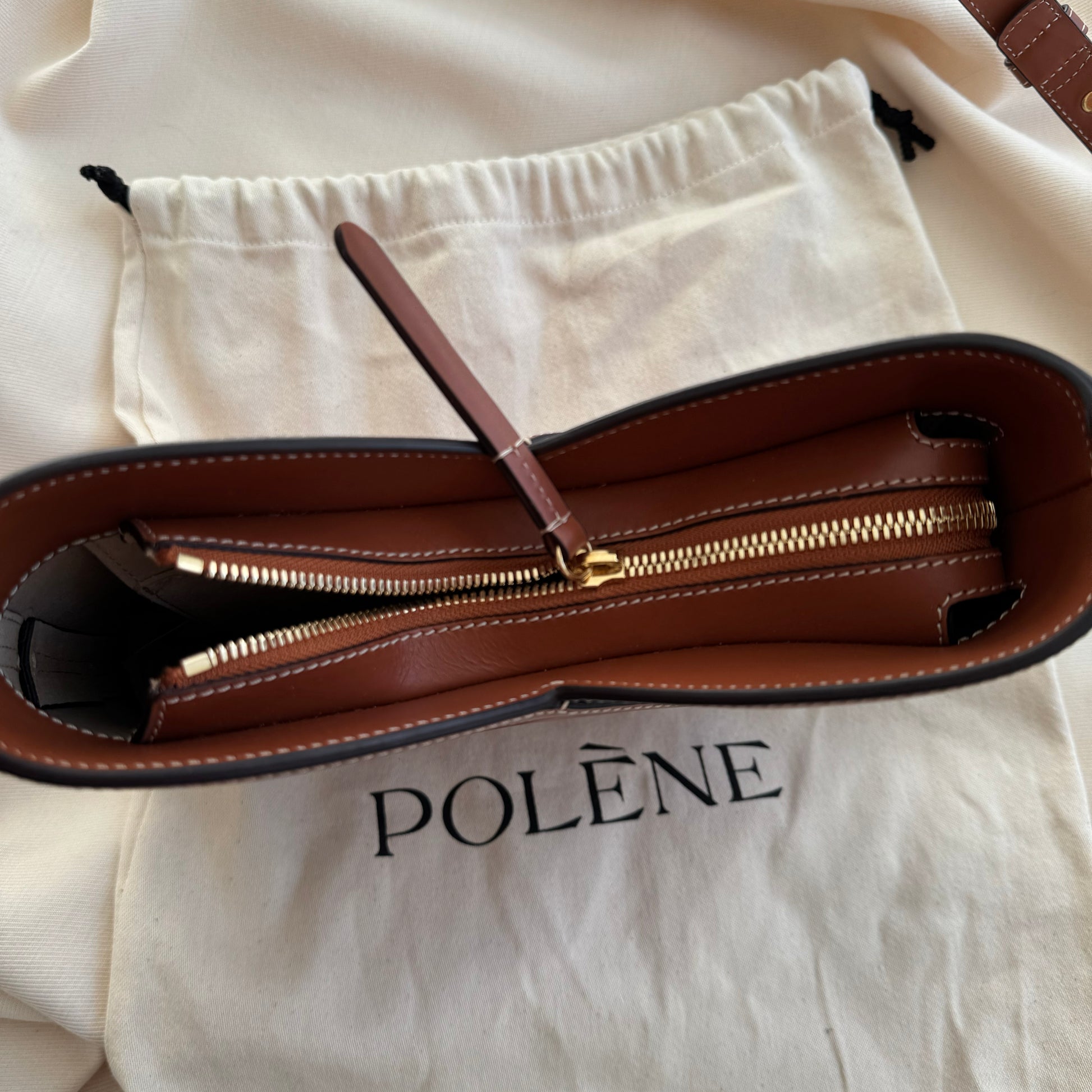 Polene "Nodde" Hobo in Smooth Cognac. Named after the French word “nœud” meaning a bow or knot, is made of two sections of interlocking leather creating perfect symmetry. It has an adjustable shoulder strap (ranging from 52 to 105 cm), and can be worn on the shoulder or as a crossbody. It has a zip closure at the top, which I will admit does not open very wide, as the bag is structured! Suede interior pocket.Zippered outer closure. Dimensions: 26 x 28 x 6 cm. Weight: 725 g. Certified smooth full-grain Italian calf leather. Interior in Italian suede leather. In excellent condition. Used maybe once, and there is a very tiny little mark by the logo. Comes with dustbag. Currently selling for $680CAD, and selling here for $445CAD!