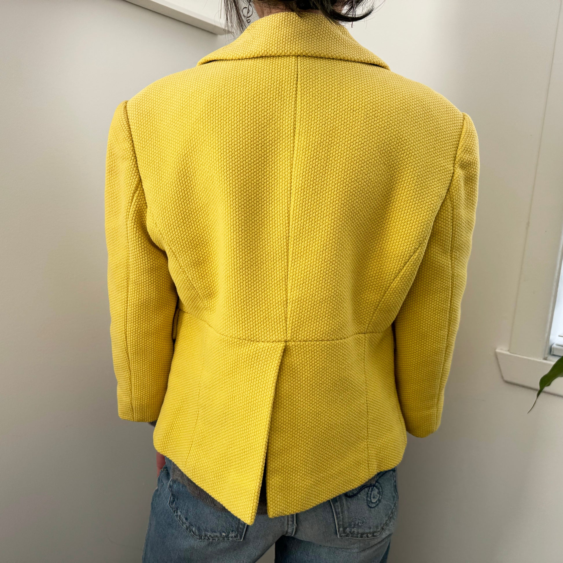 Ports 1961 Yellow Cotton Jacket, size 6 (fits like a size XS/S, and ideal for someone petite, since it is a shrunken silhouette). Such a beautiful colour, and in a beautiful textured fabric that really sets it apart - this company make THE MOST beautiful stuff. The buttons?? I mean, like, so beautiful - the mother of pearl is so stunning. 20 inches from shoulder to hem. 18.5 inches from armpit to armpit. 100% cotton. Worn maybe once and in excellent condition. The pockets are even still sewn shut!