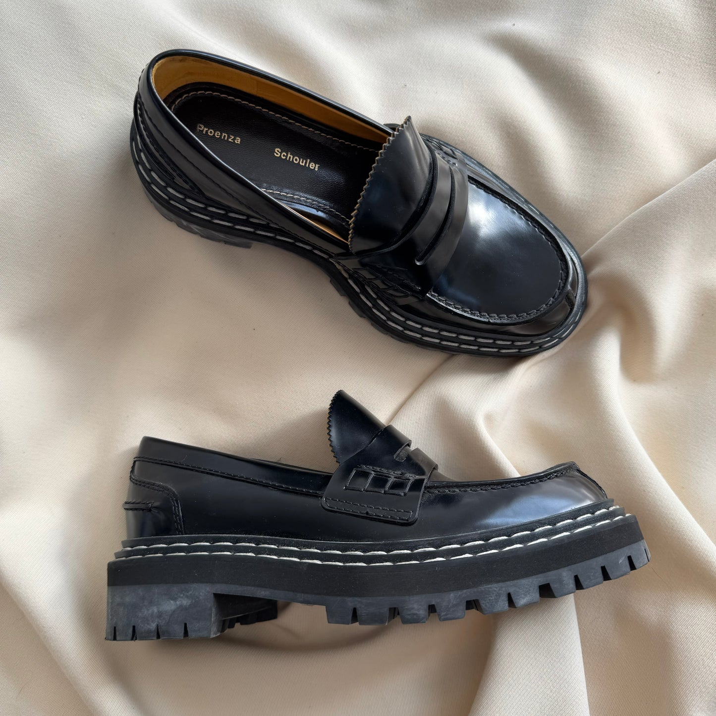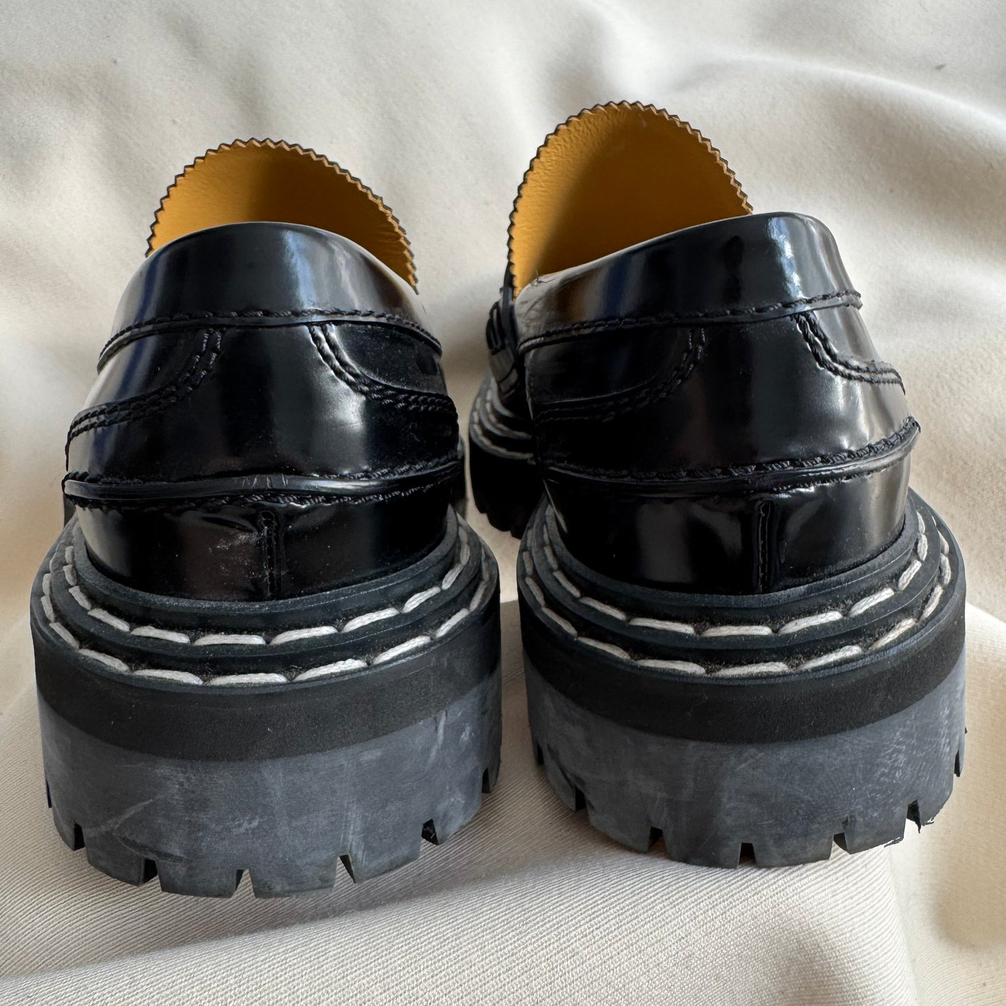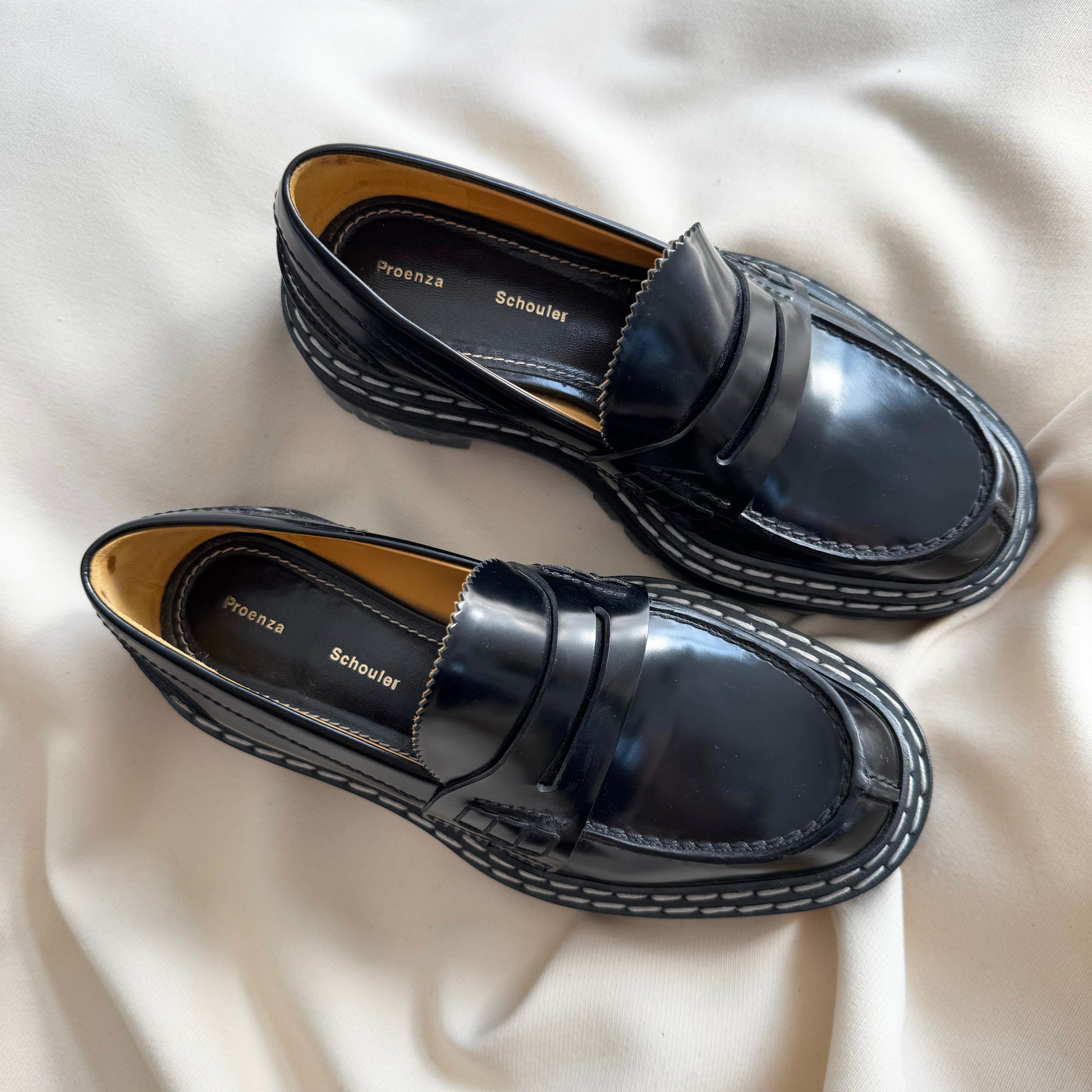 Proenza Schouler Black Lug Sole Loafers, size 37.5. Fits true to size. Absolutely immaculate vibes! An elevated take on the classic penny loafer here from the designers who are also now creative directors at Loewe! These are made from glossed-leather and have serrated trims along the tongues. Wear yours with tailored shorts or skirts. In excellent condition - does not come with box or dustbags though! Currently retailing for $1300CAD, and selling here for $425CAD!