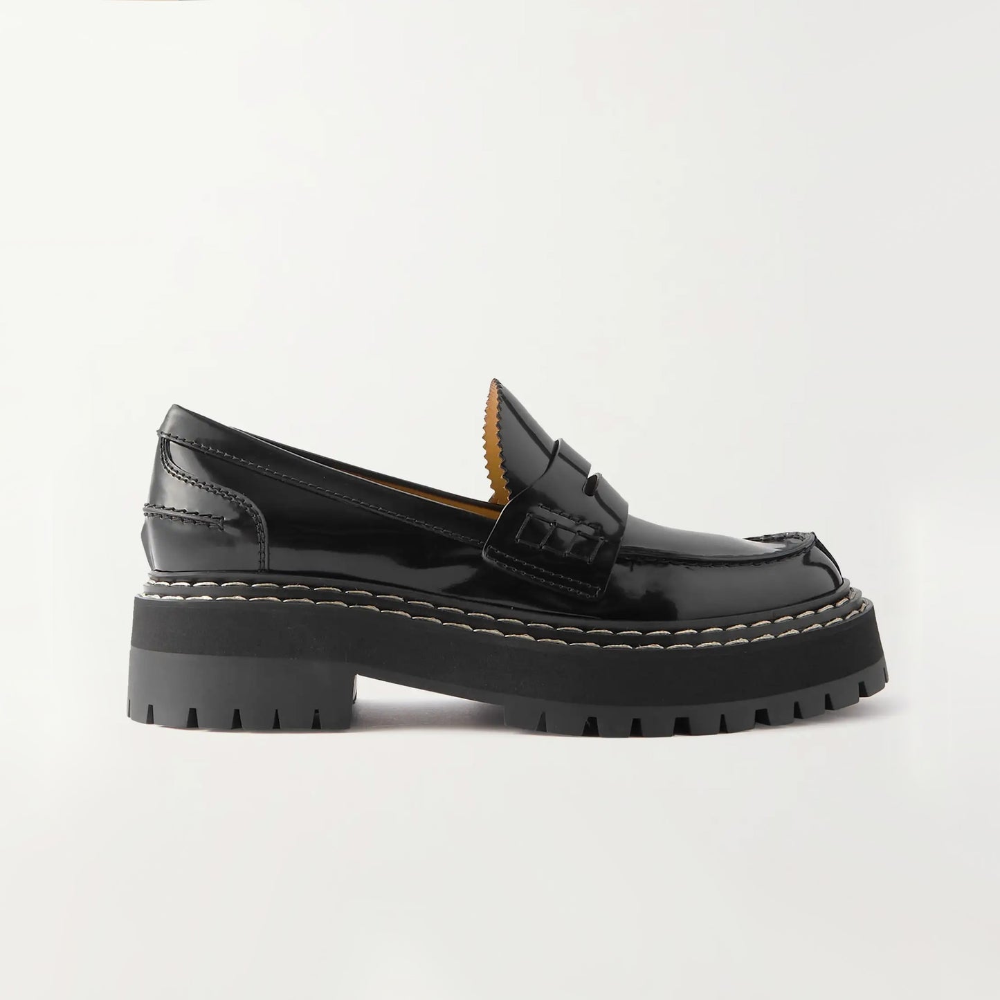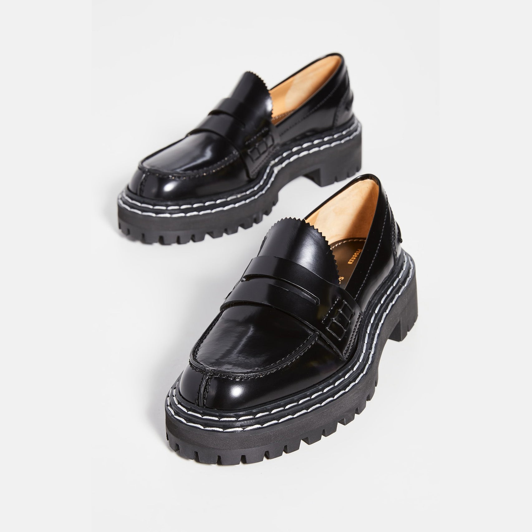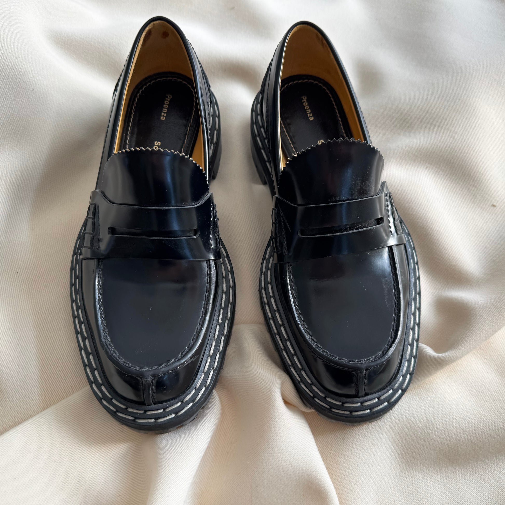 Proenza Schouler Black Lug Sole Loafers, size 37.5. Fits true to size. Absolutely immaculate vibes! An elevated take on the classic penny loafer here from the designers who are also now creative directors at Loewe! These are made from glossed-leather and have serrated trims along the tongues. Wear yours with tailored shorts or skirts. In excellent condition - does not come with box or dustbags though! Currently retailing for $1300CAD, and selling here for $425CAD!