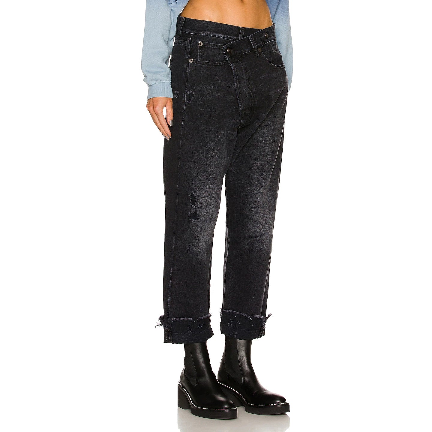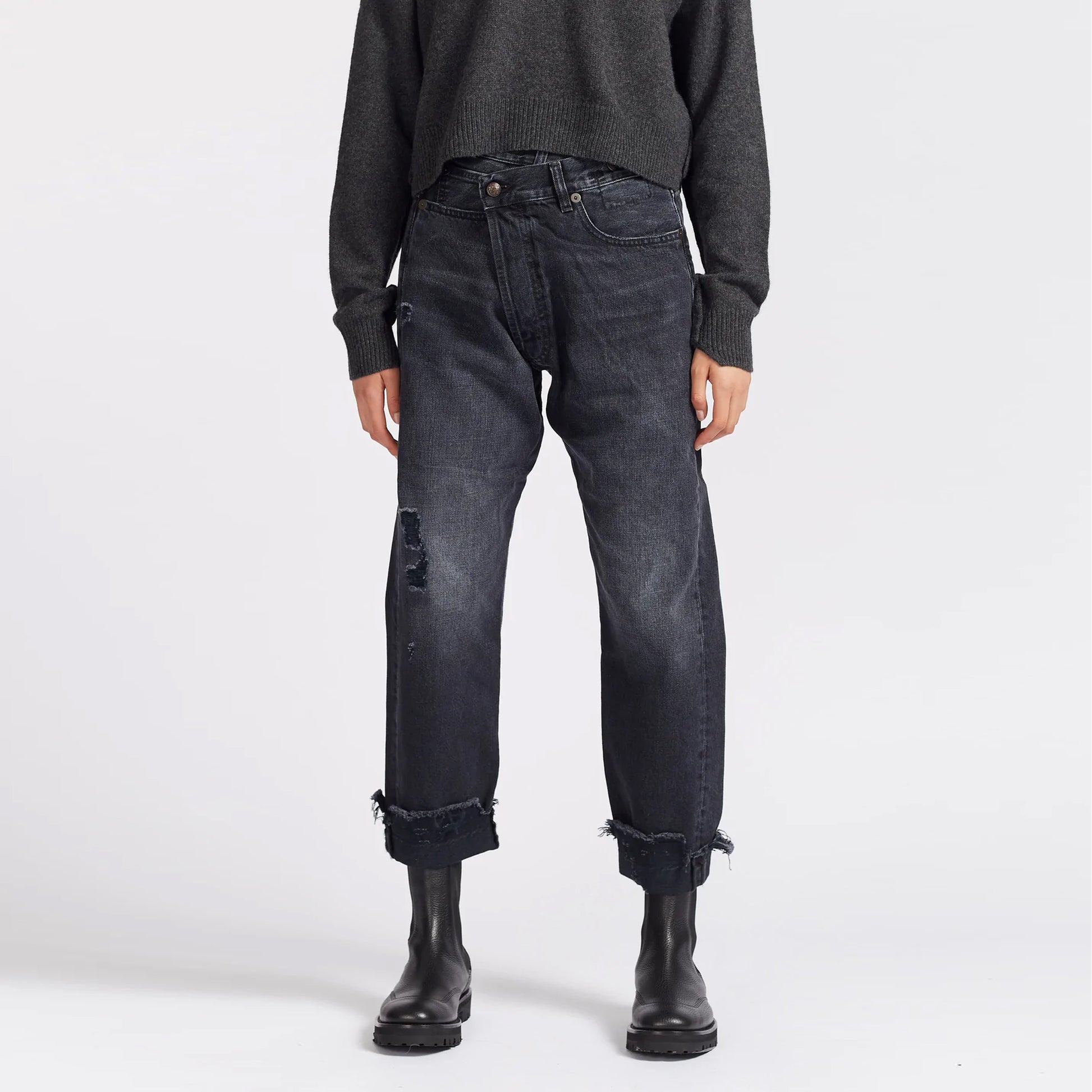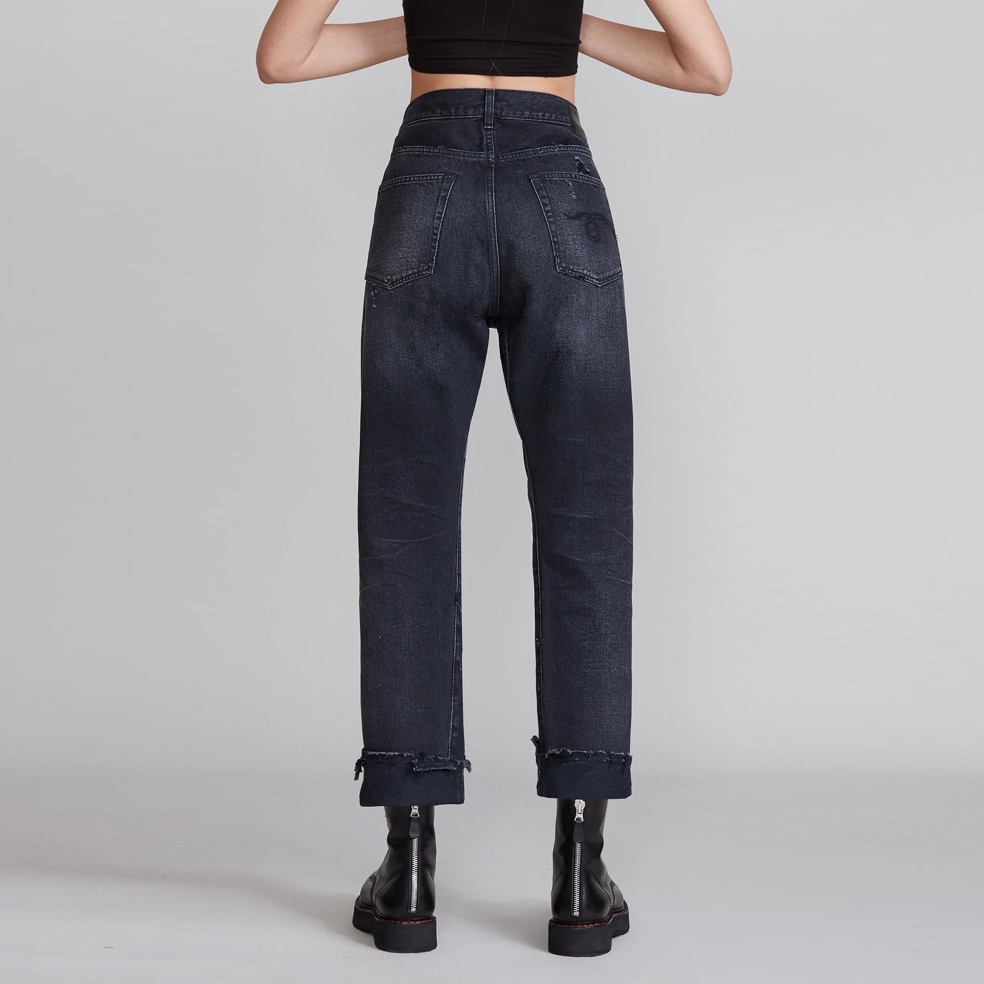 R13 Crossover Jeans in Jake Black, size 27 (fits 28). Rebellious and cool - everyday but interesting - R13 makes amazing jeans but the crossover is a beauty if you don't want something too conventional. Distressed details throughout give these lots of texture - and can be worn cuffed or uncuffed, as you prefer. 16.25 inches waistband, measured flat. 38.5 inches total length, uncuffed. Where it hits your ankles depends on where you sit it on the waist! 100% cotton. In excellent condition. Originally around $650CAD, and selling here for $295CAD!