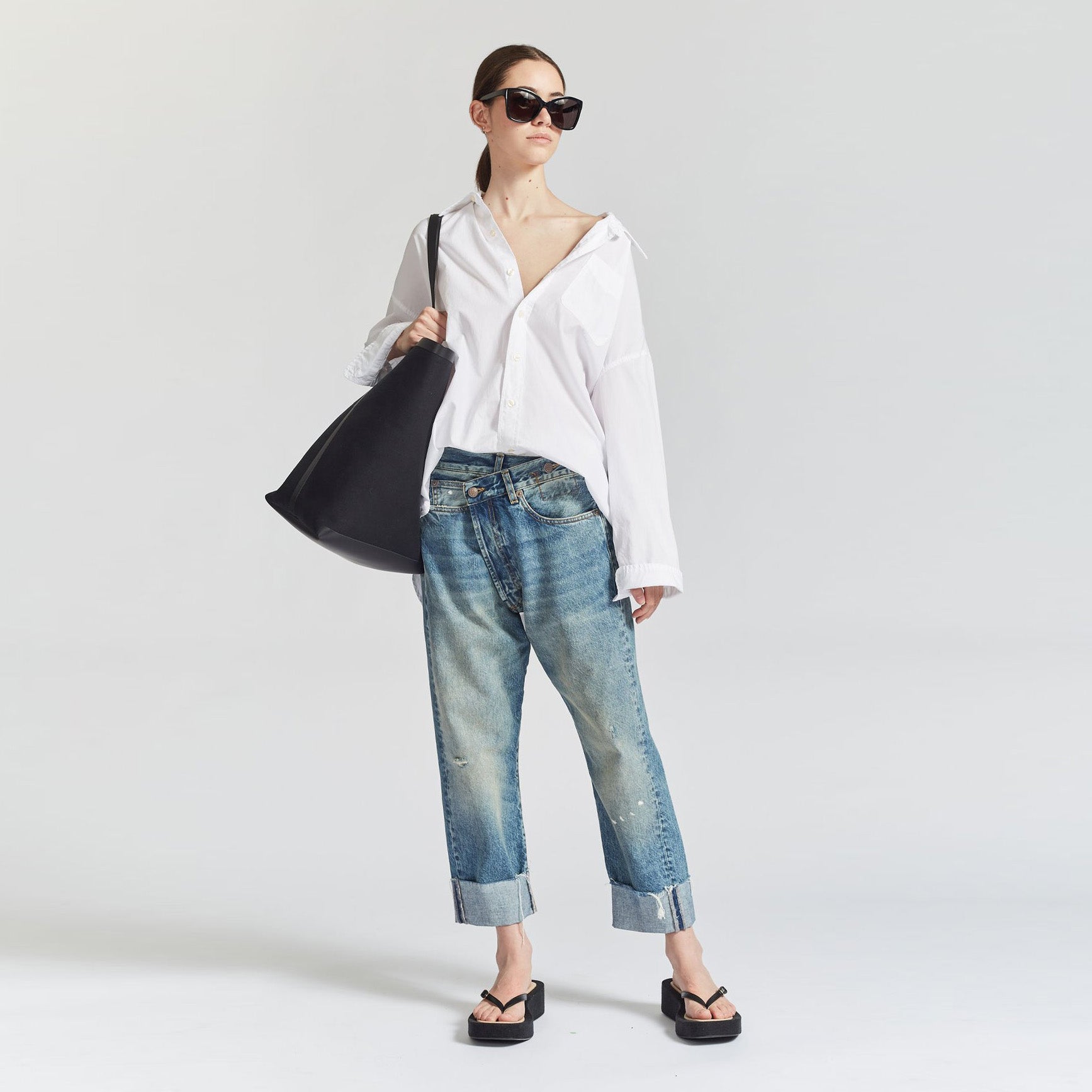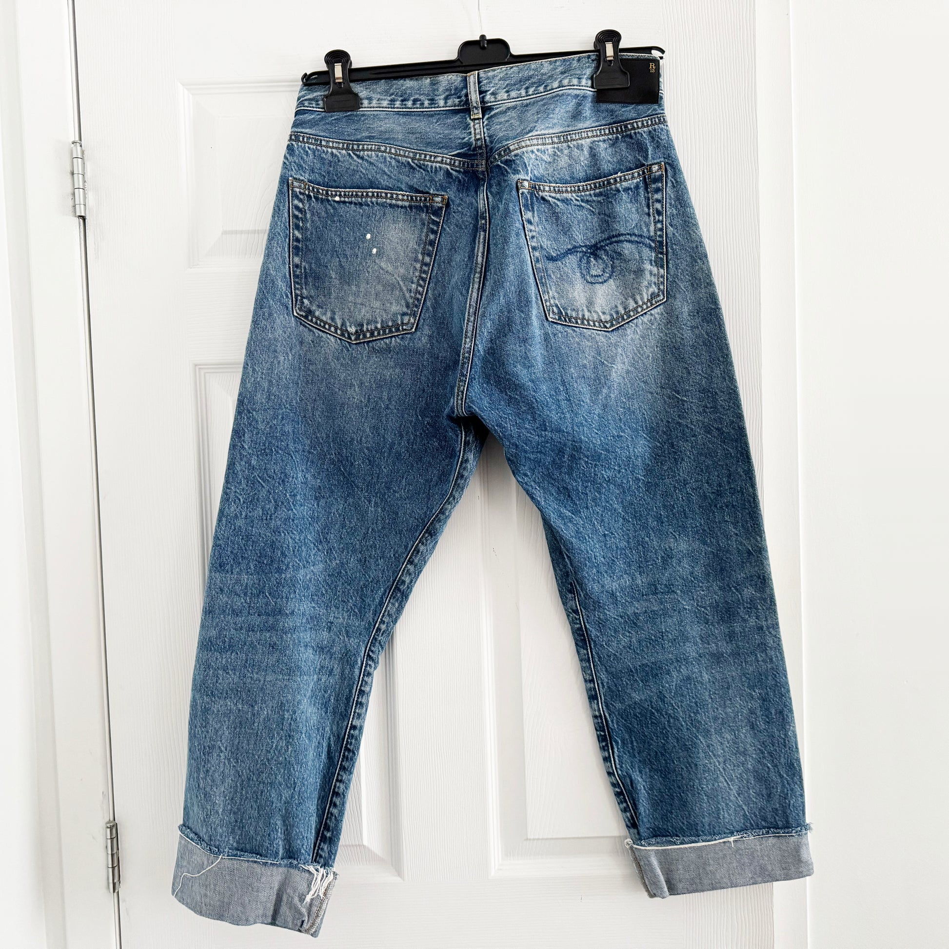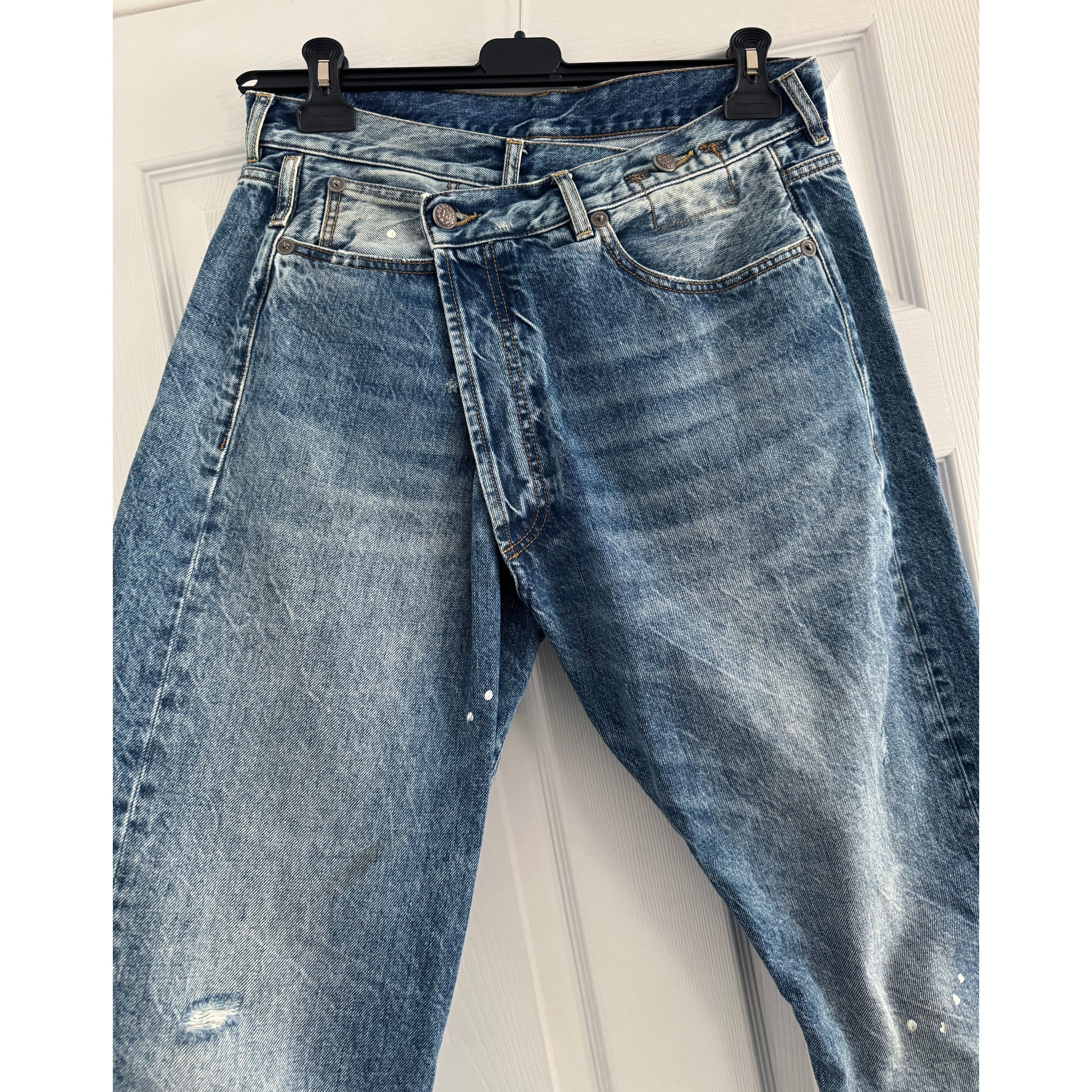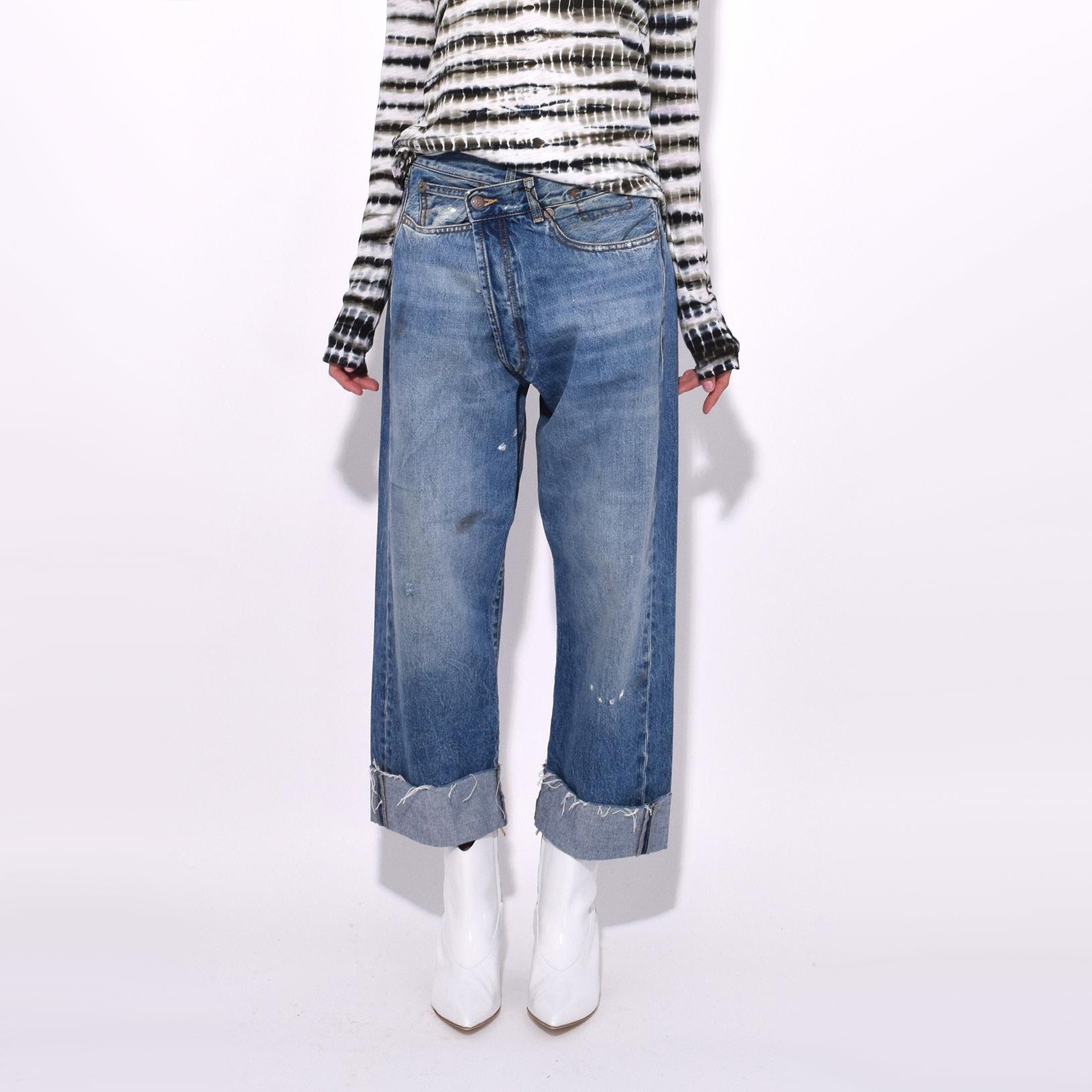 R13 Crossover Jeans in Jasper w Smudge, size 28 (fits 29). The perfect mix of cool and comfy - this loose style with an asymmetrical fly from R13 is awesome styled with a chunky boot in bad weather, and sandals or slides come warmer temps! Just tuck in the front of whatever top you've got on to show off the design of the fly, and you're done! This wash is a beautiful distressed blue - it has paint stains and actual stains too (they won't come out - they're supposed to be there! haha).100% cotton. In excellent condition. Originally retailed for like $650-700CAD, and selling here for $245CAD!