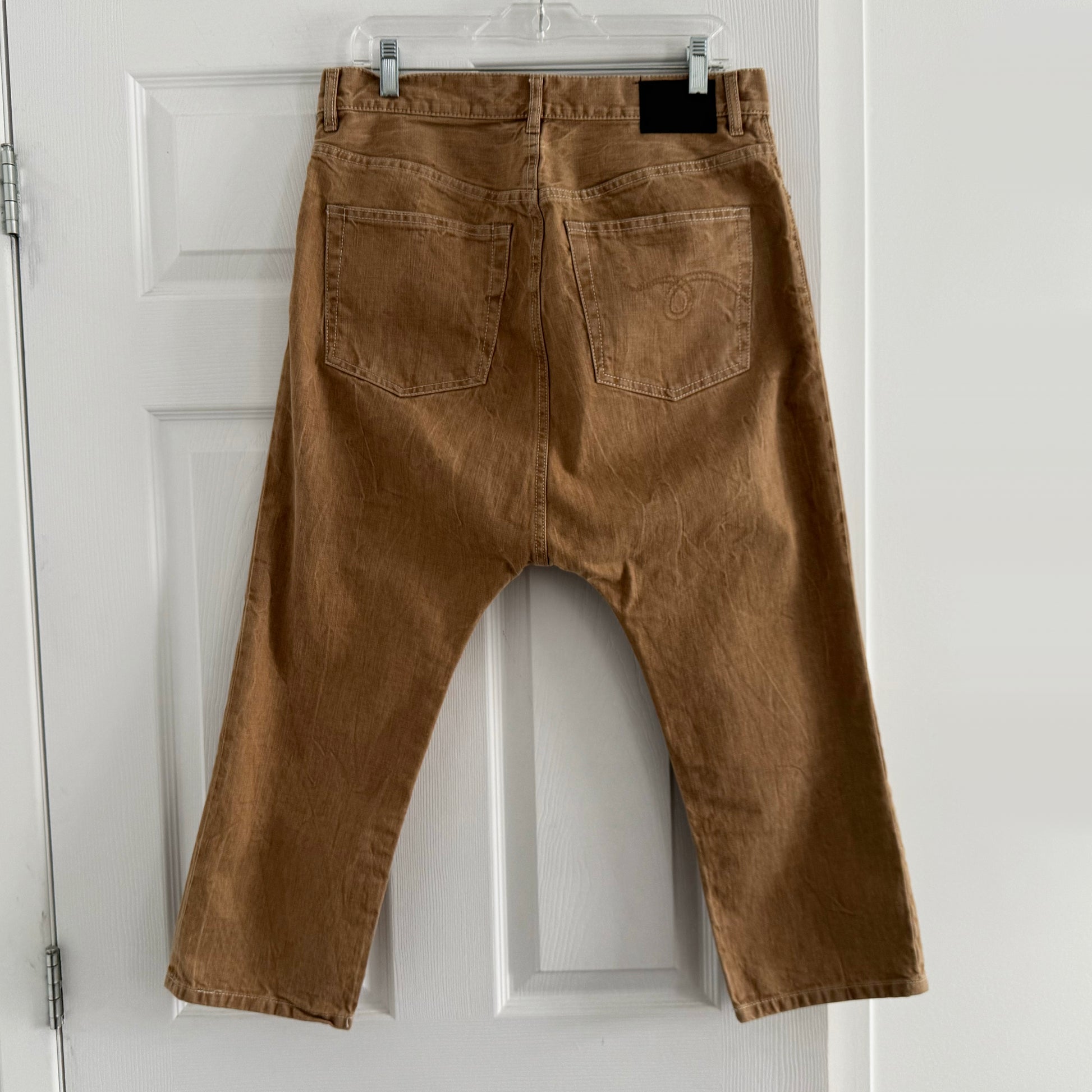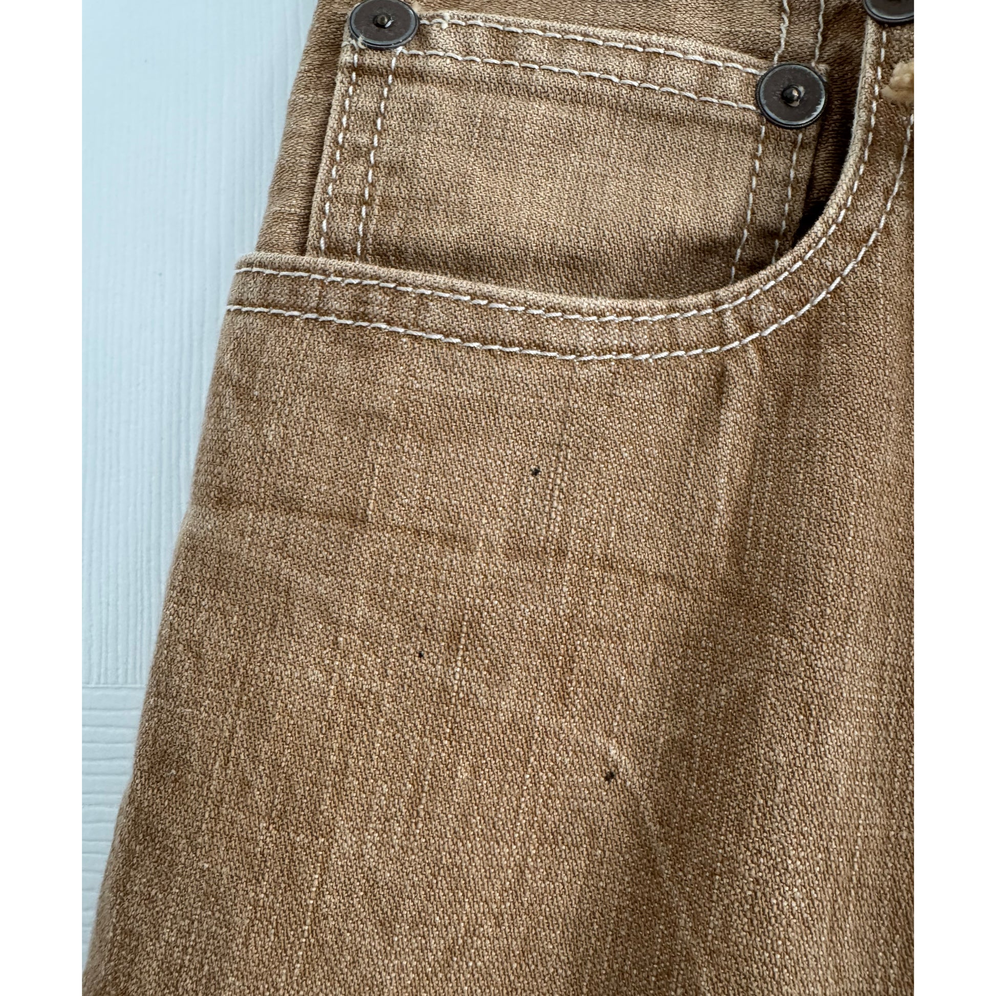 R13 tailored drop jean in "Kurtis Khaki", size 28. Fits true to size. 34 inches actual waistband, which is meant to sit low and slouchy on the hips. 34 inches total length - where it hits you on the leg will depend on where you sit it at the waist. 16 inches from waist to crotch, taken with a grain of salt since of course, it's a drop crotch. 100% cotton. In very good condition - they feel like they've been worn like twice, but there are some tiny black dots on the front on the left side. They are hard to see - and COULD be part of the original design - but I don't THINK so? They look like pin size marks of permanent pen to my eyes, and I was not able to remove them. Originally retailed for $700CAD, and selling here for $195CAD!
