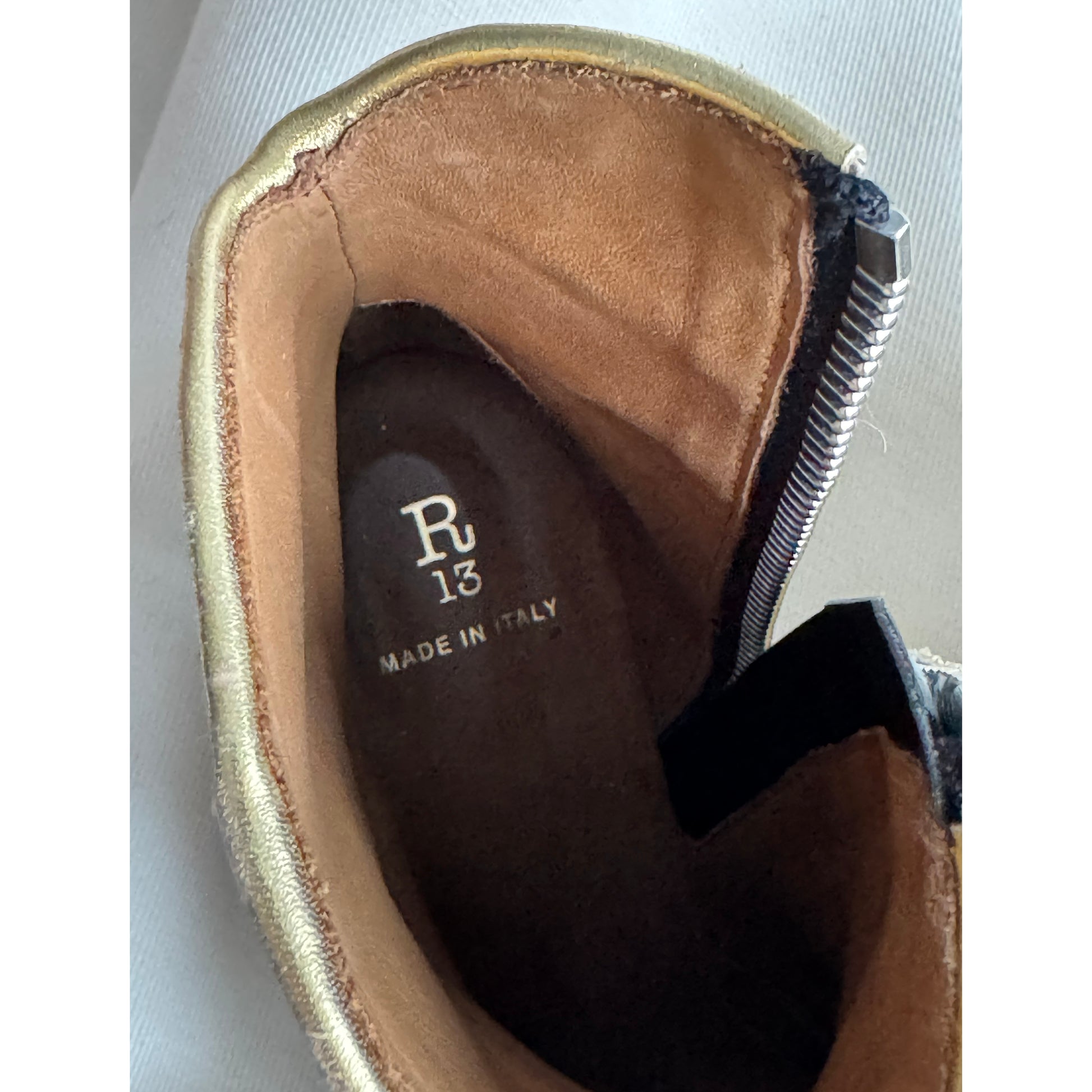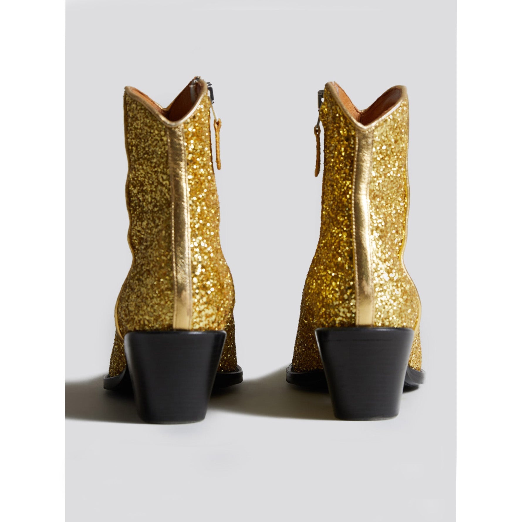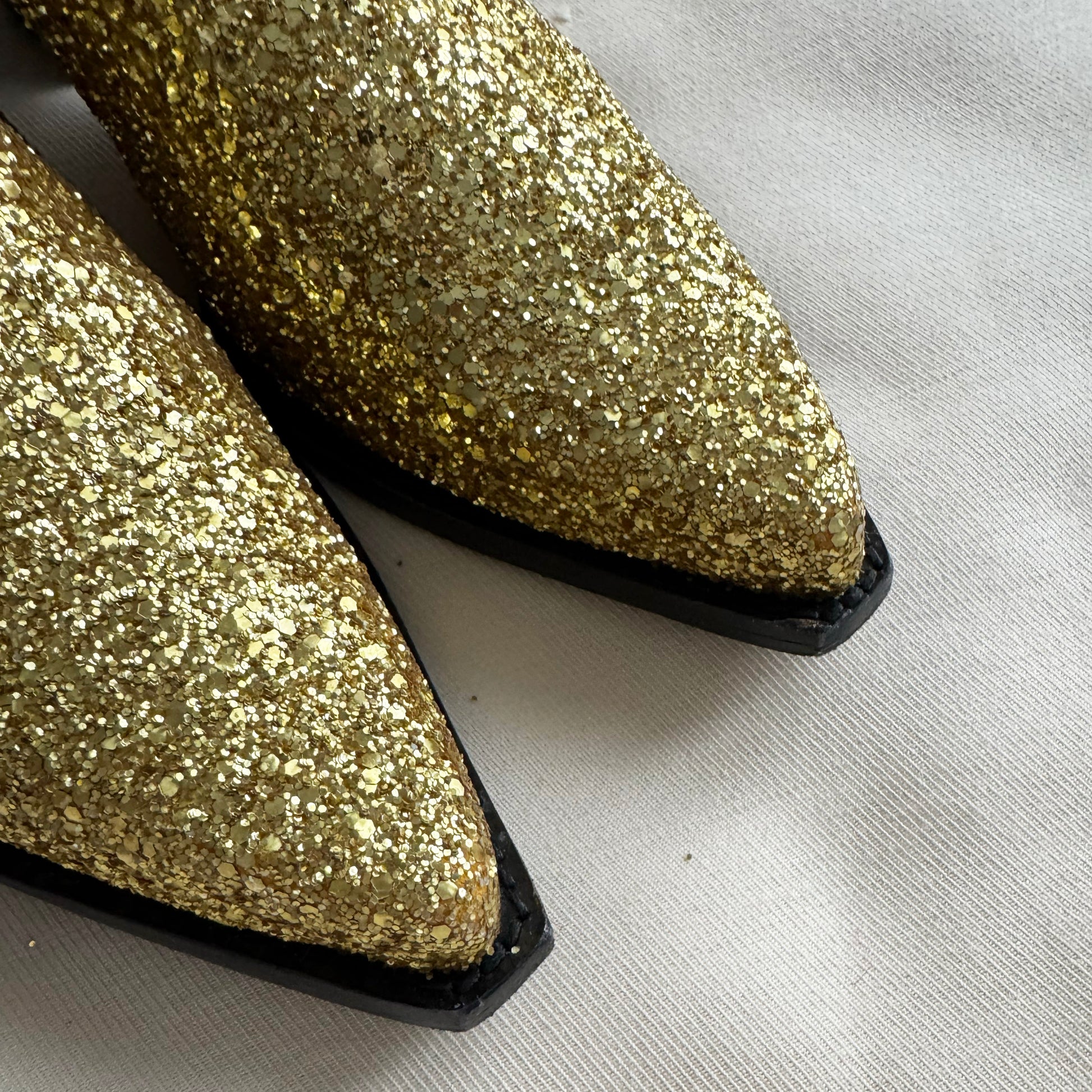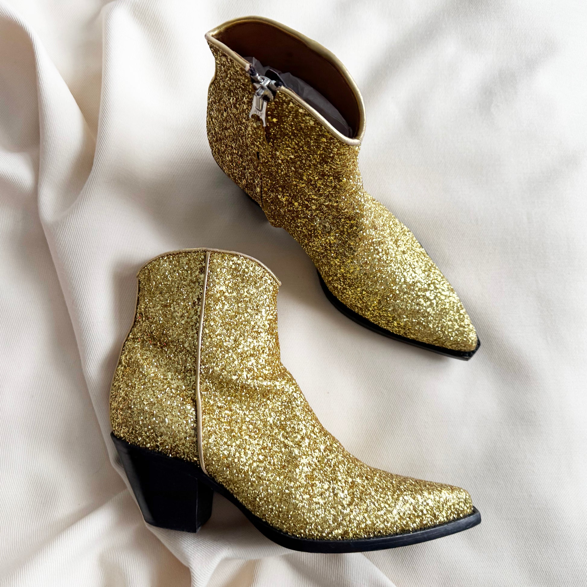 R13 Western Boots in Gold Sequin, size 41. Fits 10-10.5 depending on if you have wider or narrower feet. ABSOLUTELY WILD!! For the girl who loves to have fun with accessories - these are so amazing! R13 makes some incredible footwear - so I mean, yes these will be definitely amazing with jeans - but would also be a fabulous alternative to heels for a night out (with anything from a suit to a dress!). Worn maybe like once? In excellent condition, but does not come with the original box or dustbags. Originally $1920CAD, and selling here for $525CAD!