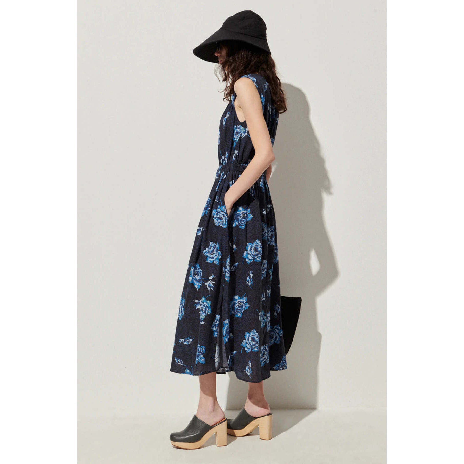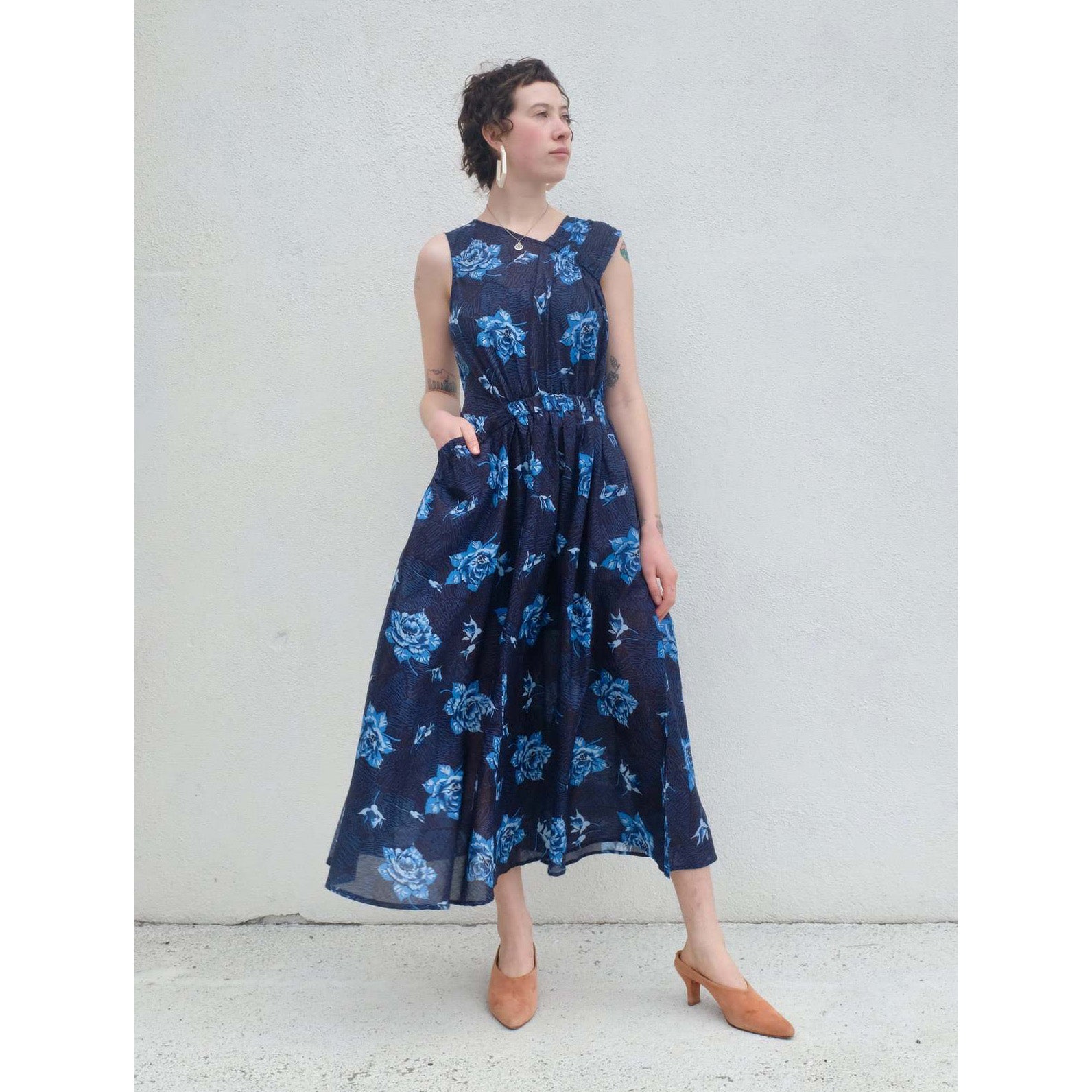 Such a pretty light cotton sleeveless dress - featuring an asymmetrical neckline with asymetrical gathering at the shoulder and waist. This dress has a side pocket and front pocket, button at the back of the neck and includes a detachable slip, so you can layer to your liking. 50 inches in length. 21 inches armpit to armpit. 100% Cotton. Lightly worn and freshly drycleaned - in very good condition. Originally $600CAD, and selling here for $175CAD!