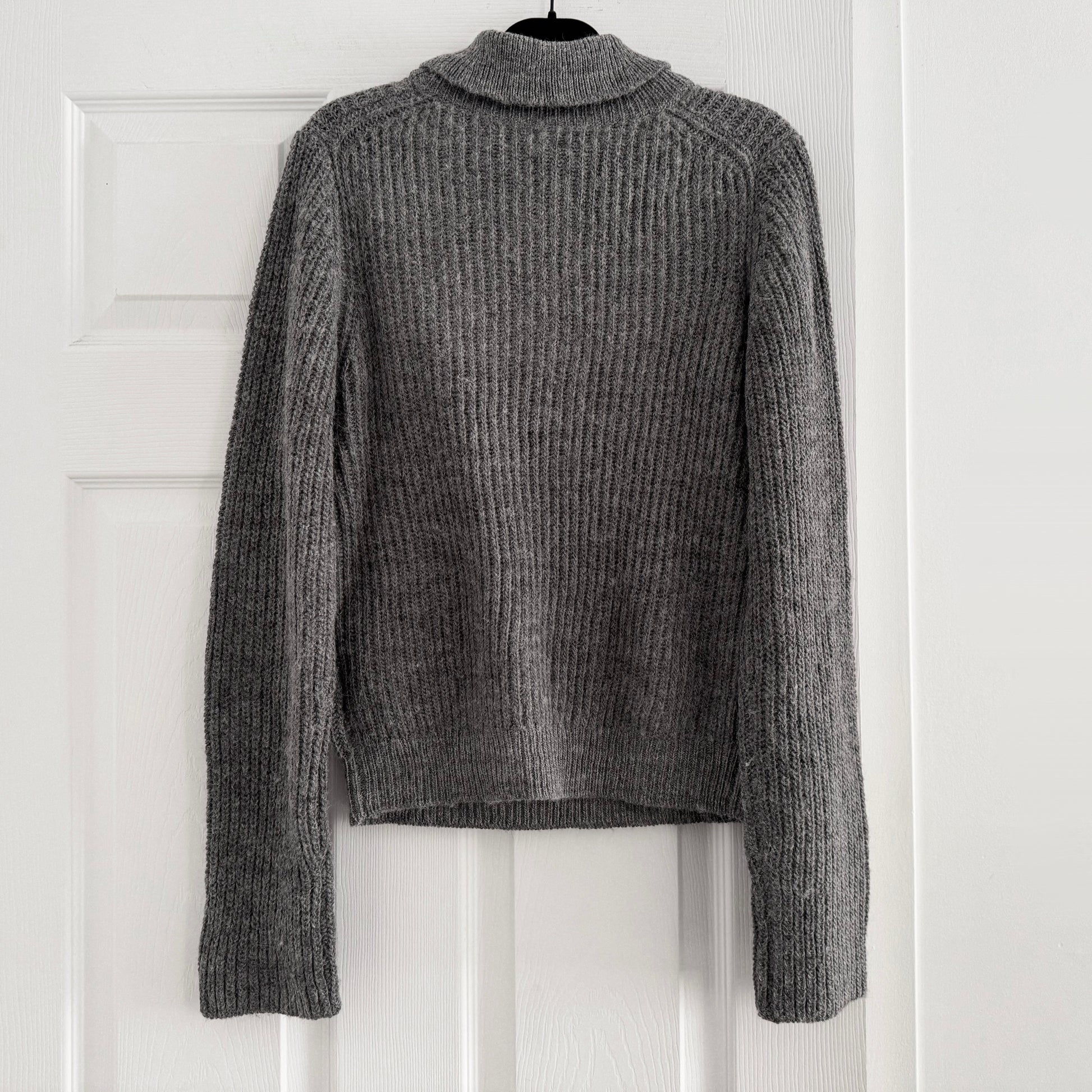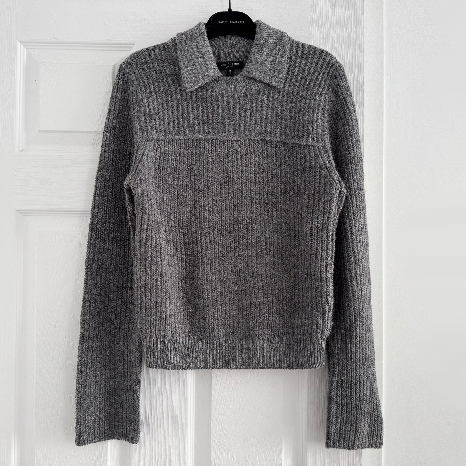 Rag&Bone "Madix" Sweater in Grey, size Medium. Fits true to size for a close fit. Such cute preppy vibes with that little collar - perfect with a pant or a skirt! 18 inches armpit to armpit. 22.5 inches in length. 42% wool, 32% acrylic, 26% alpaca. In excellent condition. Originally $488CAD, and selling here for $125CAD!