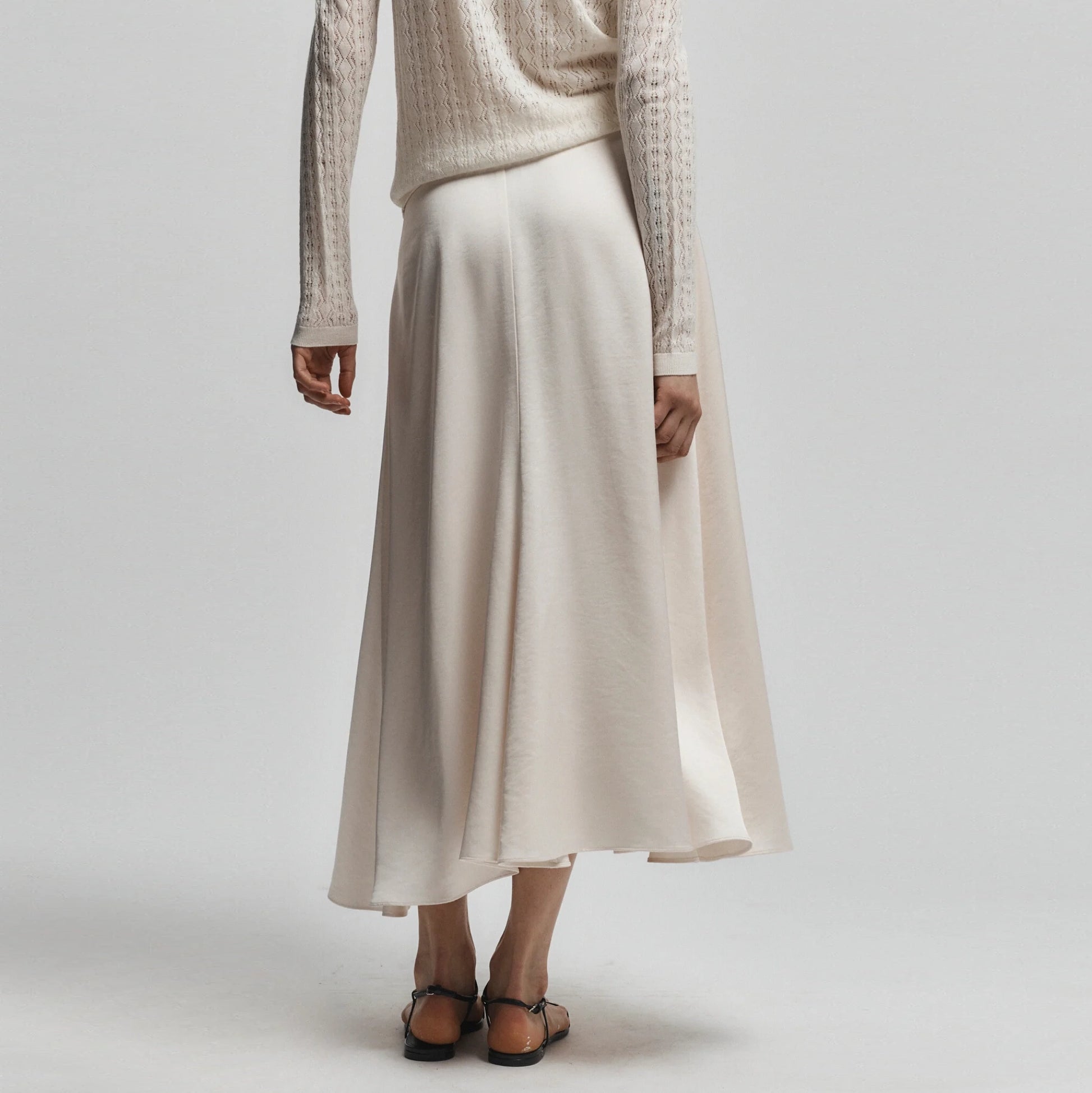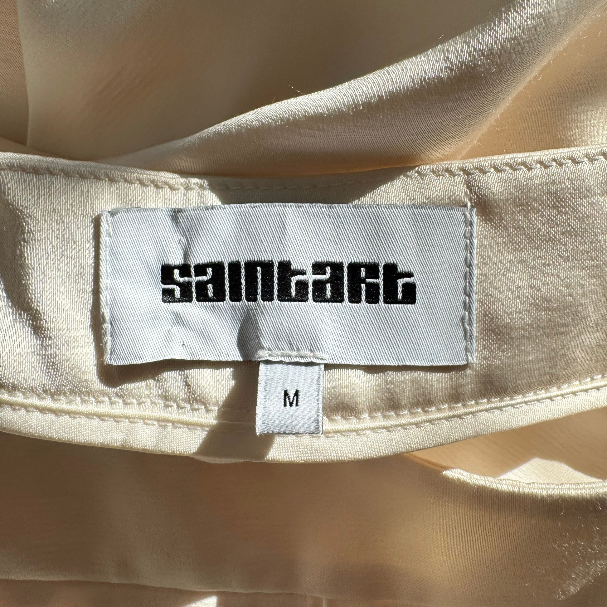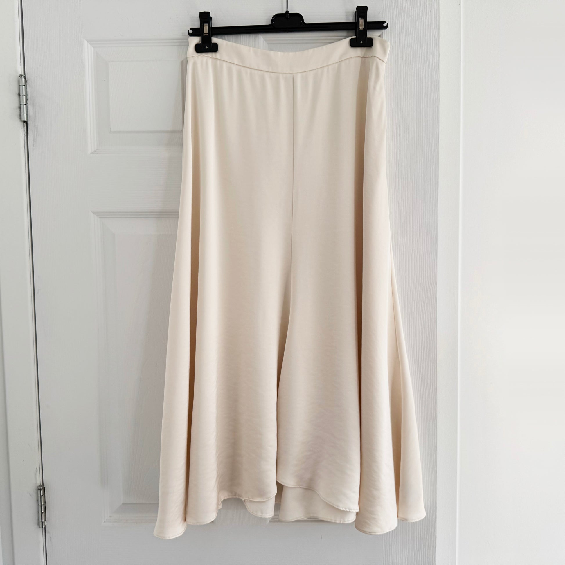 Saint Art "Frieda" Skirt in Ivory, size Medium. The Frieda A-Line Skirt in Ivory is a versatile and elegant option for any occasion. Made with heavy charmeuse fabric, this midi skirt is durable and easy to care for with its machine washability. Pair it with the Danielle bustier top for a chic and put-together look. 34 inches in length. The waistband measures 16 inches flat, and since it's ivory satin, would be best worn kinda loose ish? 64% viscose, 36% polyester. In excellent condition. Currently selling for $285CAD, and selling here for $115CAD!