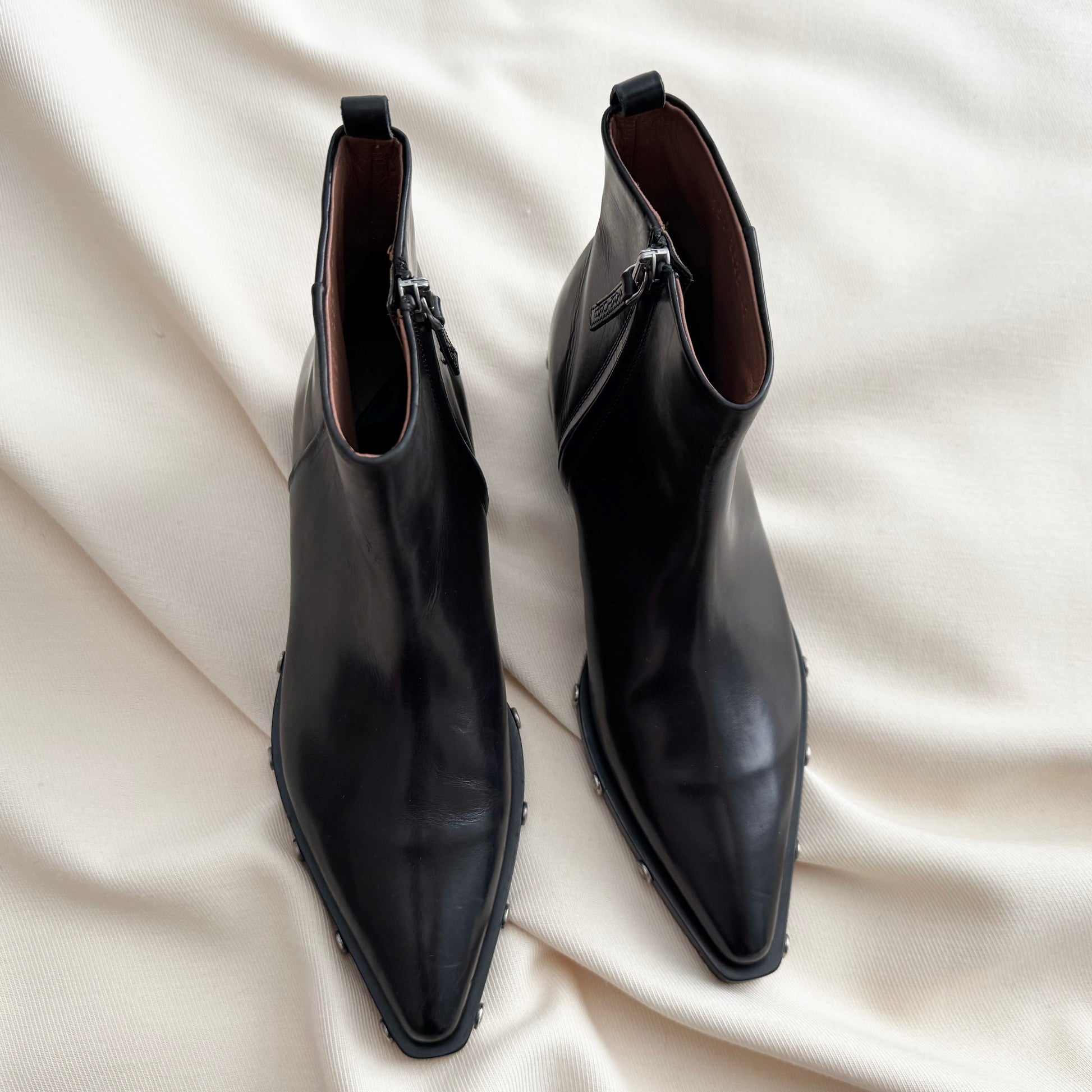 Sartore Pointed Toe Boots with Studded Sole in Black, size 37. Fits true to size. A perfect boot for pairing with anything from loose long wide leg pants, to a little pleated skirt! Worn once. Does not come with original box or dustbags though. Originally around $900-1000CAD, and selling here for $325CAD!