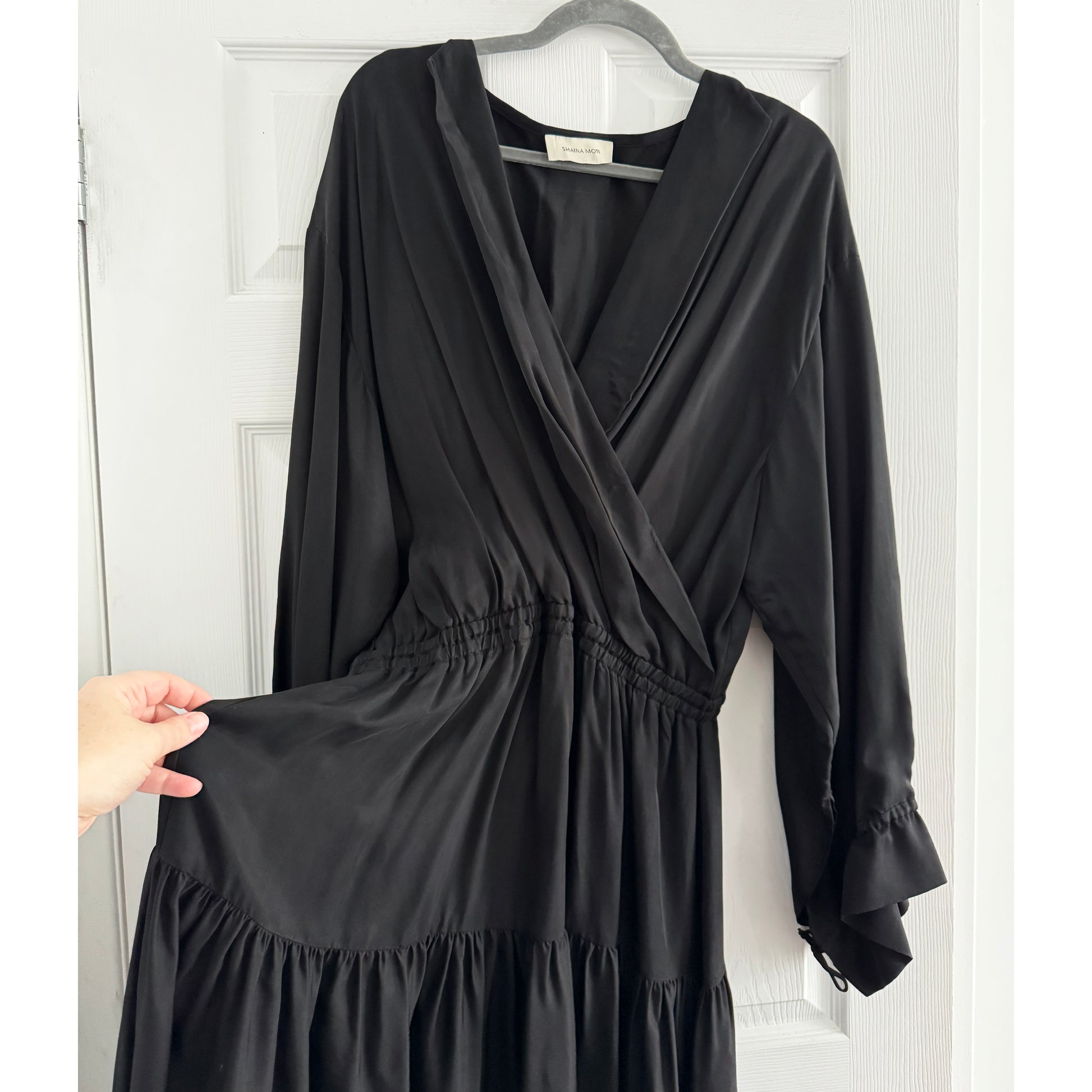 Shaina Mote "Almeria" Dress in Black, size XXL. Fits true to size. A lovely and fluid dress with a v-neck and an elasticated waistband - this LA based designer makes timeless things with a soft aesthetic - and this is a great example of her work. It's versatile (in the sense that it works for both daytime and evening) and works in most seasons (I think maybe I'd choose wool when it's REALLY cold, and maybe sleeveless when it's REALLY hot - but this works for most moments outside that. Style it with anything from boots to sandals. 100% cupro. Worn only a few times and in excellent condition. Originally $600CAD, and selling here for $145CAD!