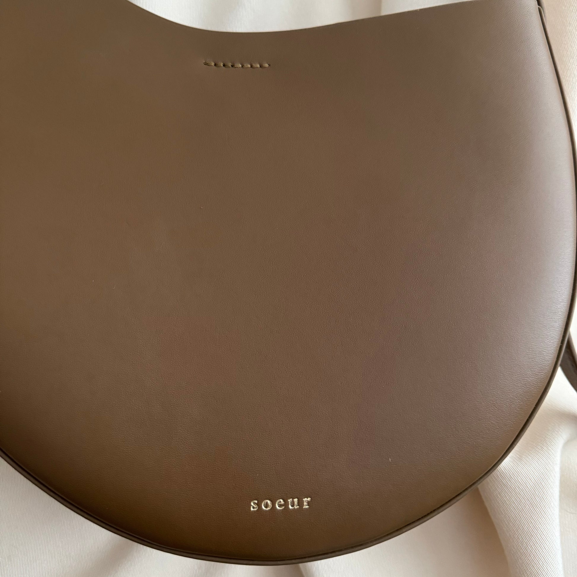 Soeur "Winona" Bag in Tobacco. This architectural leather shoulder bag has such a beautiful modern, asymmetric rounded shape - perfectly accented by small gold-tone hardware accents. It features an adjustable leather strap with collar buttons, and magnetic closure. I love the removable lambskin leather pouch inside the bag (so convenient for errands in a car - grab the inner pouch if you don't need the whole bag!) - it's fastened in by a snap. Lambskin leather lining. Made with LWG leather (Leather Working Group (LWG), is an international organization focused on promoting responsible environmental practices in the leather industry. These tanneries must meet strict standards for environmental management, traceability, and ethical practices, ensuring that the leather is produced more sustainably.). Height (maximum) 38 cm, width 31 cm, depth (base) 8 cm. Used less than a handful of times and in very good condition. Does not come with original dustbag. Originally retailed for $760CAD, and selling here for $325CAD!