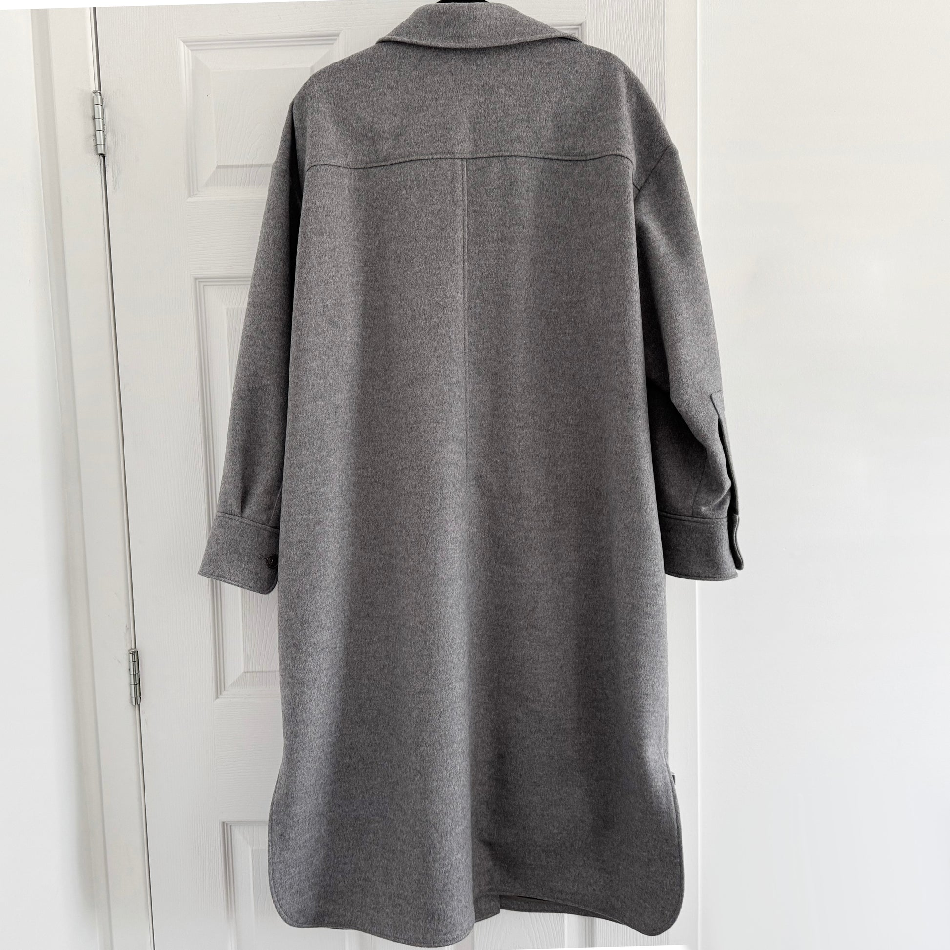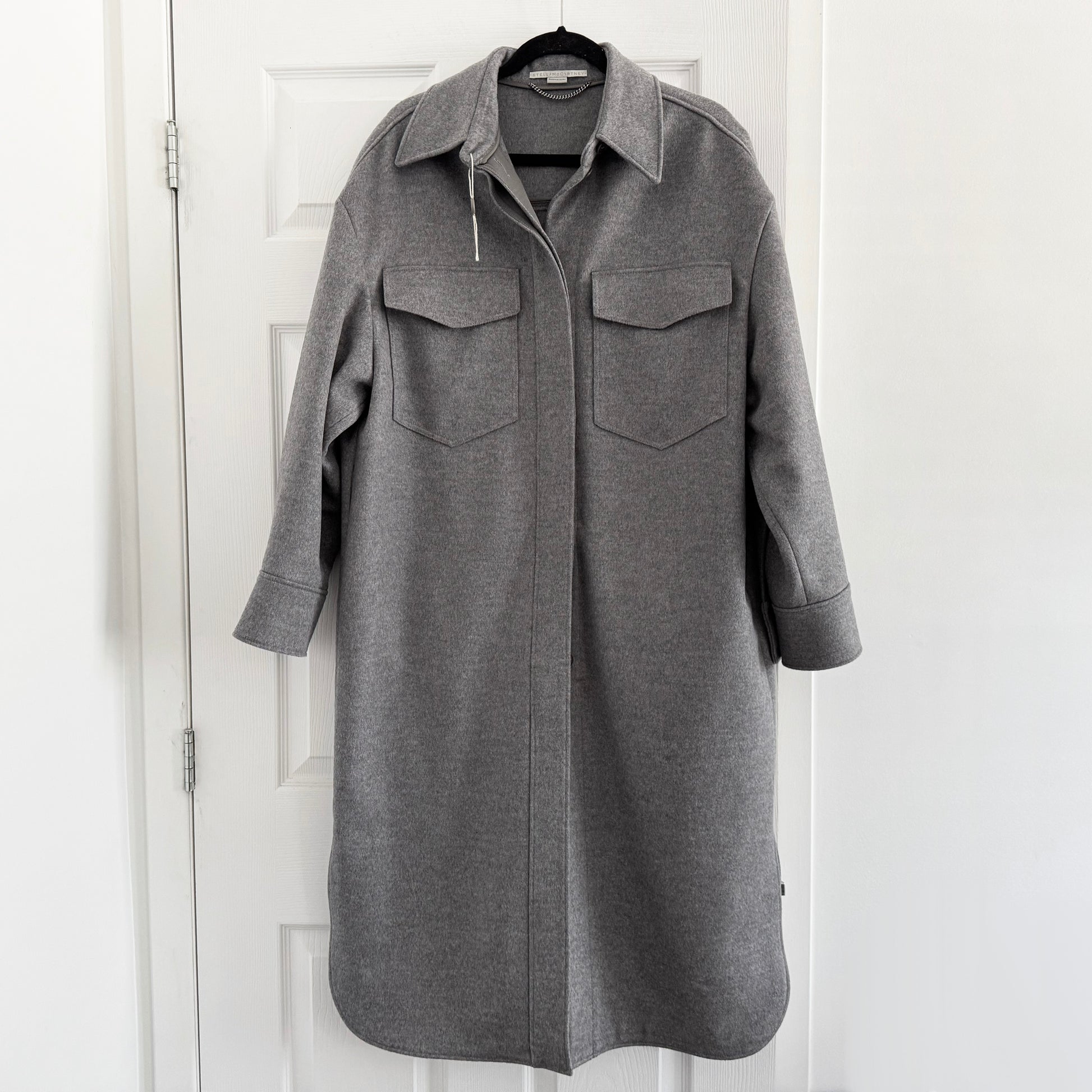 Stella McCartney "Linda" Coat in Grey, size 42IT (technically this is like a size 6 ish but this is oversize - works for anyone in the M/L range, depending on how you want it to fit). Soft as a baby's butt - I have to admit I am surprised it's not cashmere - you can feel how good the quality of the wool is the second you touch it. Luxury casual like this covers a lot of territory - and if you live in a more casual place or have a more casual lifestyle, it covers ALL of the territory, but - crucially - still feels special. I love the way that the sides are finished - the rounded edges and the side slits allow for ease of movement getting in and out of the car, etc. Unlined. Button front closure. 46 inches in length. 26 inches armpit to armpit, and across the hips as well. 100% wool. New without tags - no signs of wear. Originally $2795CAD, and selling here for $995CAD!