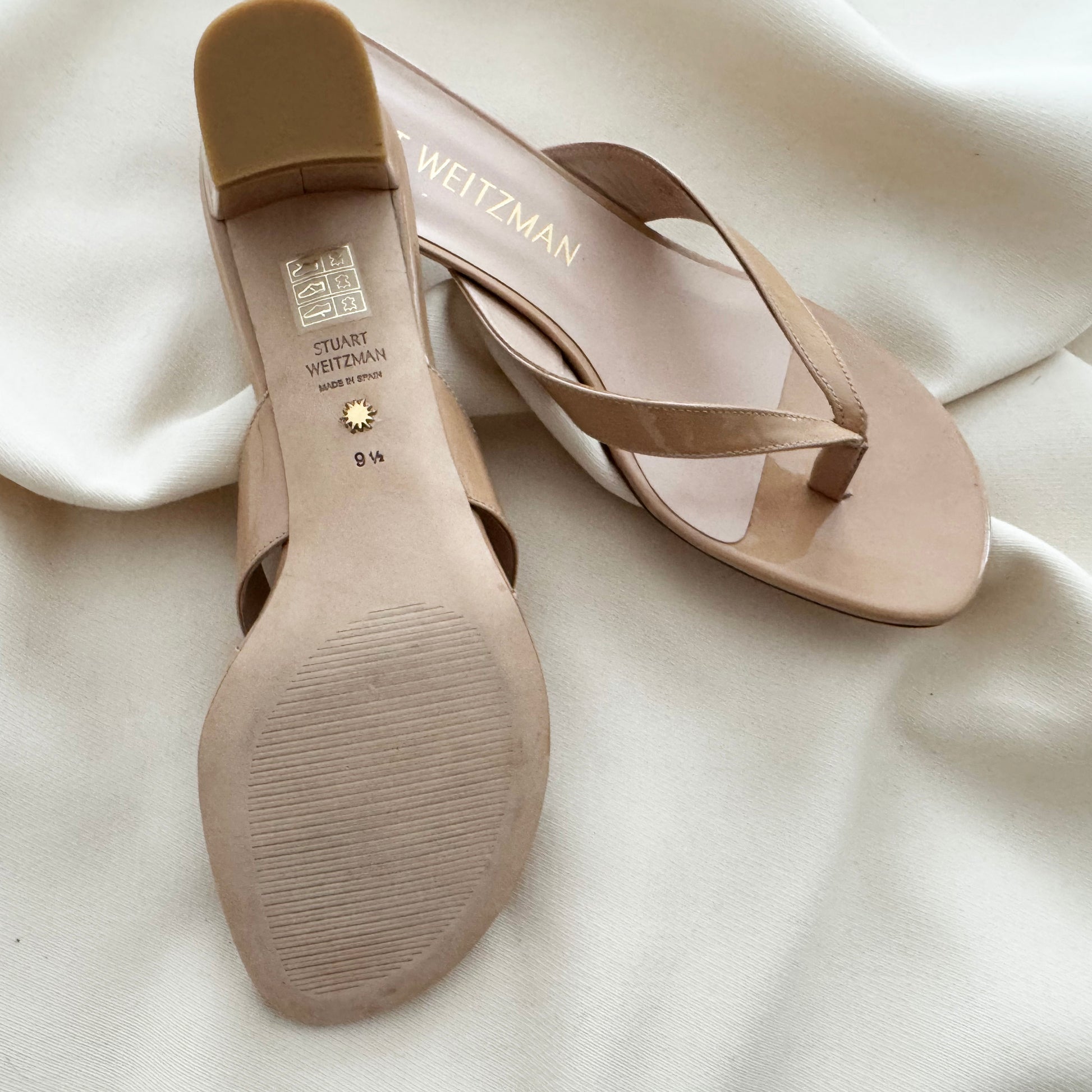 Stuart Weitzman "Brigida" 50mm Thong Sandals in Nude, size 9.5. Fits true to size. Could be a really handy bridal backup shoe - when you need something with a lower heel, that might even be okay on grass? These could be a lifesaver! In excellent condition - tried on, but like not really worn, worn. Does not come with original box. Originally $600CAD, and selling here for $135CAD!