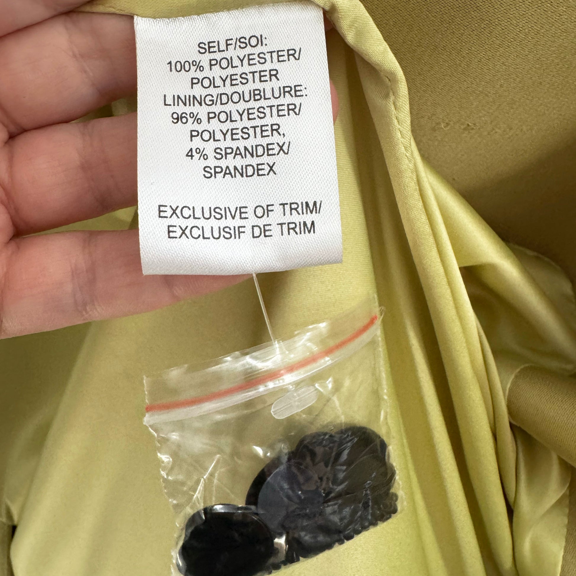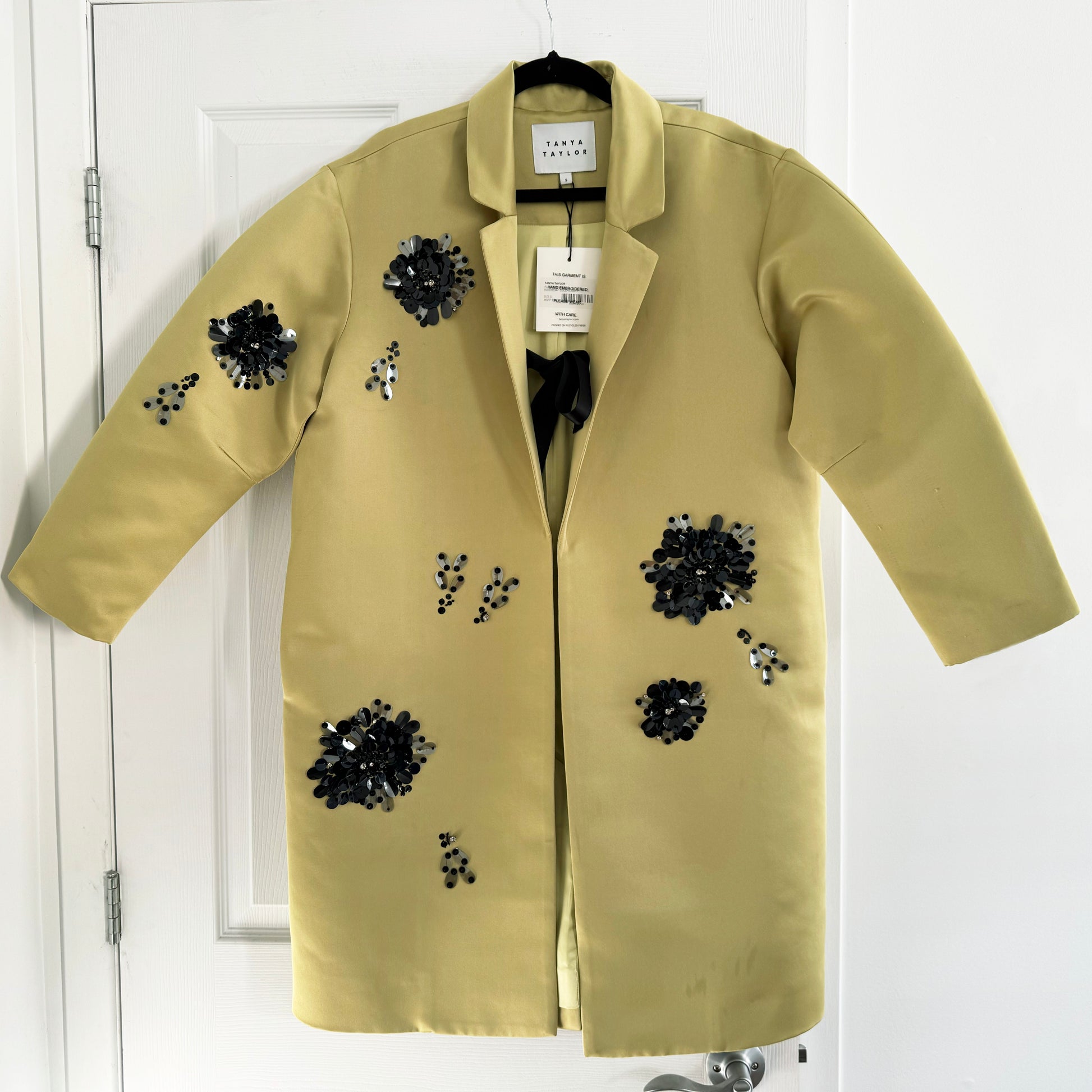 Tanya Taylor "Alessandra" Satin Coat in Chartreuse, Size Small. Fits true to size for an oversize fit. Brand new with tags (but not in perfect condition). Such a beautiful evening coat!! It sort of reminds me of Dries, but different! Pair with denim if you're elevating a casual outfit, and with a velvet pant or a satin for a more formal evening. Dries girlies with go more maximalist, as he inspires us to do, with something like a plaid pant and a floral blouse? 38 inches in length. 22.5 inches armpit to armpit, and cut fairly straight down. 100% polyester. Some snags on the sleeves, but in excellent condition otherwise. Originally $1775CAD ($1295USD), and priced a little lower to account for the damage, at $395CAD!