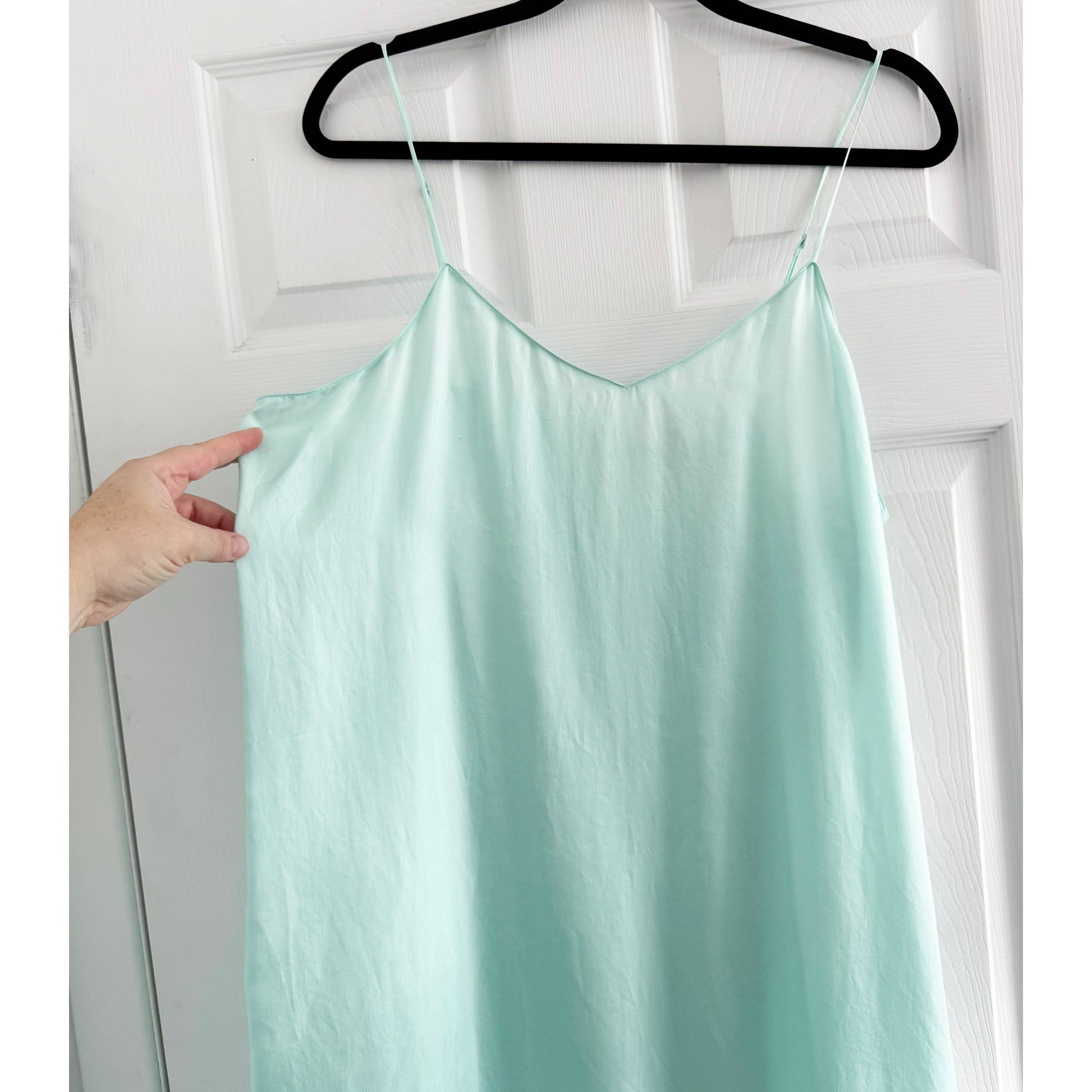 Tibi Cami Slipdress in Mint, size 14. Fits true to size. Made from a drapey lightweight silky twill fabric that's perfect for the warmer temps. Dress it up or down, layer it to your hearts content, but DEFINITELY have fun with the colour!! Mix it with anything from soft neutrals to bold colours like burgundy, khaki, and browns! 21 inches armpit to armpit. Adjustable shoulder straps. 100% Acetate. In excellent condition - like new. I think this was never worn. Originally $595CAD, and selling here for $195CAD!